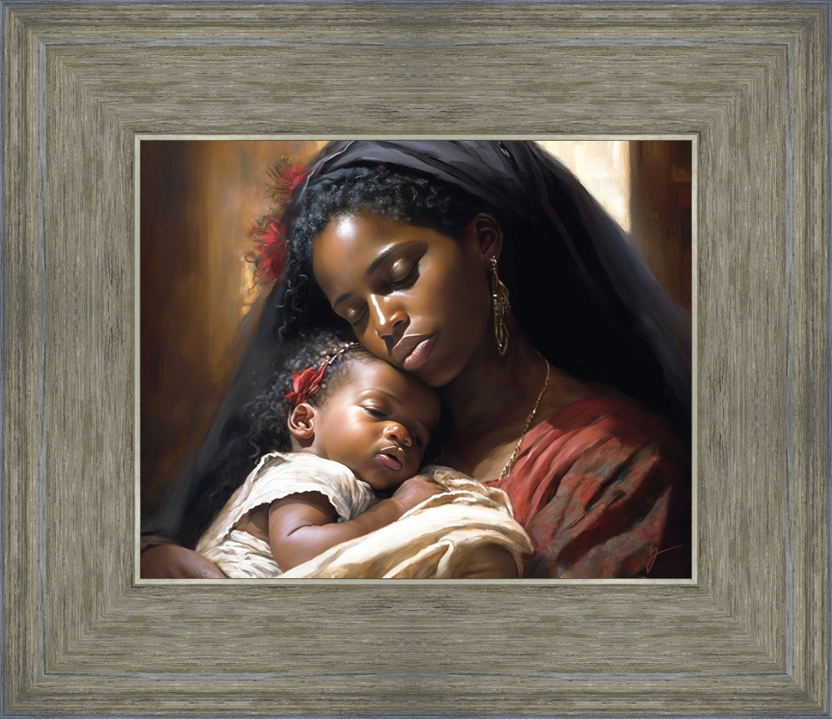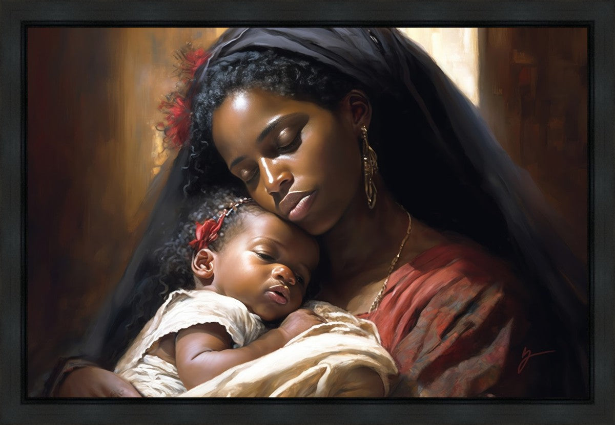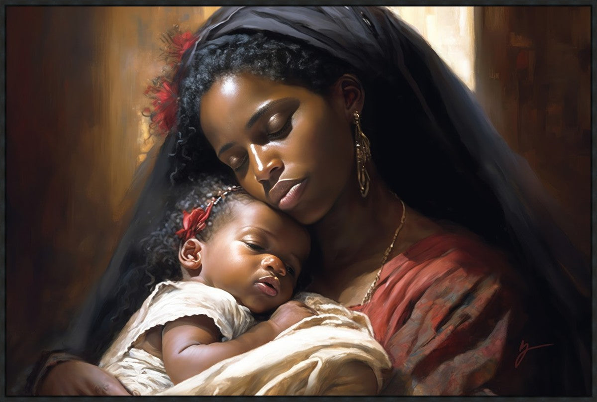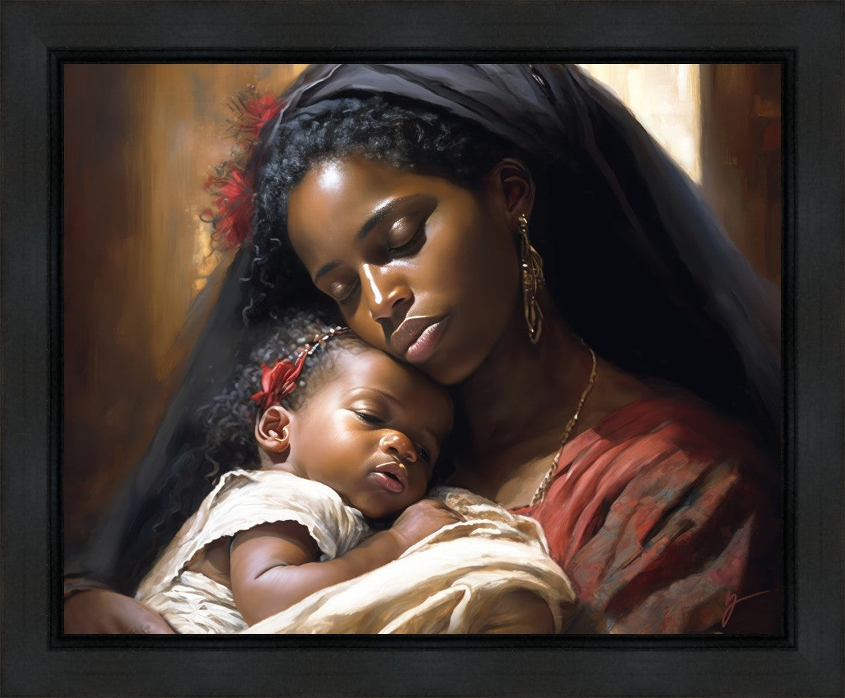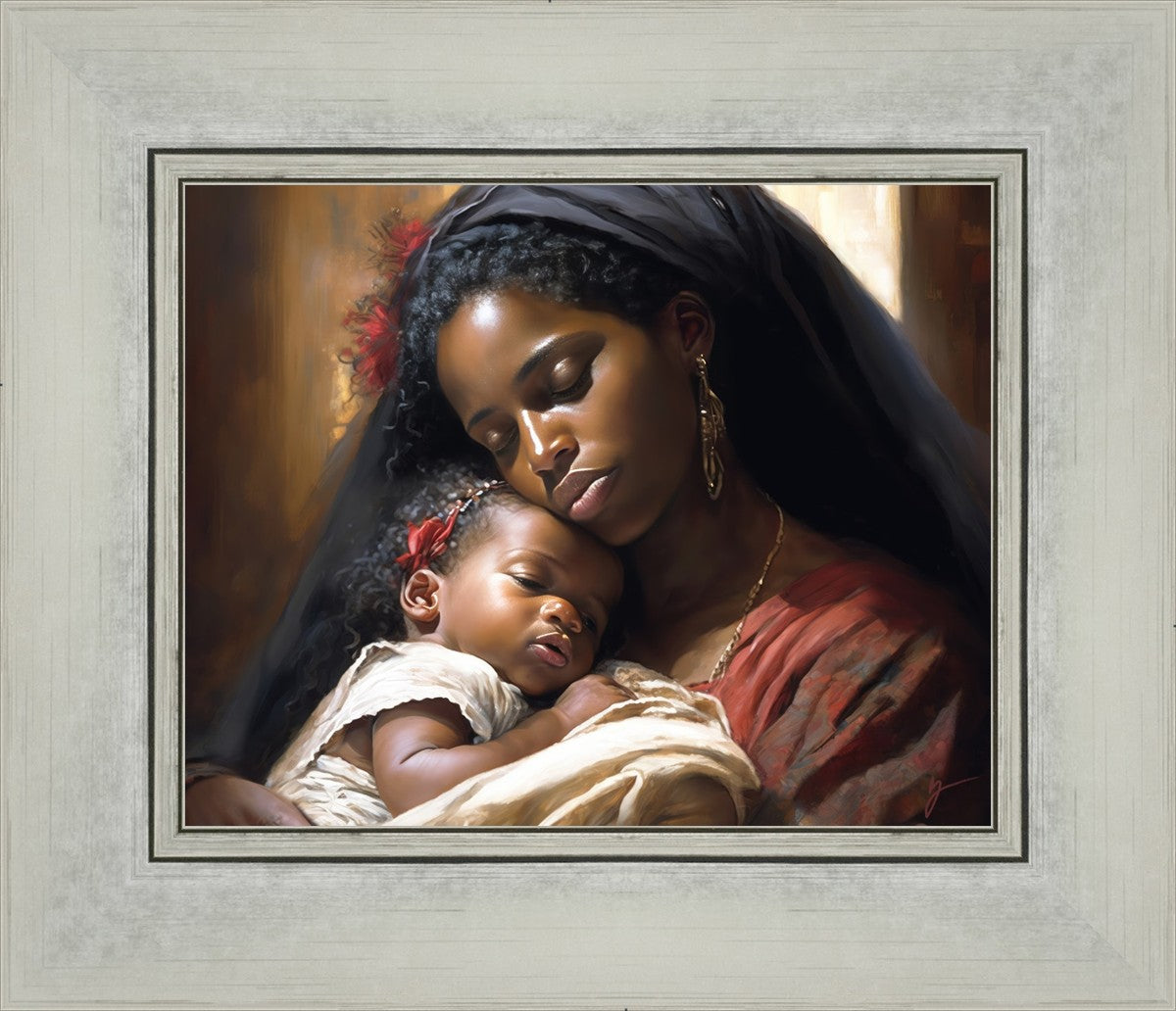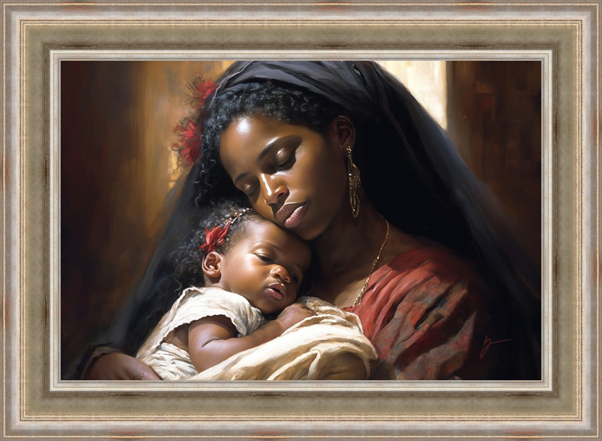 Sanctuary of Love" is a stunning painting that captures the beauty and tenderness of motherhood. In this artwork, a young mother holds her precious baby close to her chest, enveloping them both in a warm and protective embrace. The mother's eyes are closed, and a serene smile graces her face as she cherishes this moment with her child.