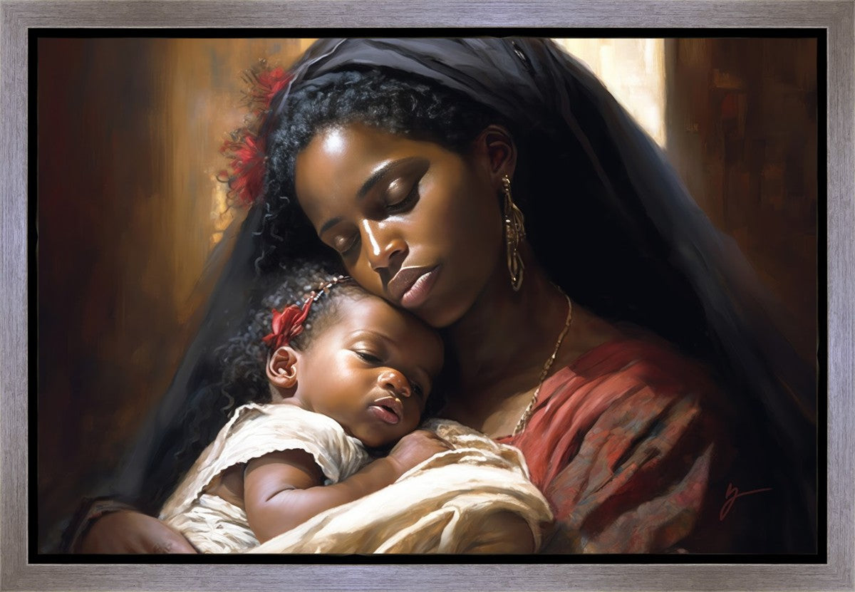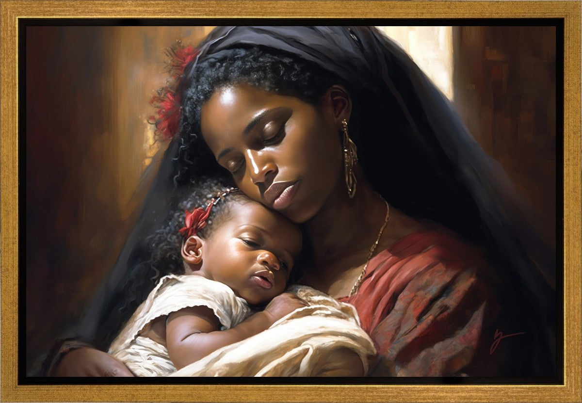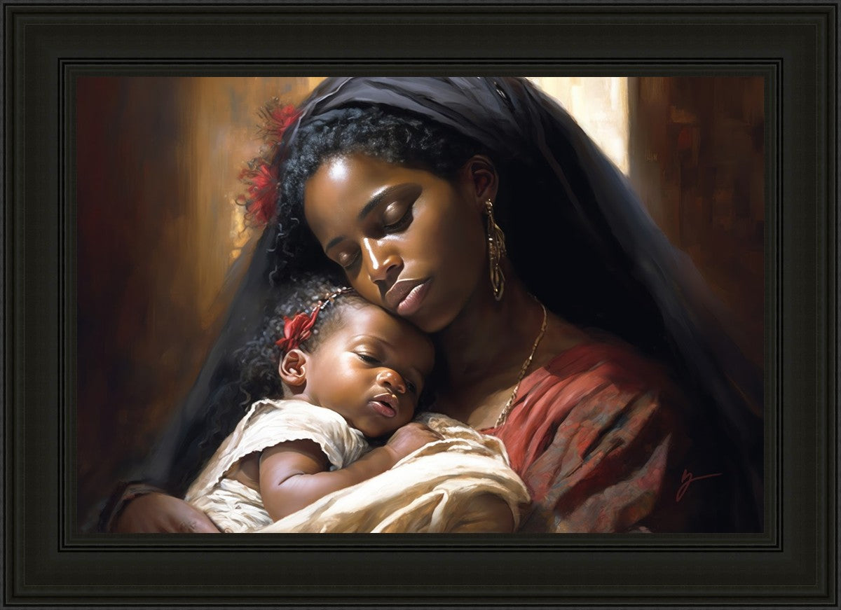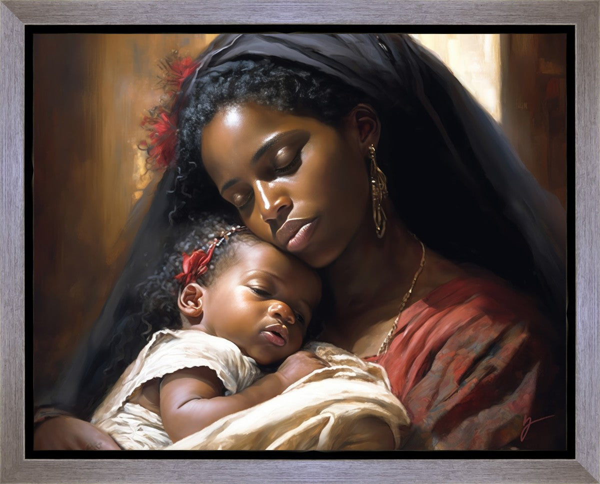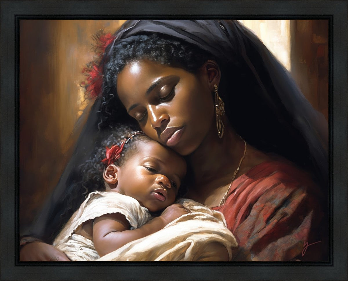 Sanctuary of Love" is a stunning painting that captures the beauty and tenderness of motherhood. In this artwork, a young mother holds her precious baby close to her chest, enveloping them both in a warm and protective embrace. The mother's eyes are closed, and a serene smile graces her face as she cherishes this moment with her child.
