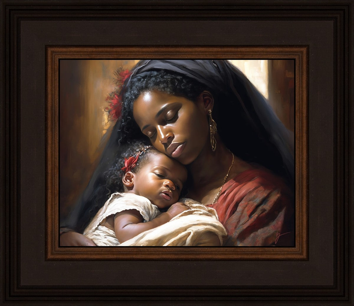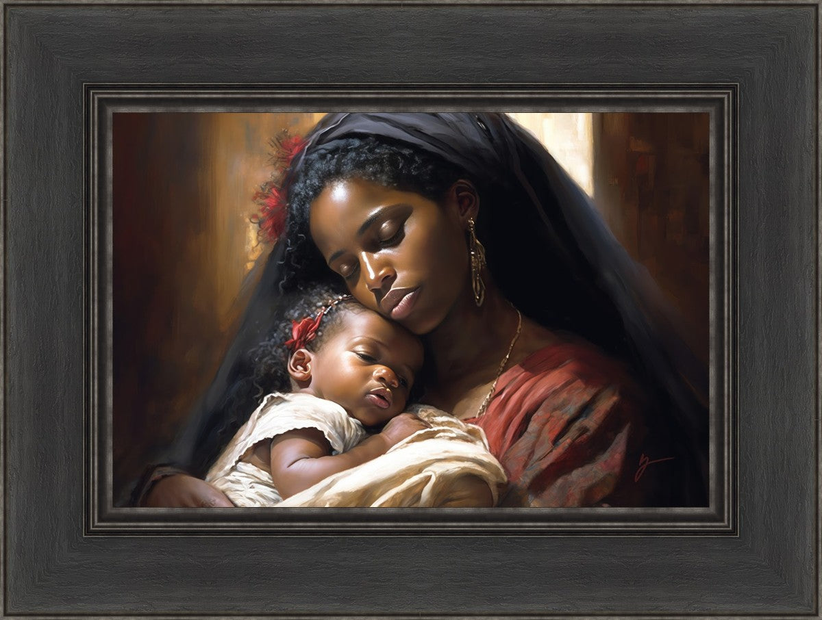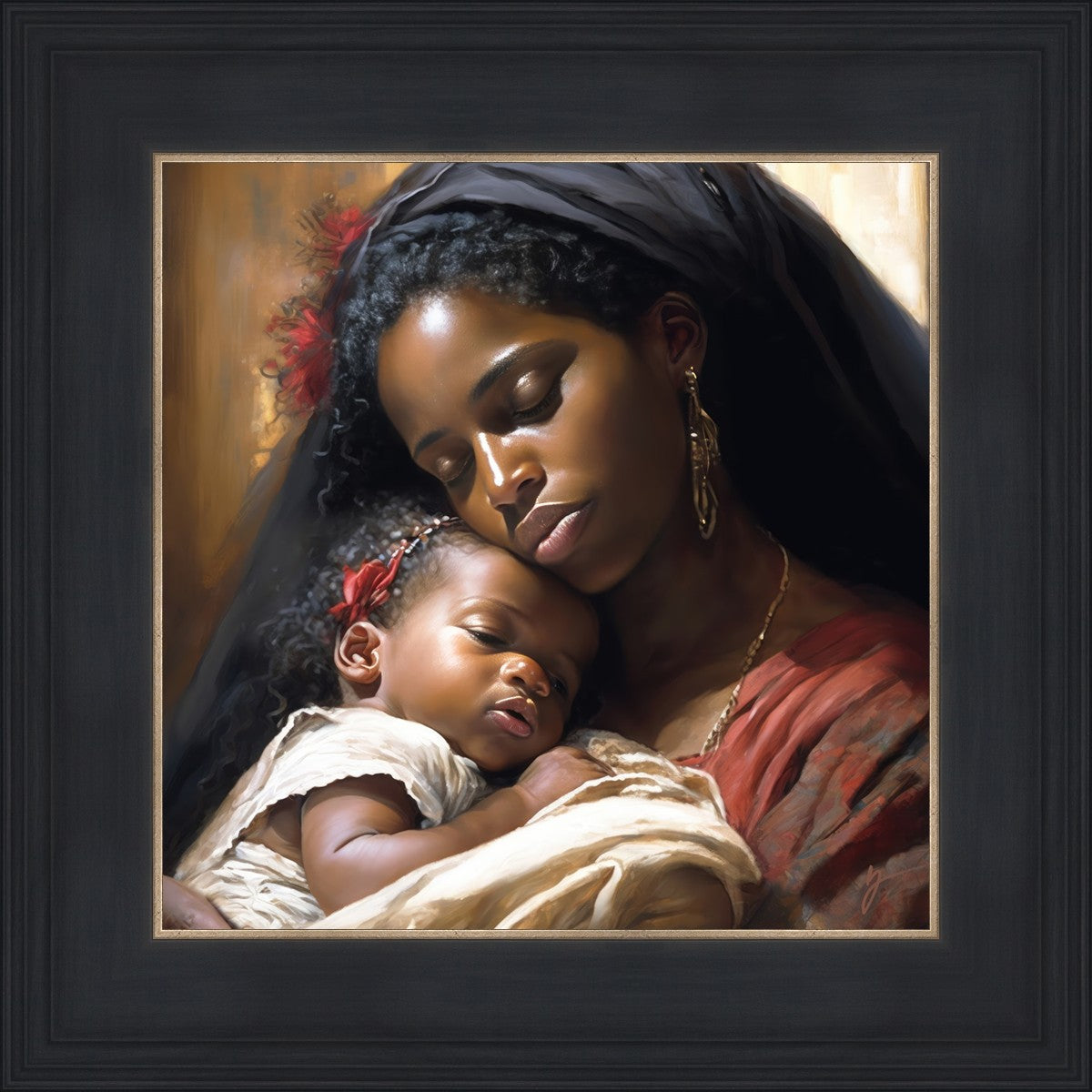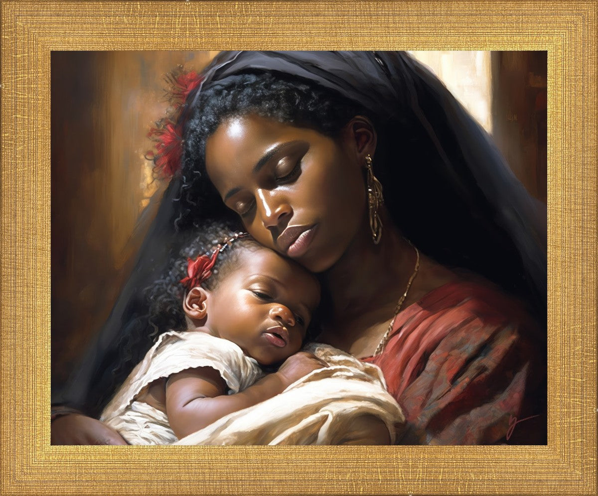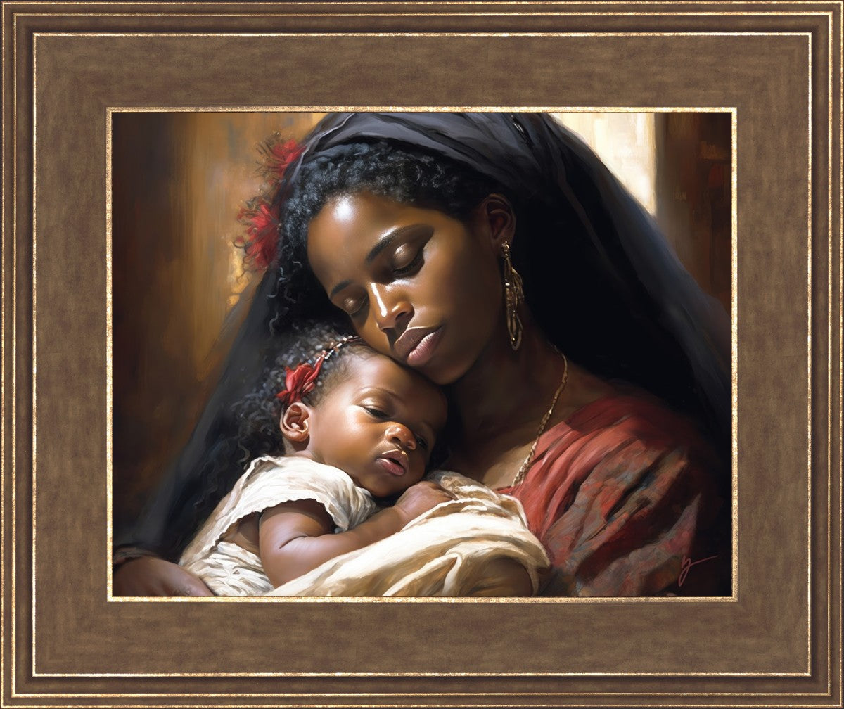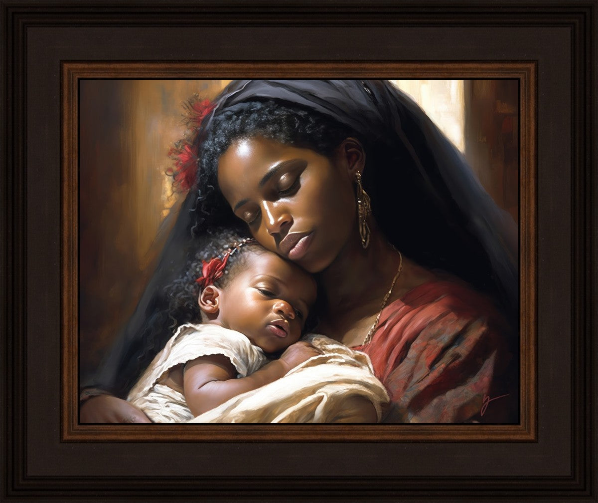 Sanctuary of Love" is a stunning painting that captures the beauty and tenderness of motherhood. In this artwork, a young mother holds her precious baby close to her chest, enveloping them both in a warm and protective embrace. The mother's eyes are closed, and a serene smile graces her face as she cherishes this moment with her child.
