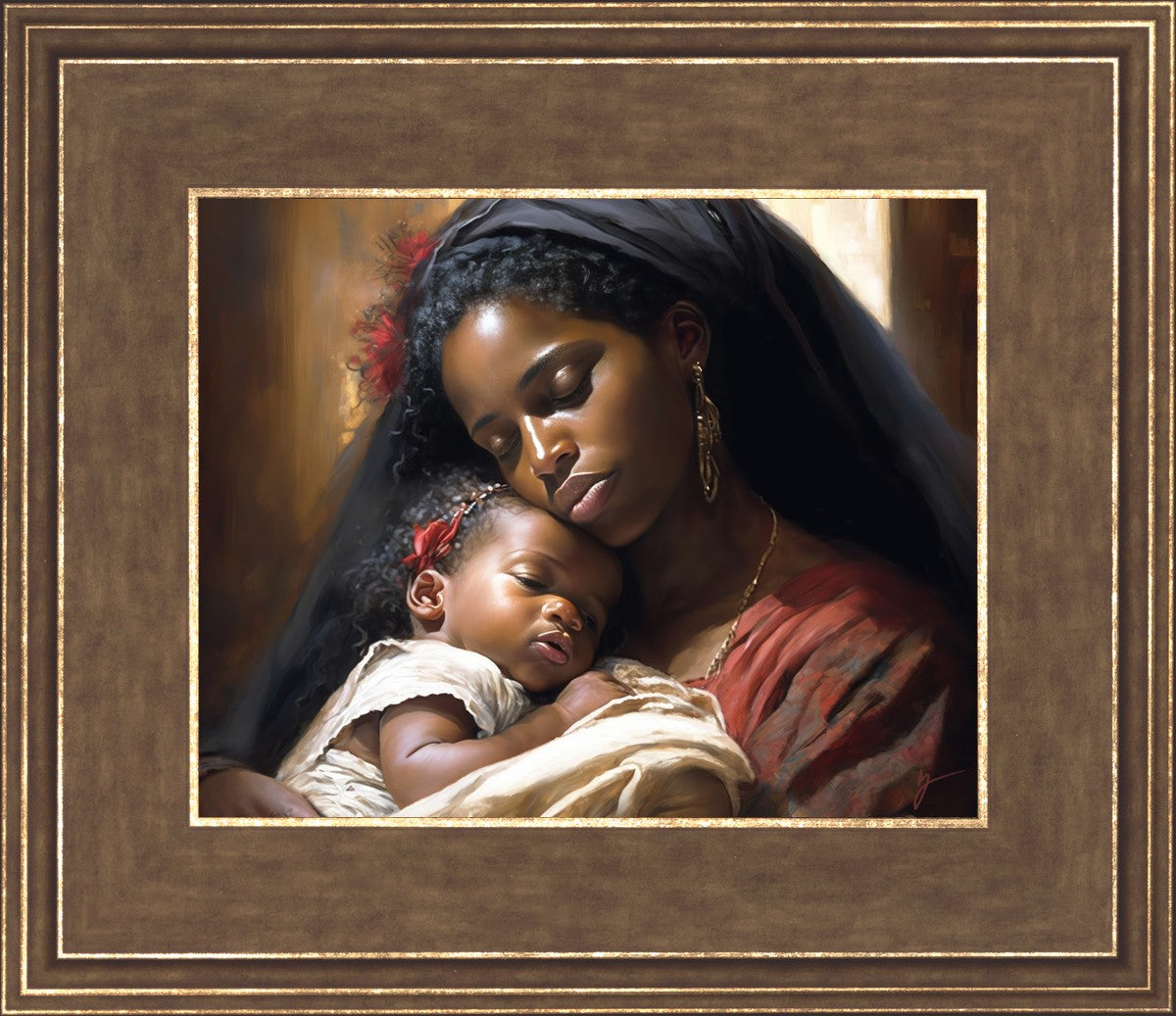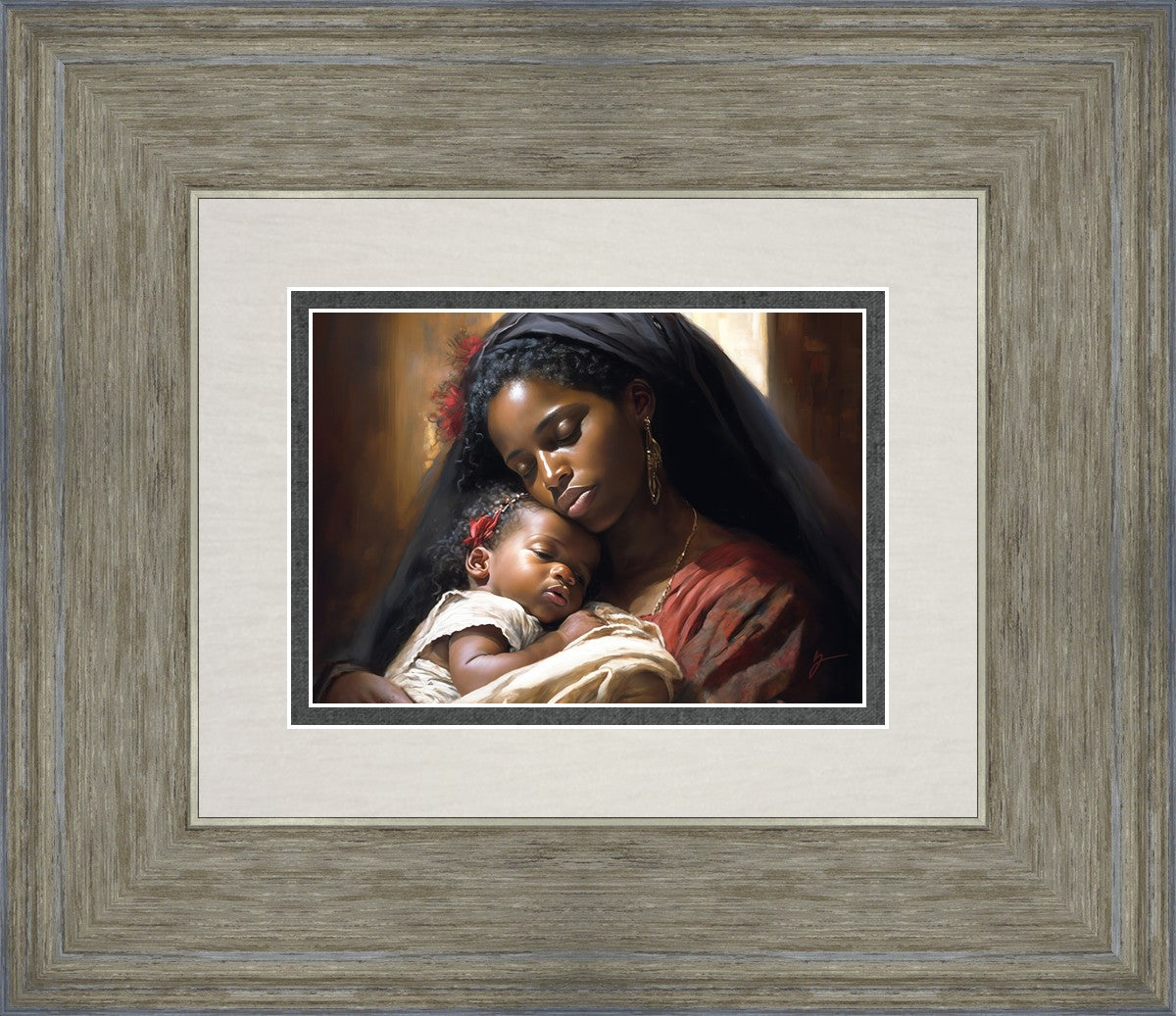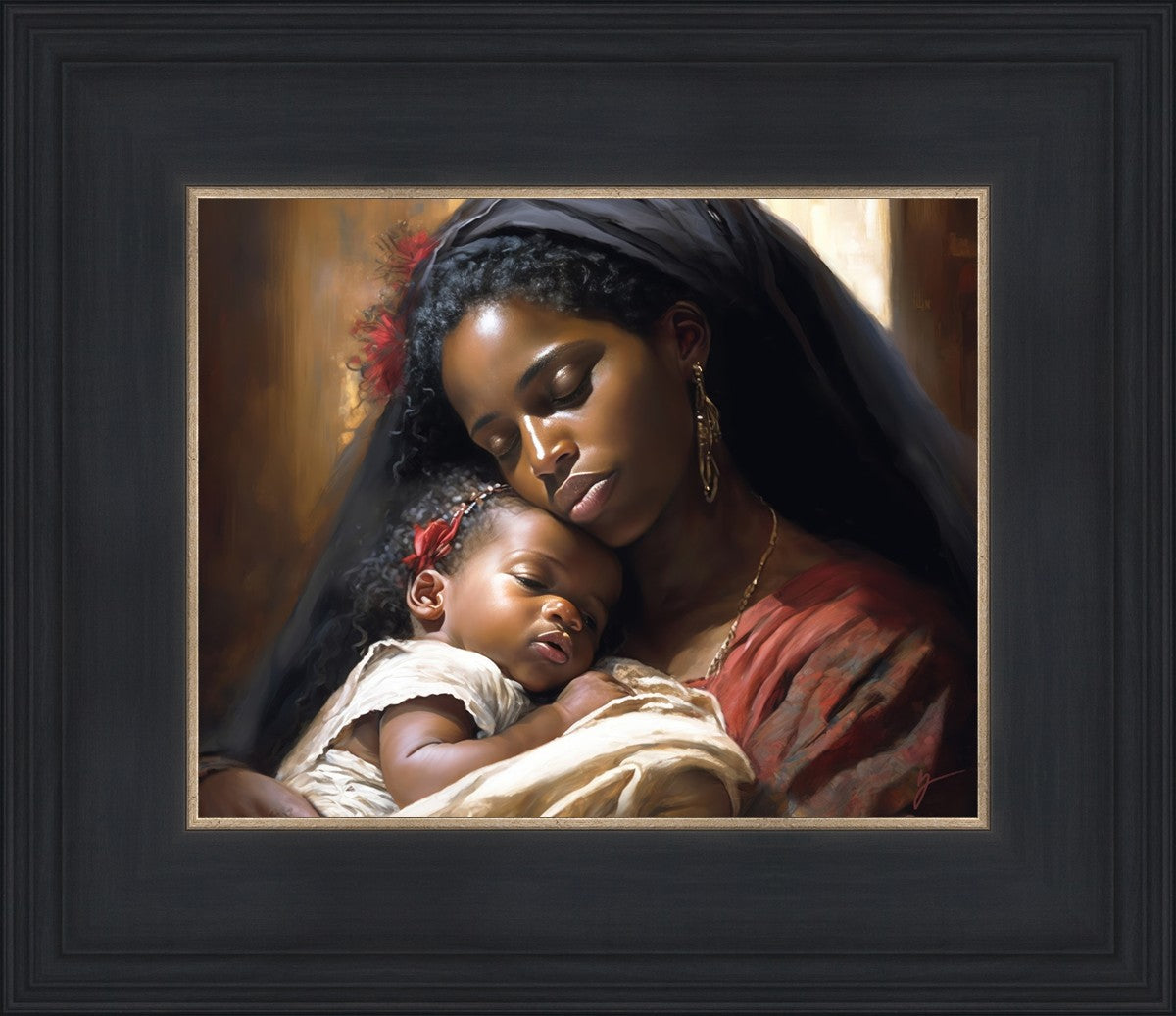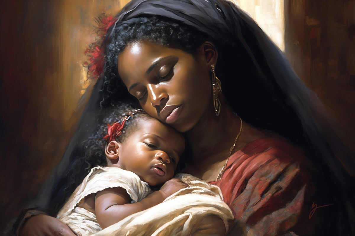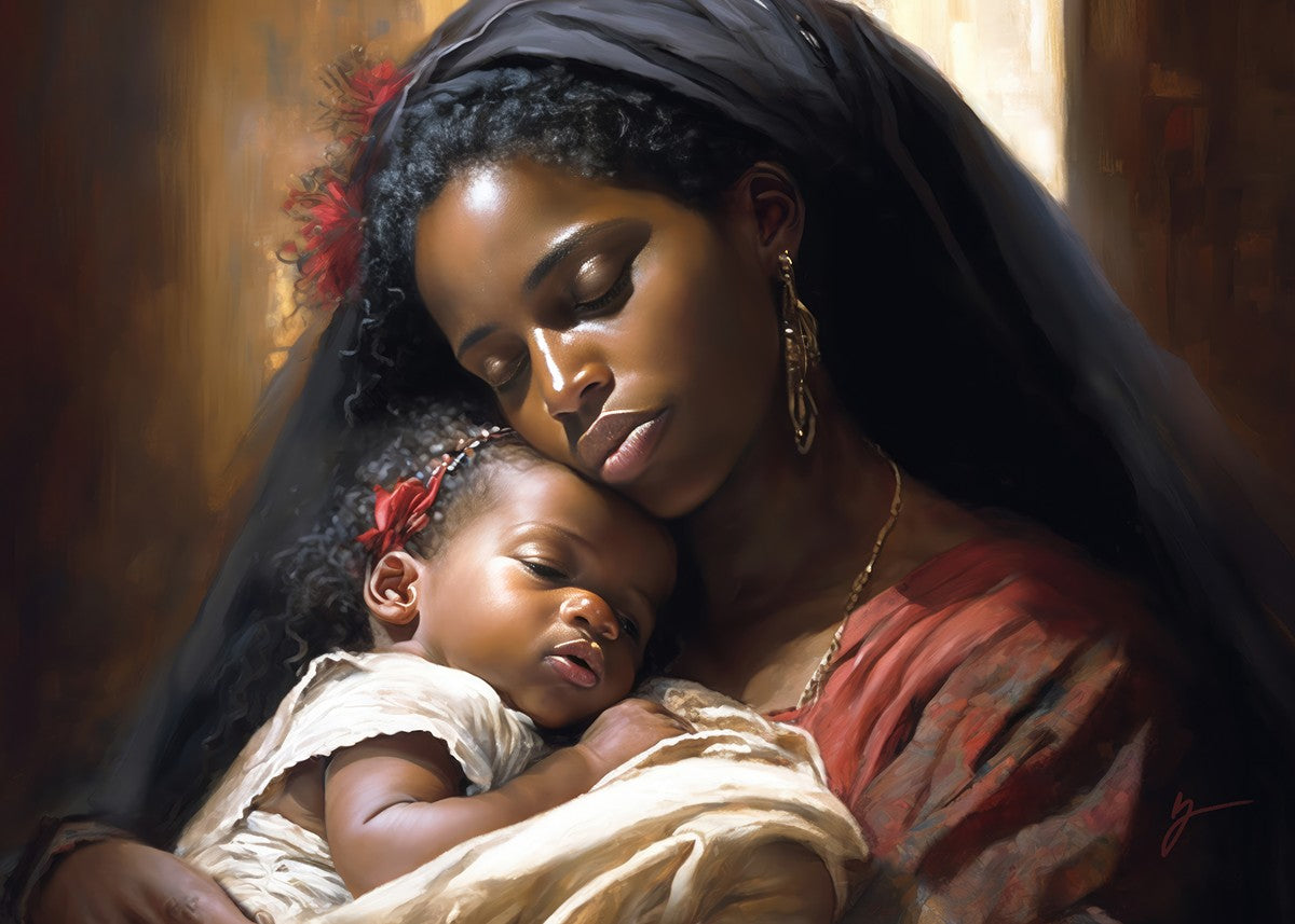 Sanctuary of Love" is a stunning painting that captures the beauty and tenderness of motherhood. In this artwork, a young mother holds her precious baby close to her chest, enveloping them both in a warm and protective embrace. The mother's eyes are closed, and a serene smile graces her face as she cherishes this moment with her child.