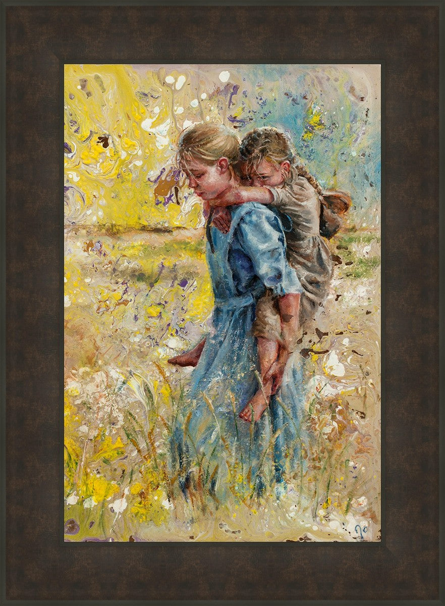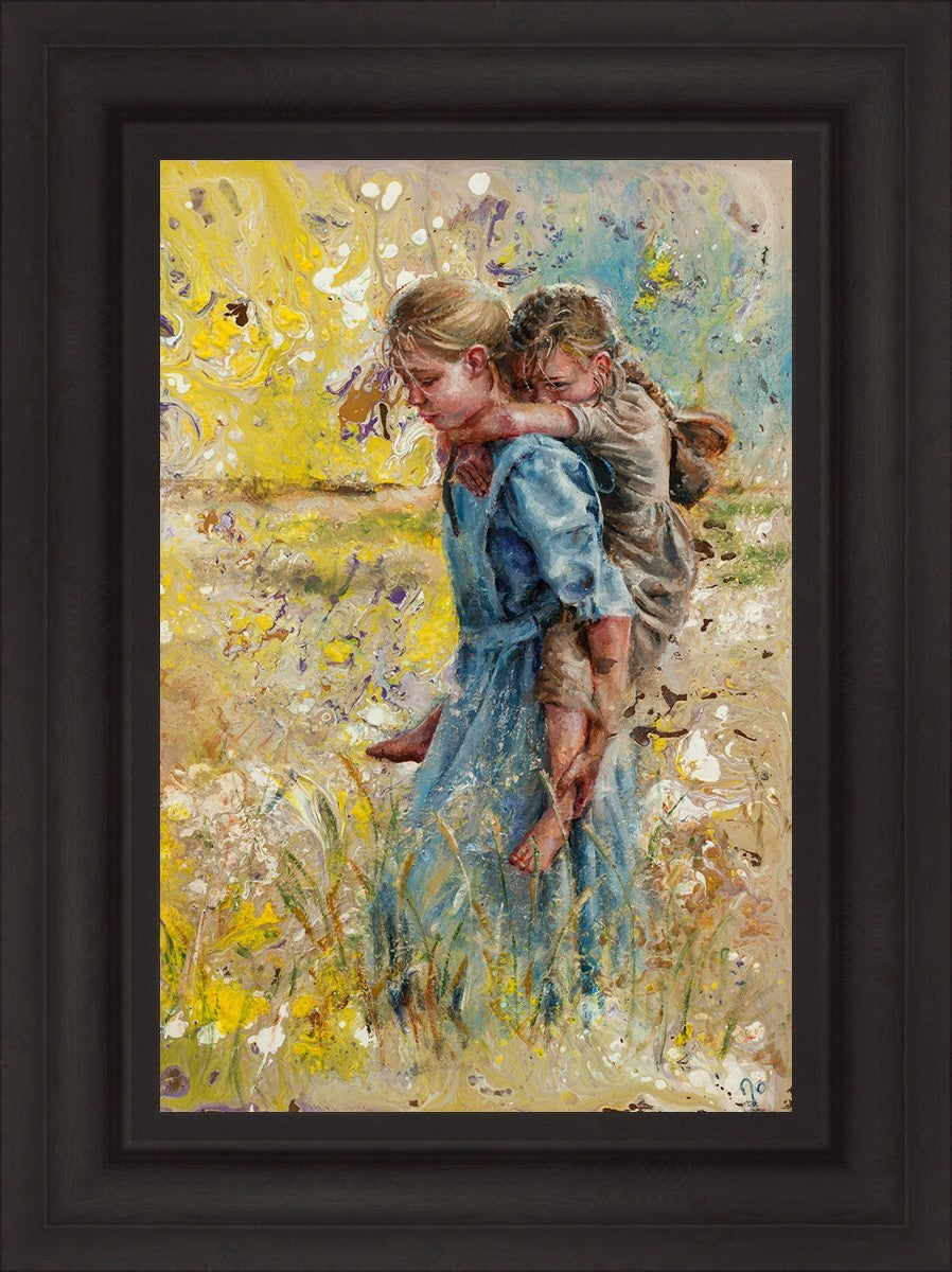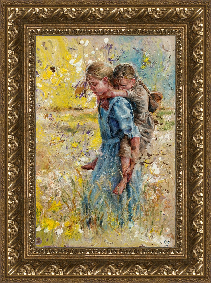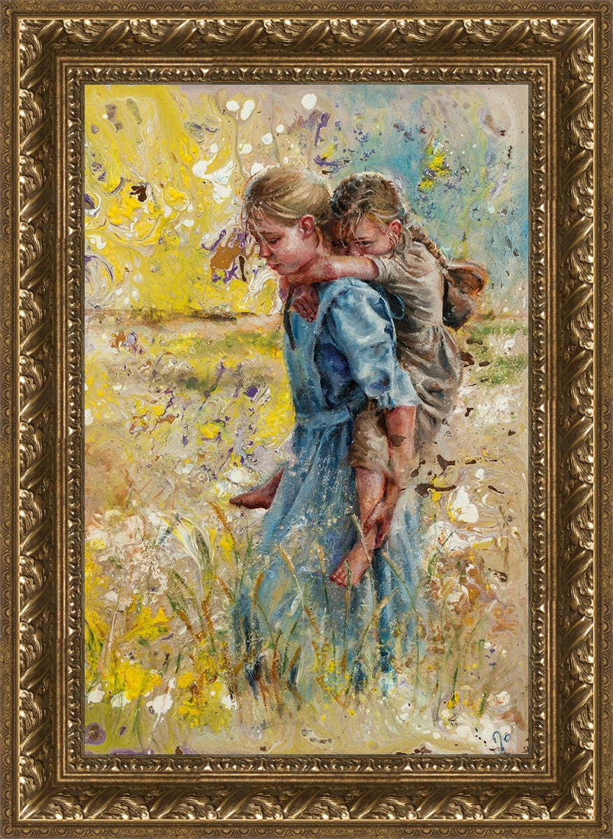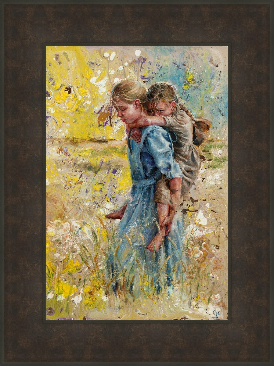 Painting of two pioneer sisters on the trail to Zion. The youngest, exhusted by the day'stravel is carried into camp by her older sister.