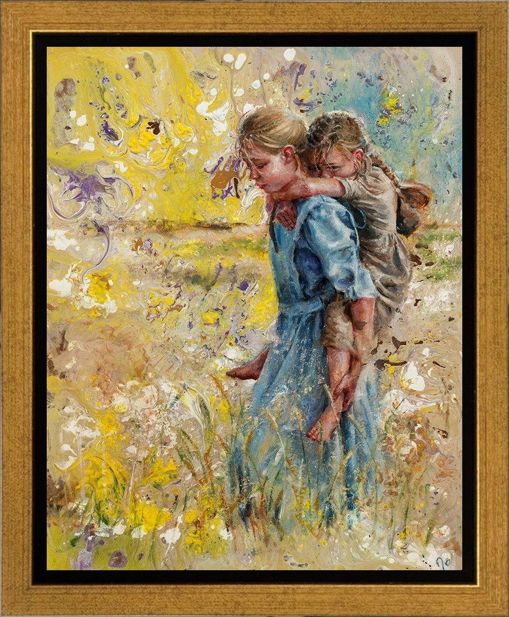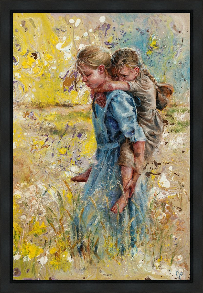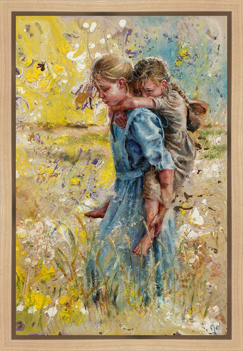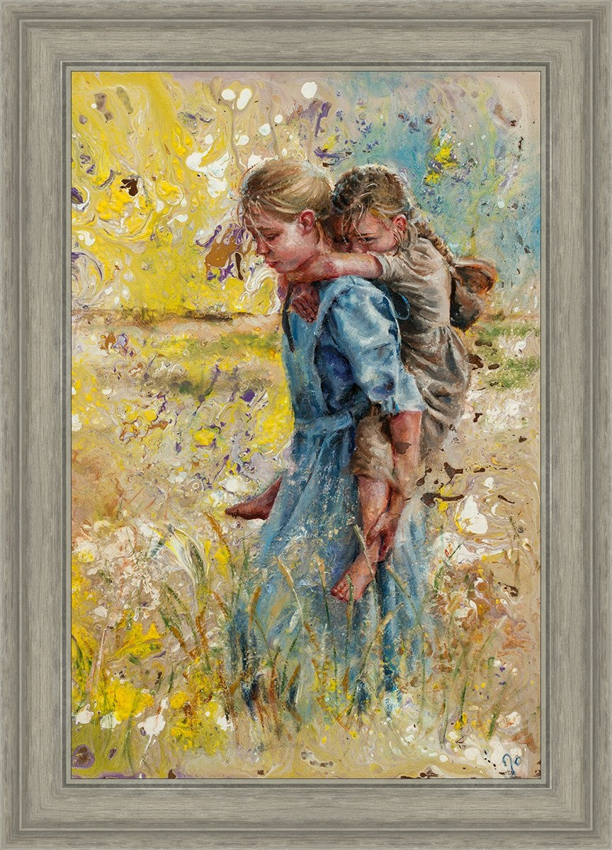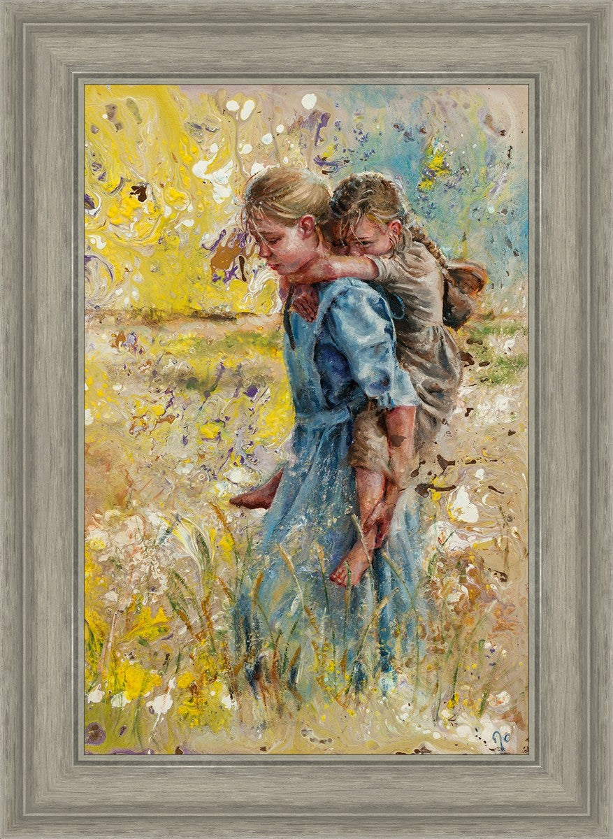 Painting of two pioneer sisters on the trail to Zion. The youngest, exhusted by the day'stravel is carried into camp by her older sister.