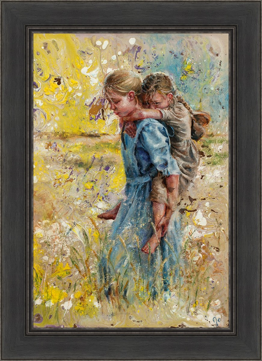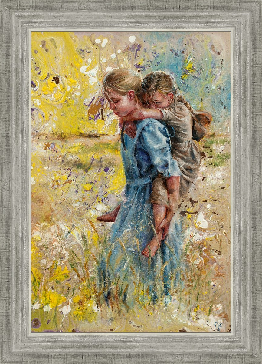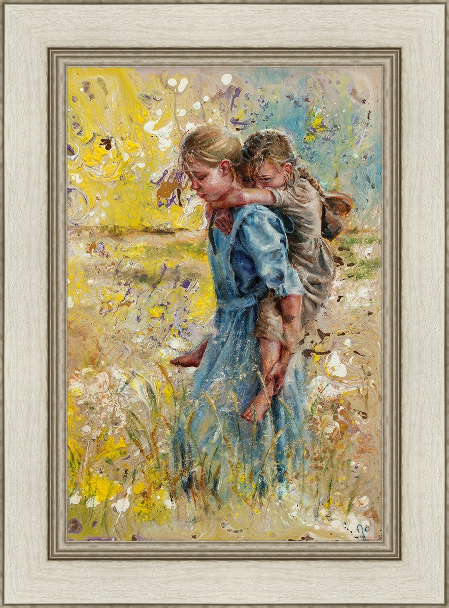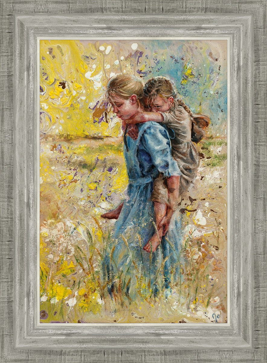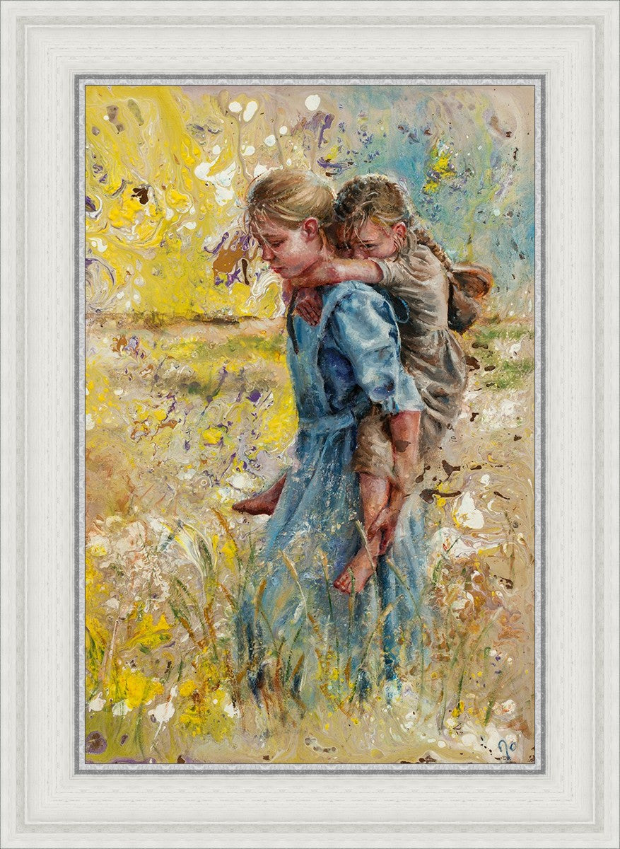 Painting of two pioneer sisters on the trail to Zion. The youngest, exhusted by the day'stravel is carried into camp by her older sister.