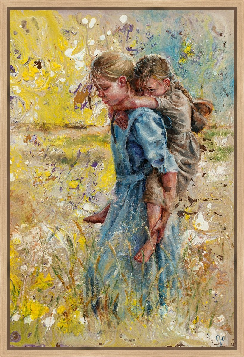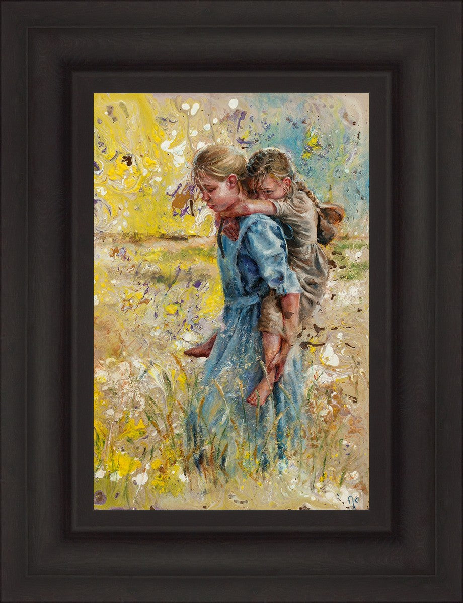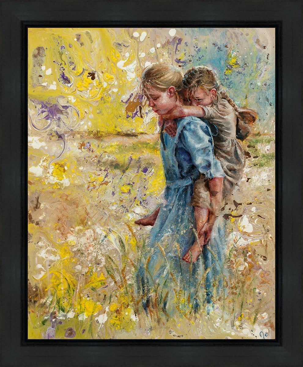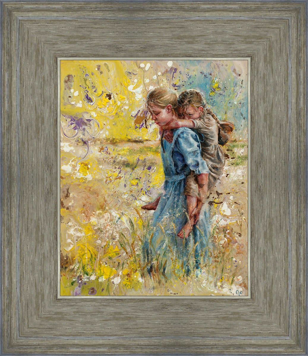 Painting of two pioneer sisters on the trail to Zion. The youngest, exhusted by the day'stravel is carried into camp by her older sister.