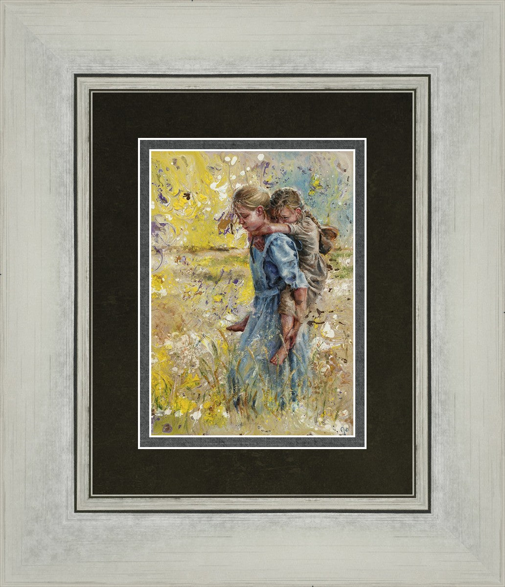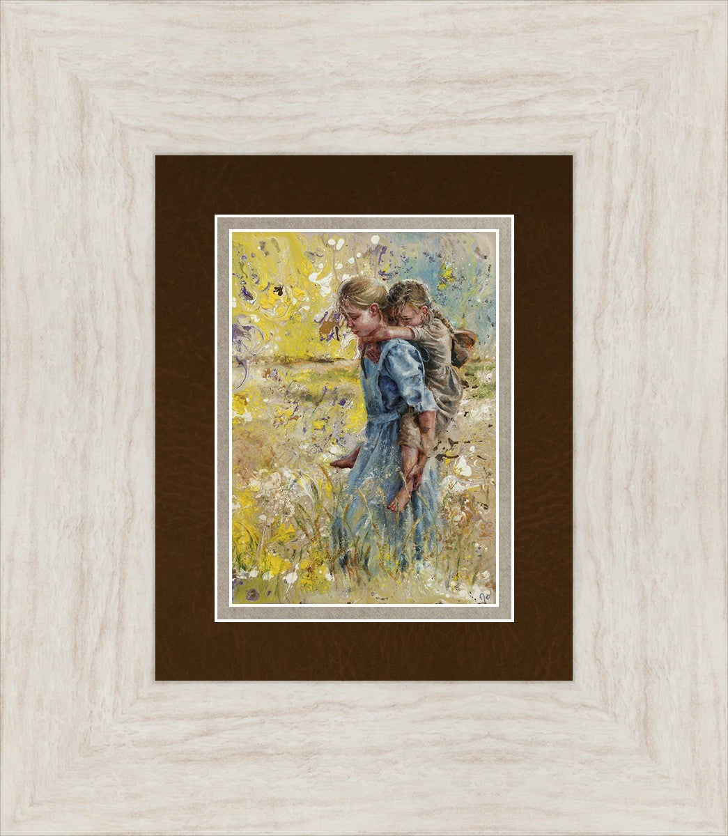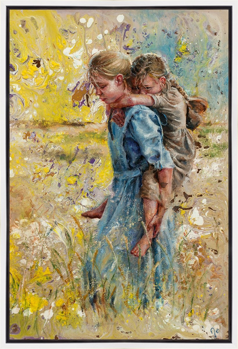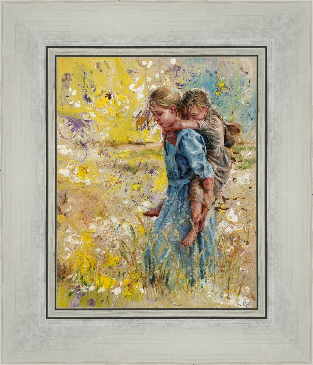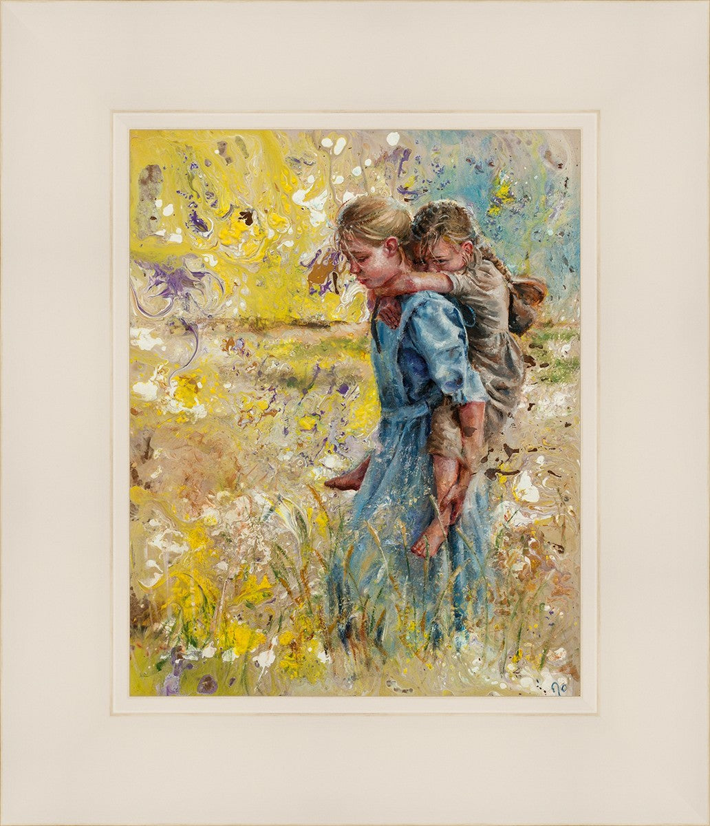 Painting of two pioneer sisters on the trail to Zion. The youngest, exhusted by the day'stravel is carried into camp by her older sister.