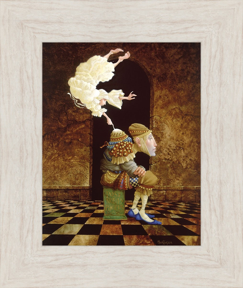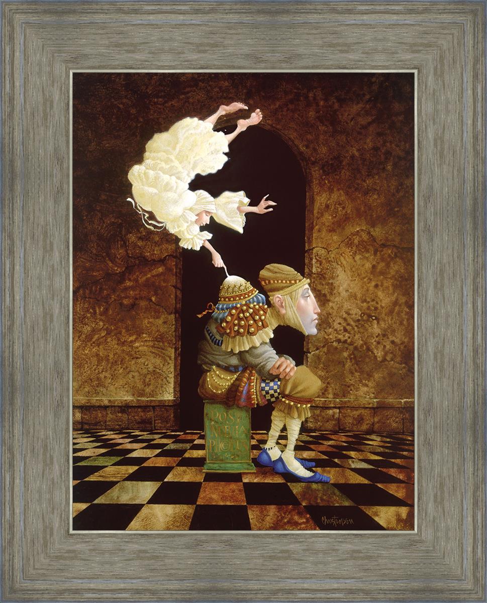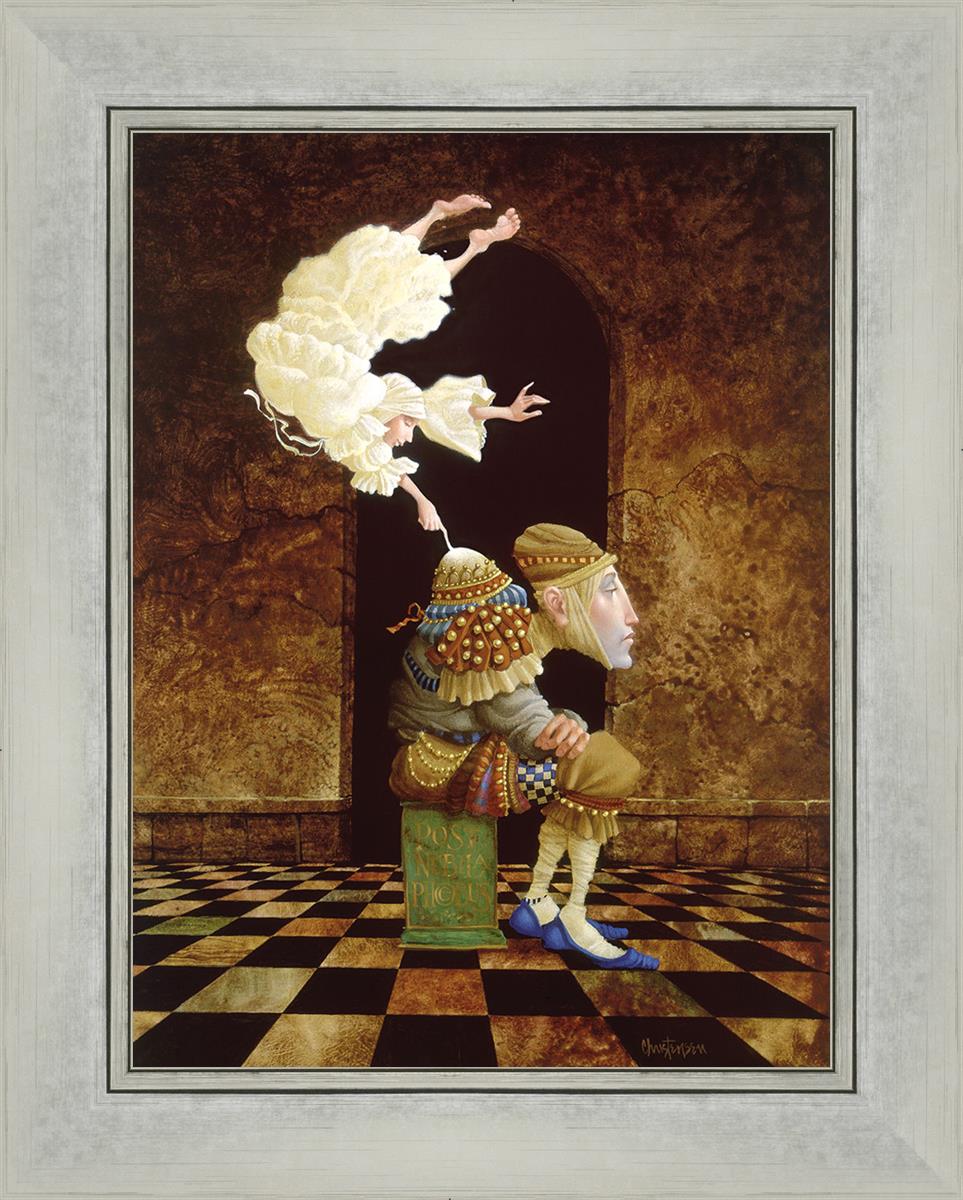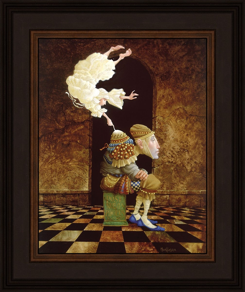 The hunch-backed figure sits on a podium on a checker board floor the checkerboard is the dark and light playing field of life. The hunch is not a deformity but a physical symbol of the burdens all humans bear. In life we experience hardships.