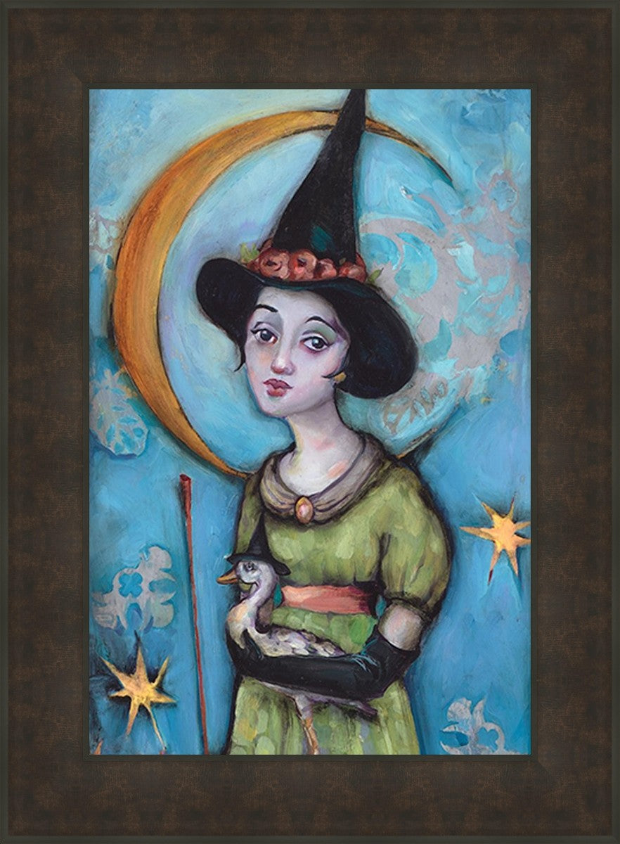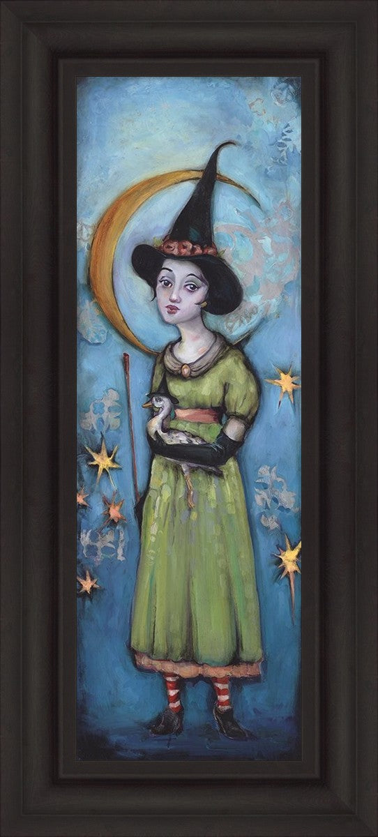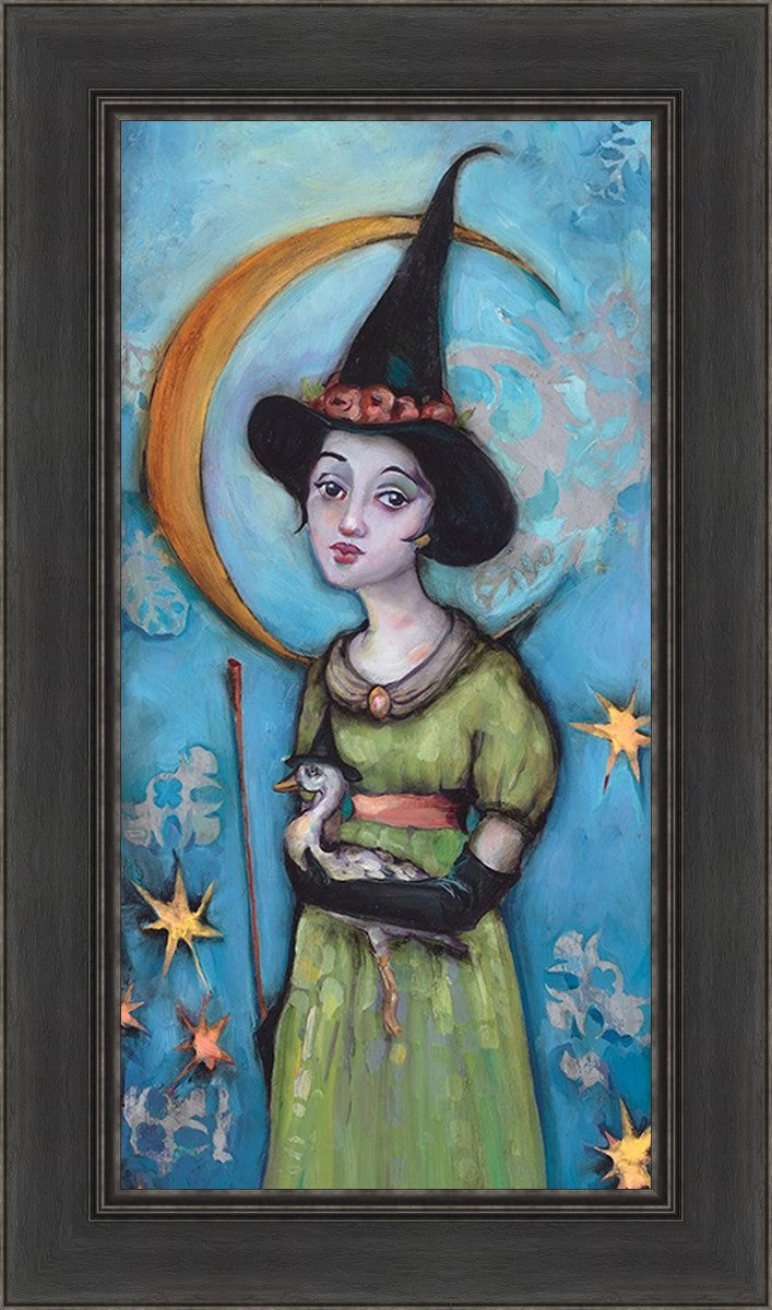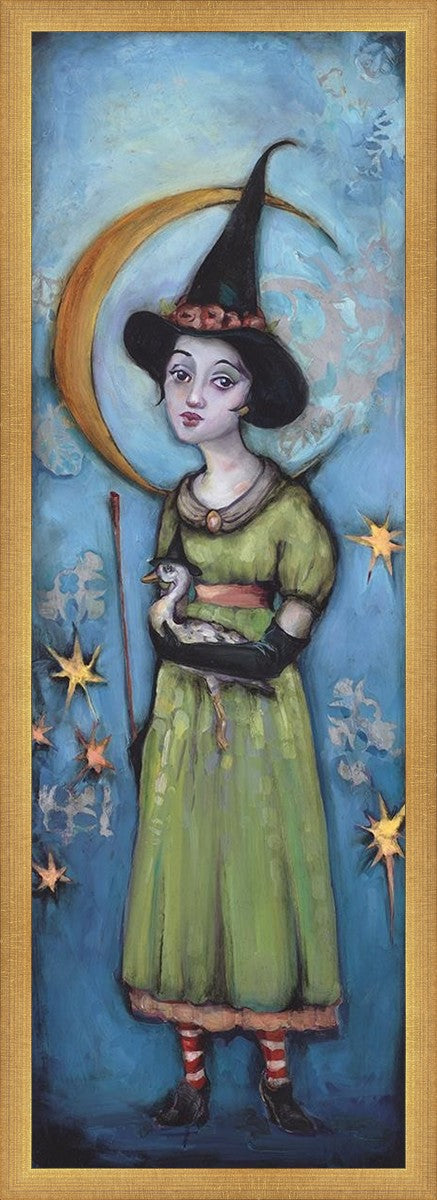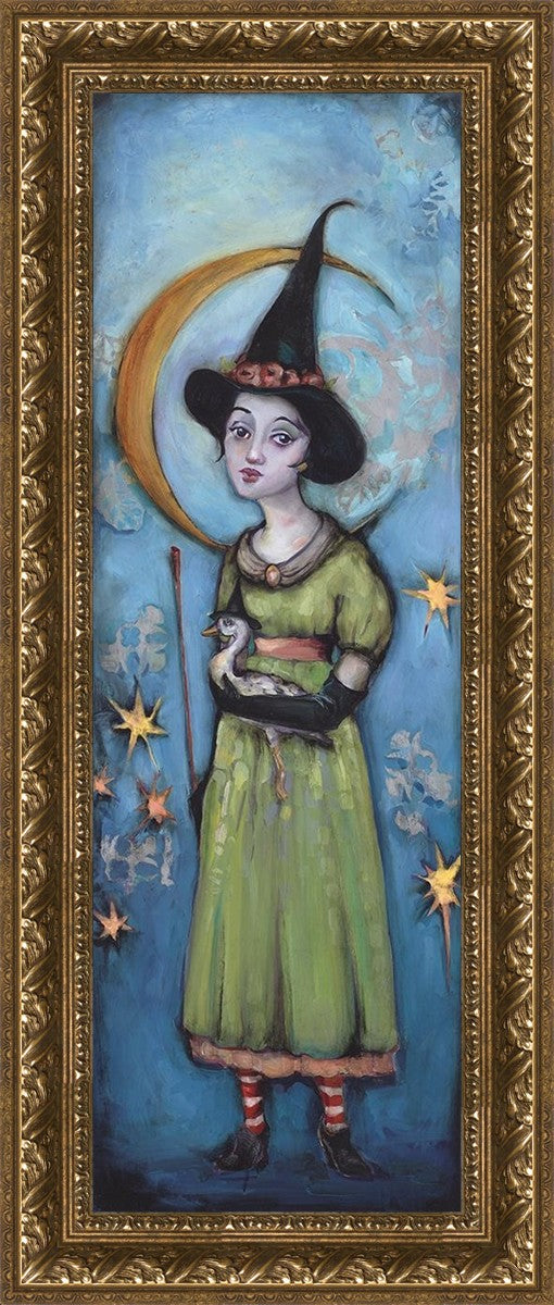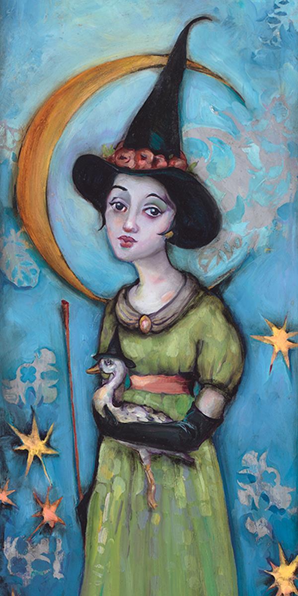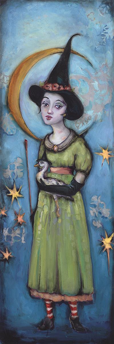 Spellbound features a black hatted witch carrying her duck and broomstick against a crescent moon. Love those socks!