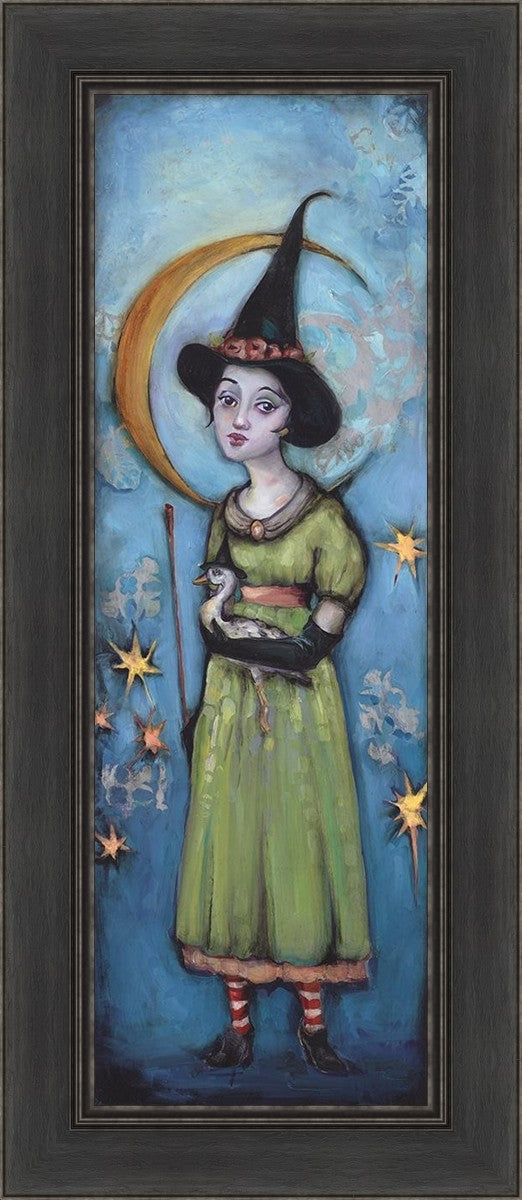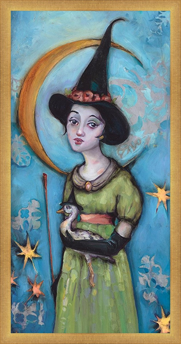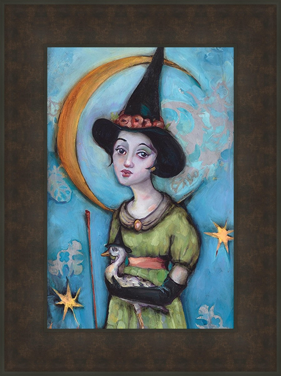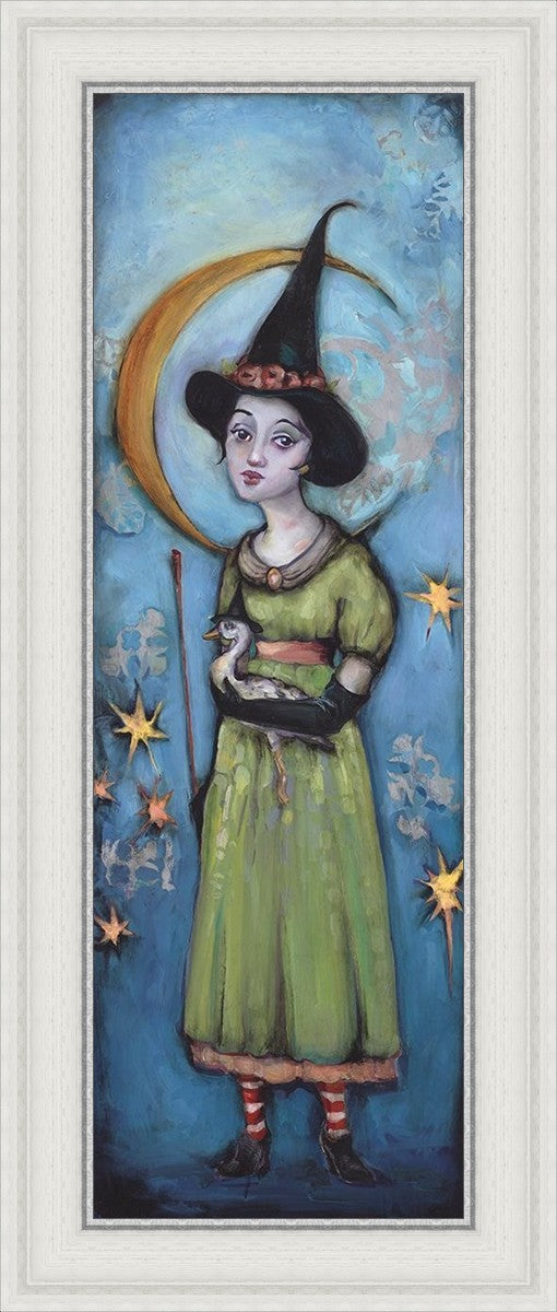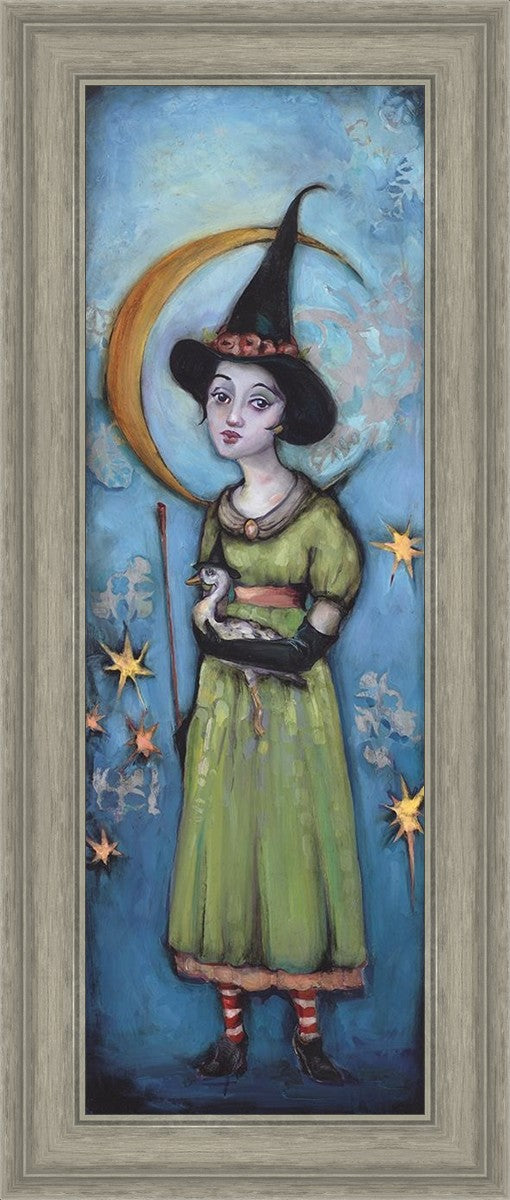 Spellbound features a black hatted witch carrying her duck and broomstick against a crescent moon. Love those socks!