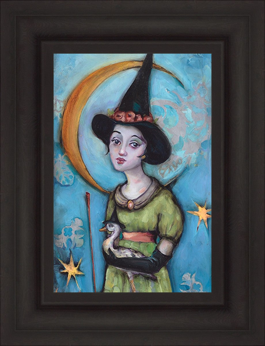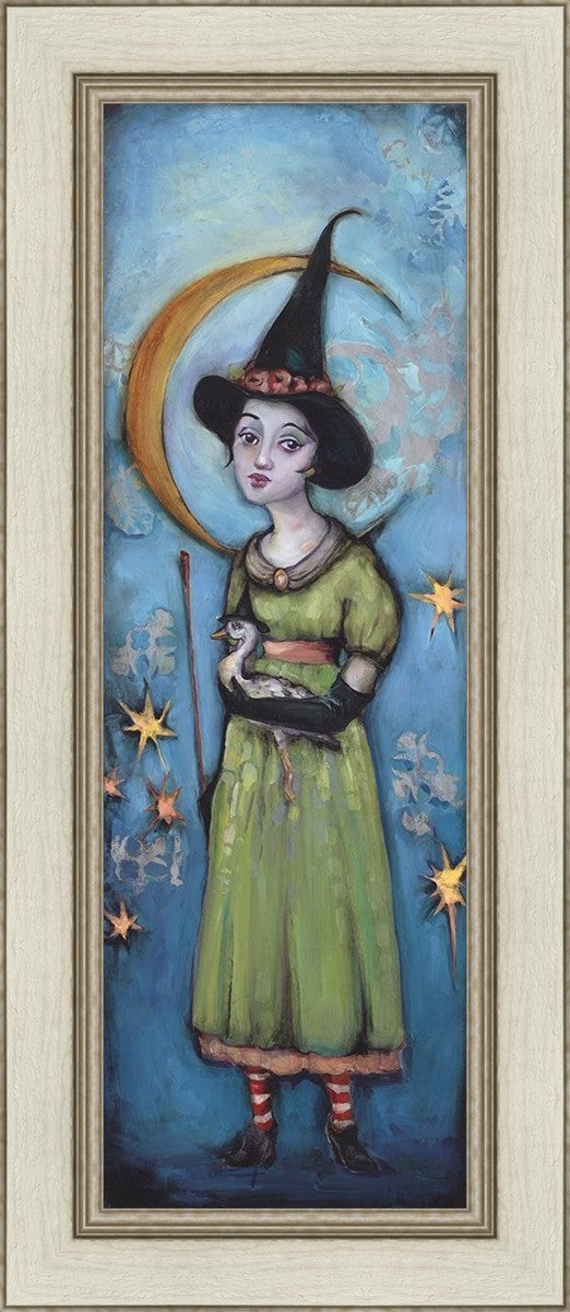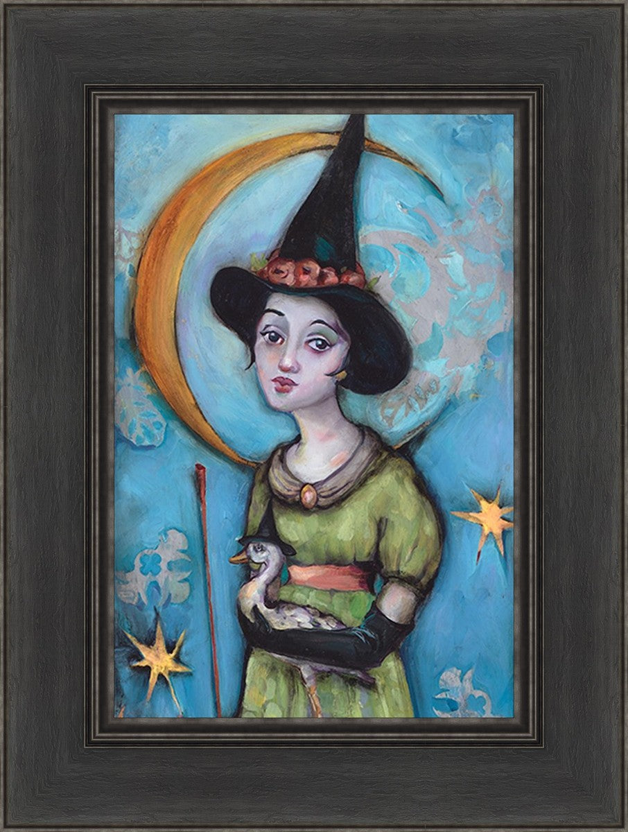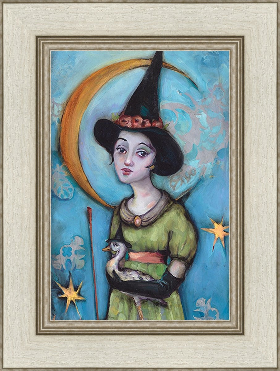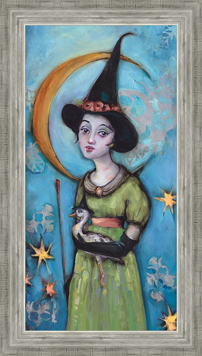 Spellbound features a black hatted witch carrying her duck and broomstick against a crescent moon. Love those socks!