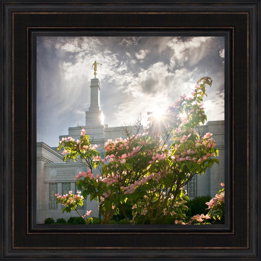 Since 1999 Landon has worked as an artisan in nearly 40 temples doing the decorative paint and gold leaf. He continues to do so as well as wood repair and graining. He was married in 2001 to Jacey Thomas in the Manti Utah temple. When she couldn’t find an image of the temple that she liked enough to purchase for their home, he decided to take one himself. That desire to create something original and different inspired his current series of temple art. They are taken from a panoramic viewpoint and stylized with an artistic border that reflect his paintings. All modern structures apart from the temple have been omitted.