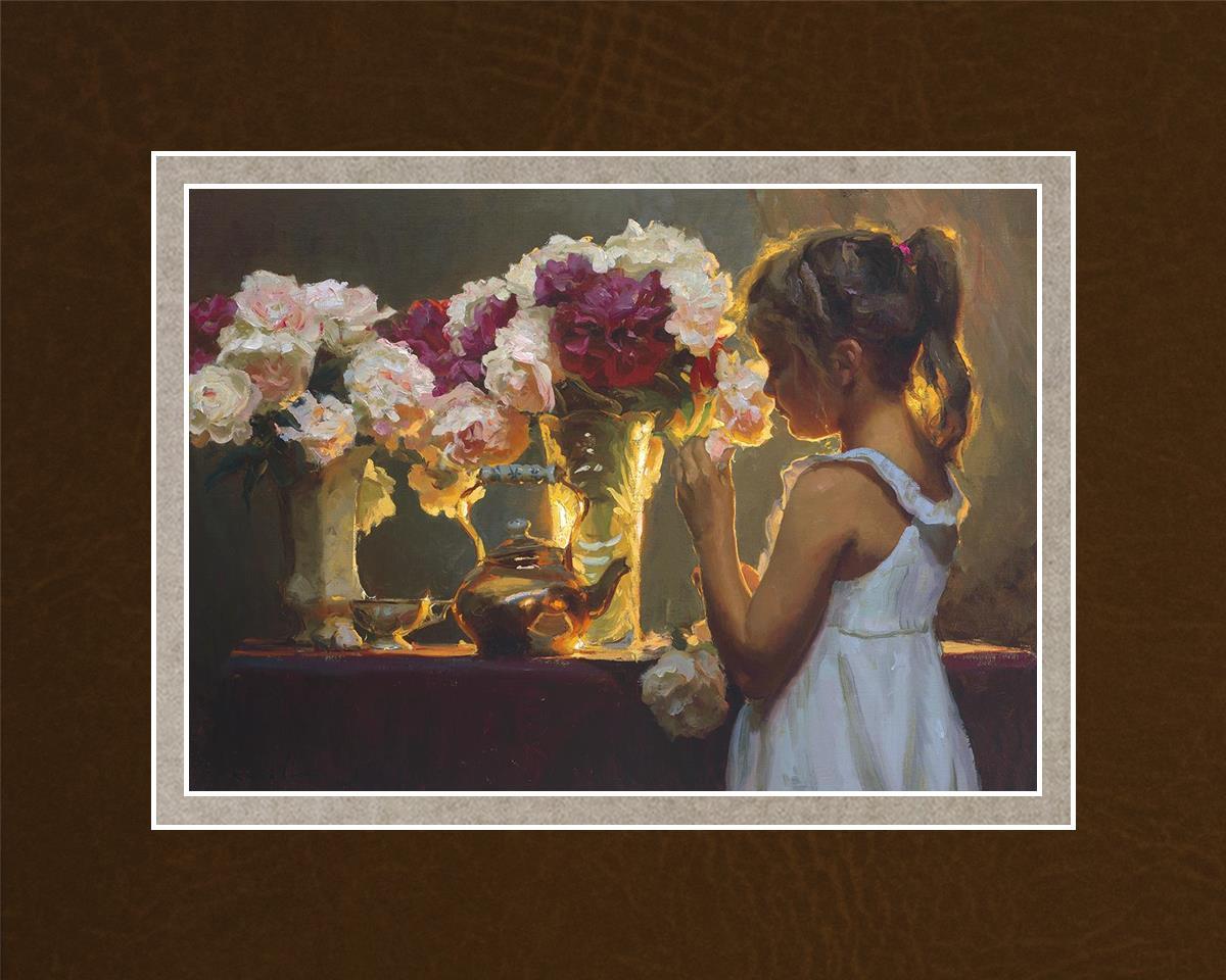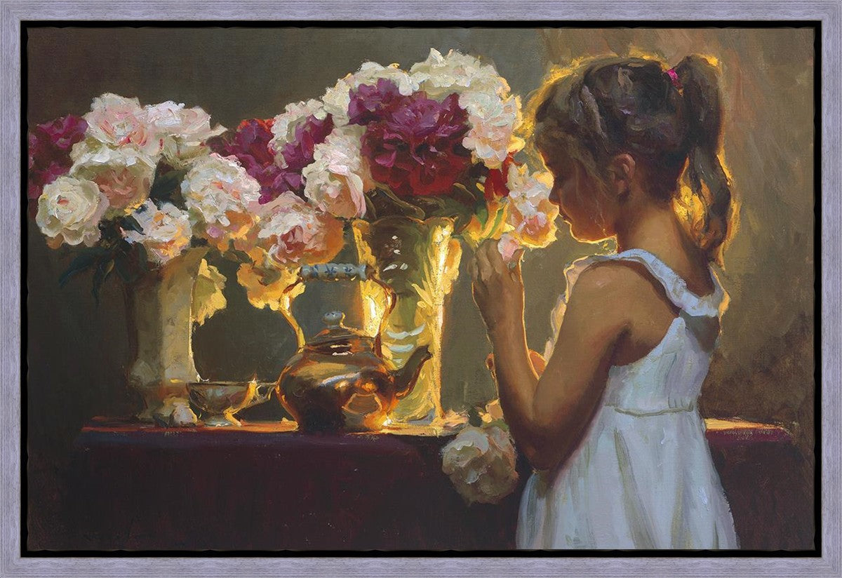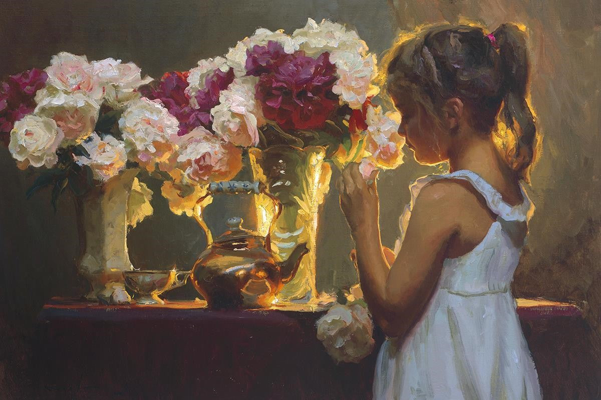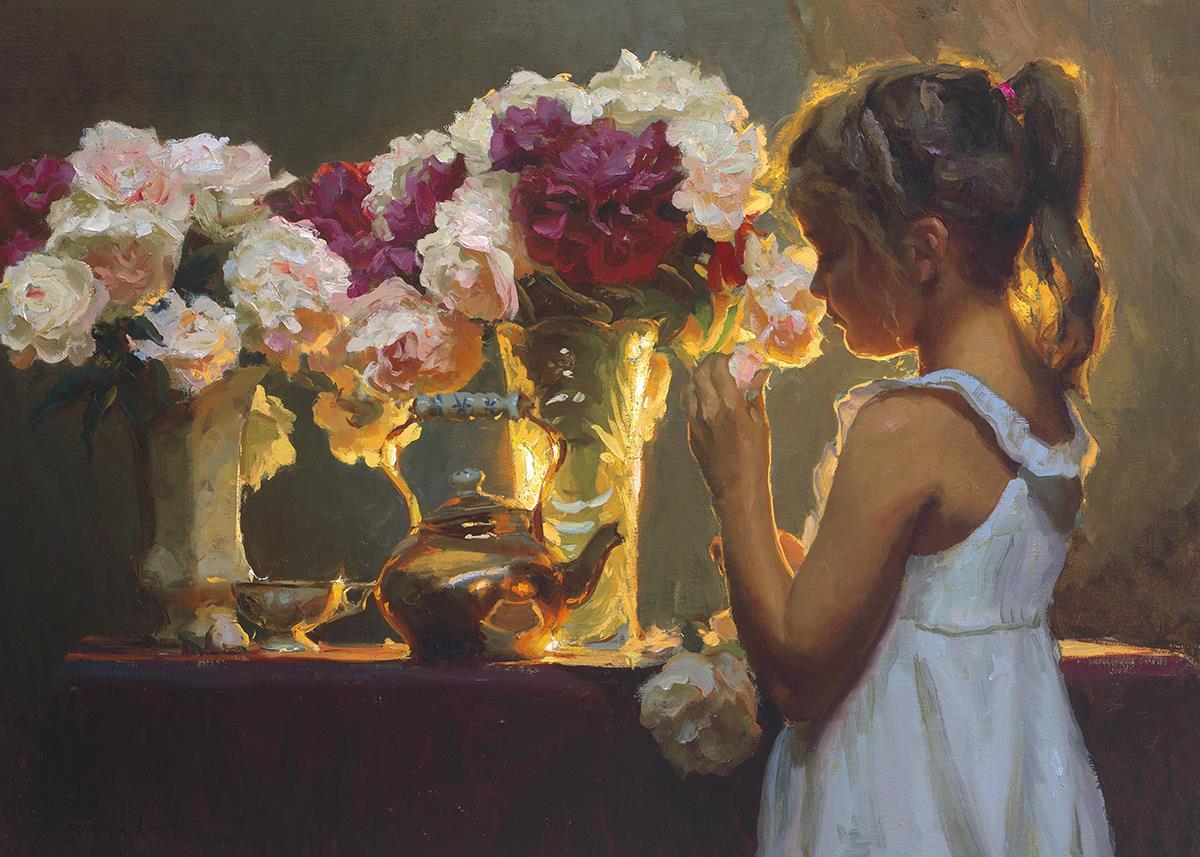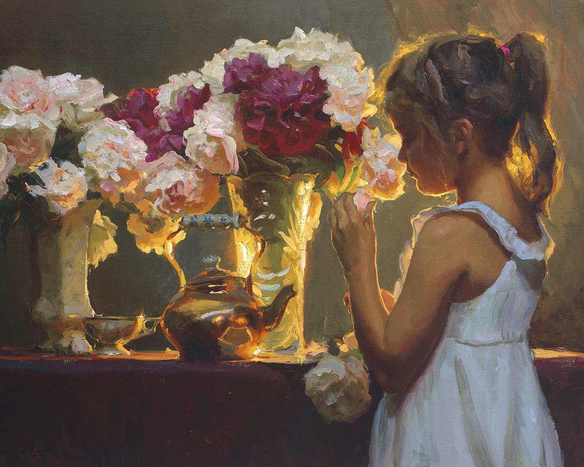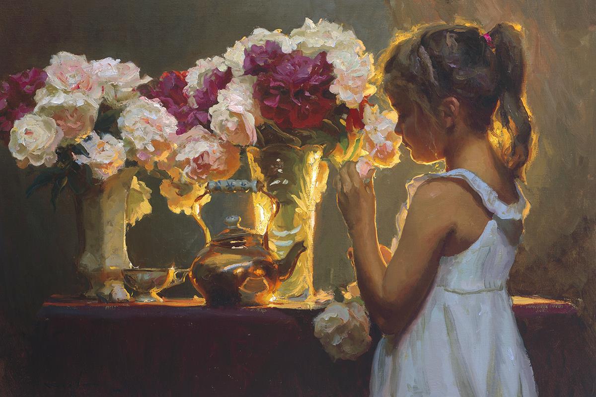 In Spring's Blessing, a young girl shilouetted against warm backlighting takes in the smell of the season first set of fresh cut flowers