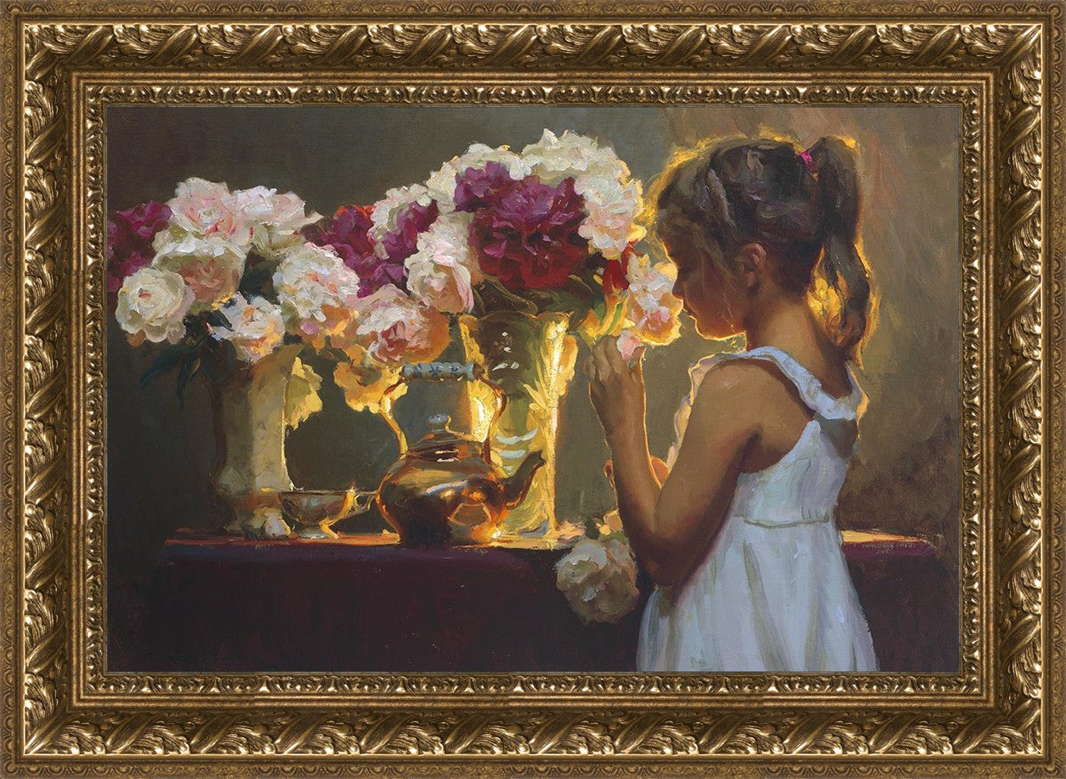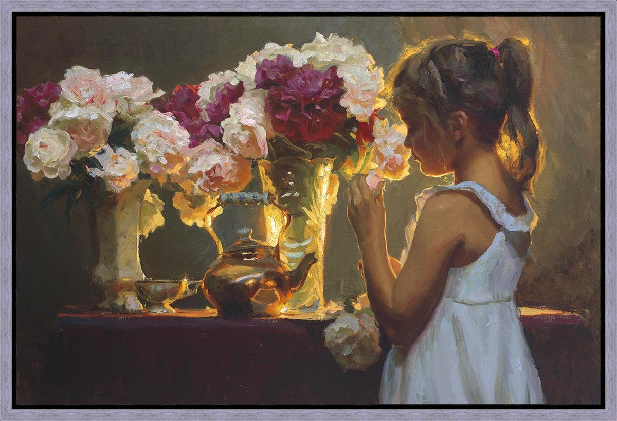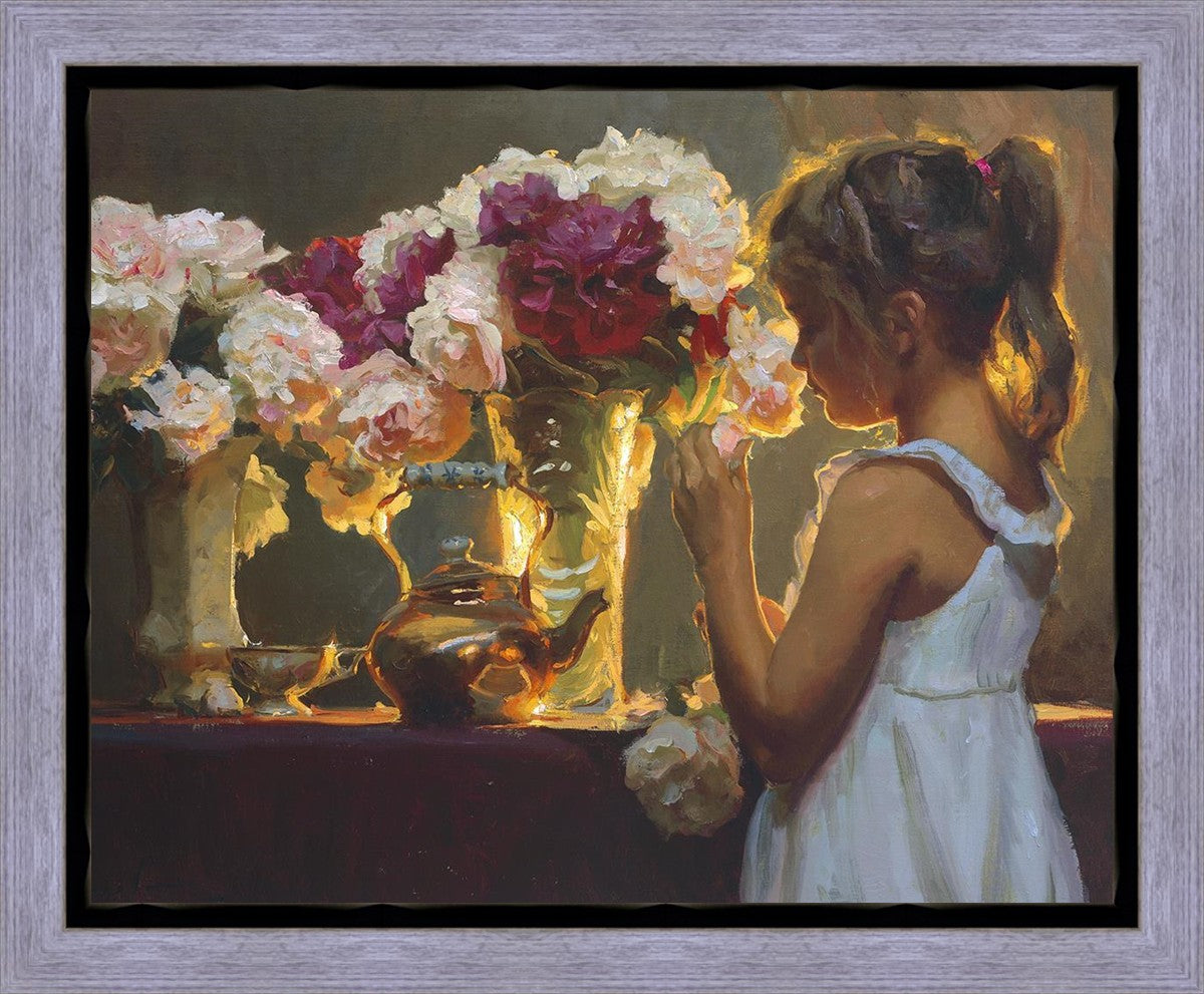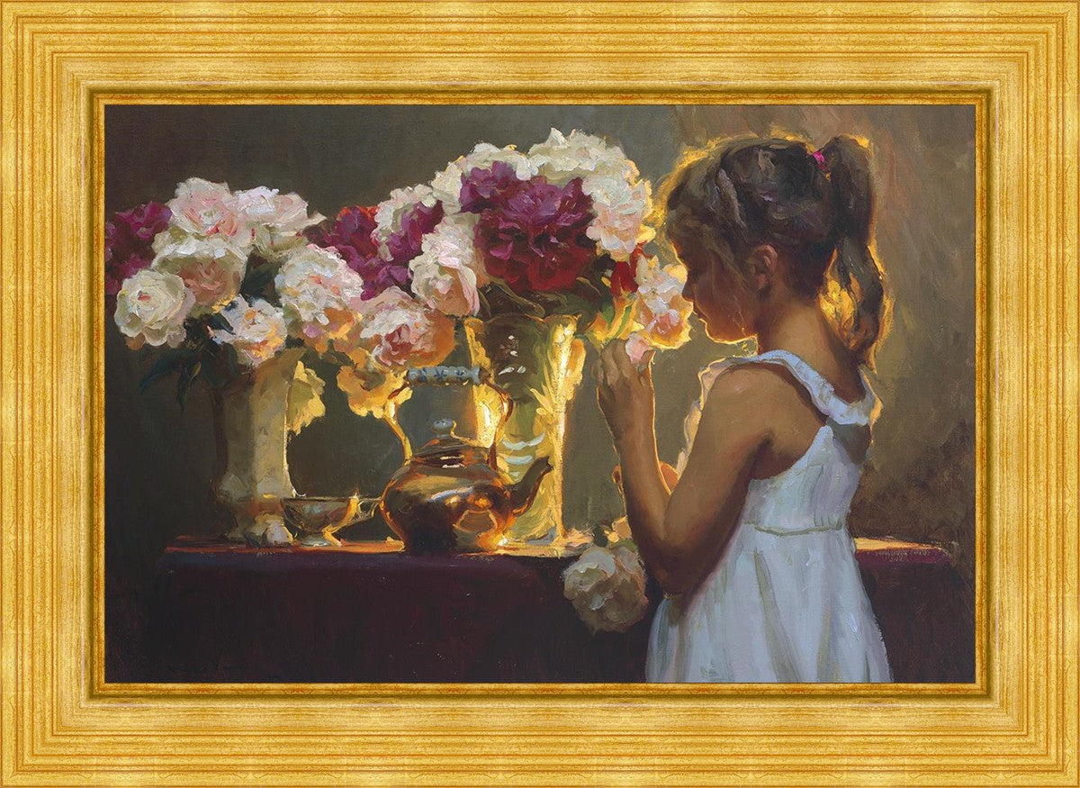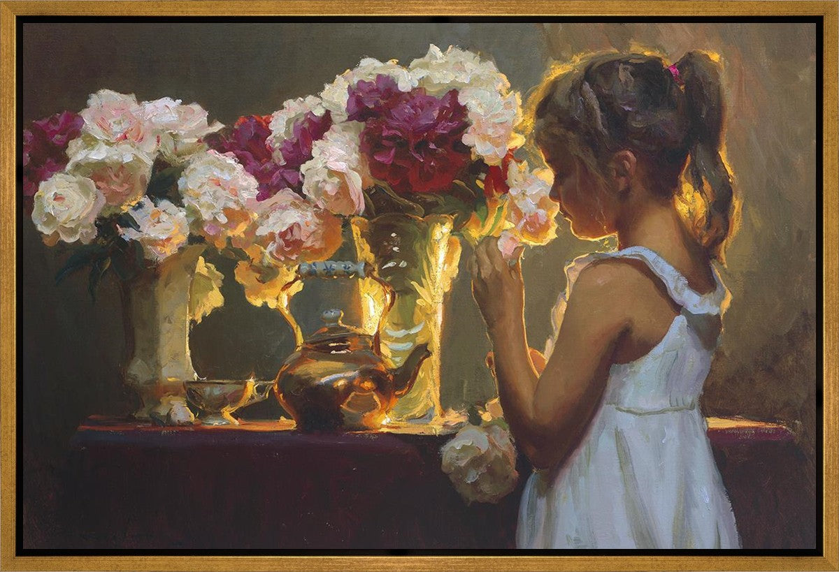 In Spring's Blessing, a young girl shilouetted against warm backlighting takes in the smell of the season first set of fresh cut flowers