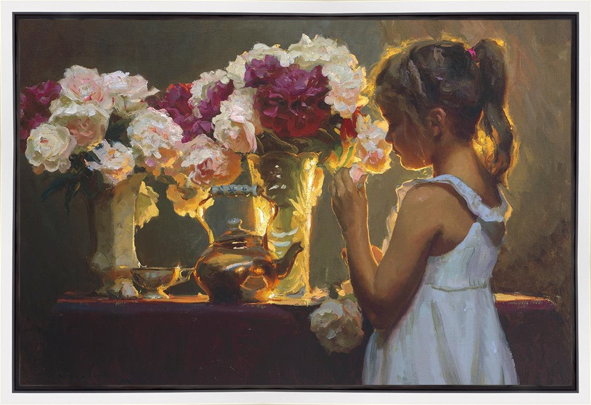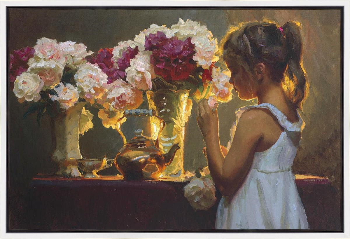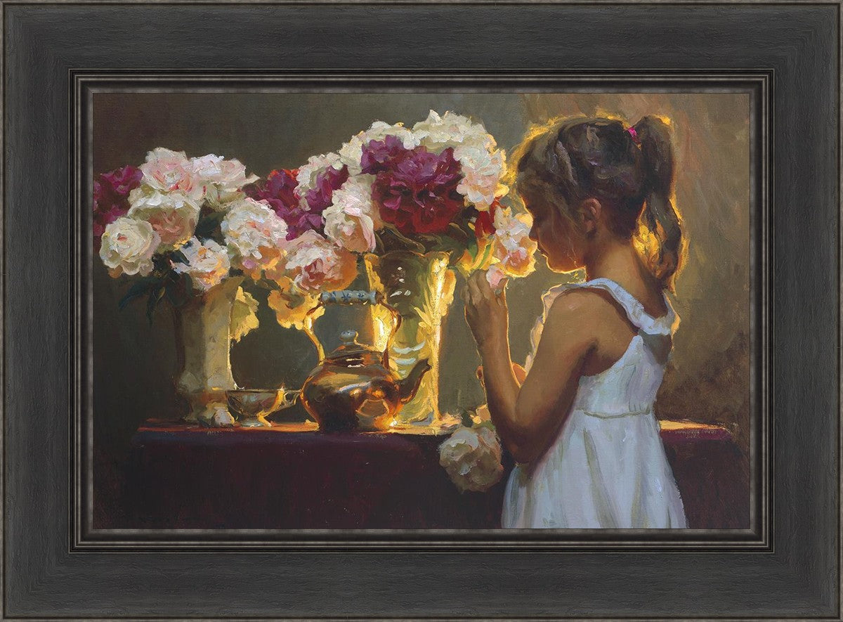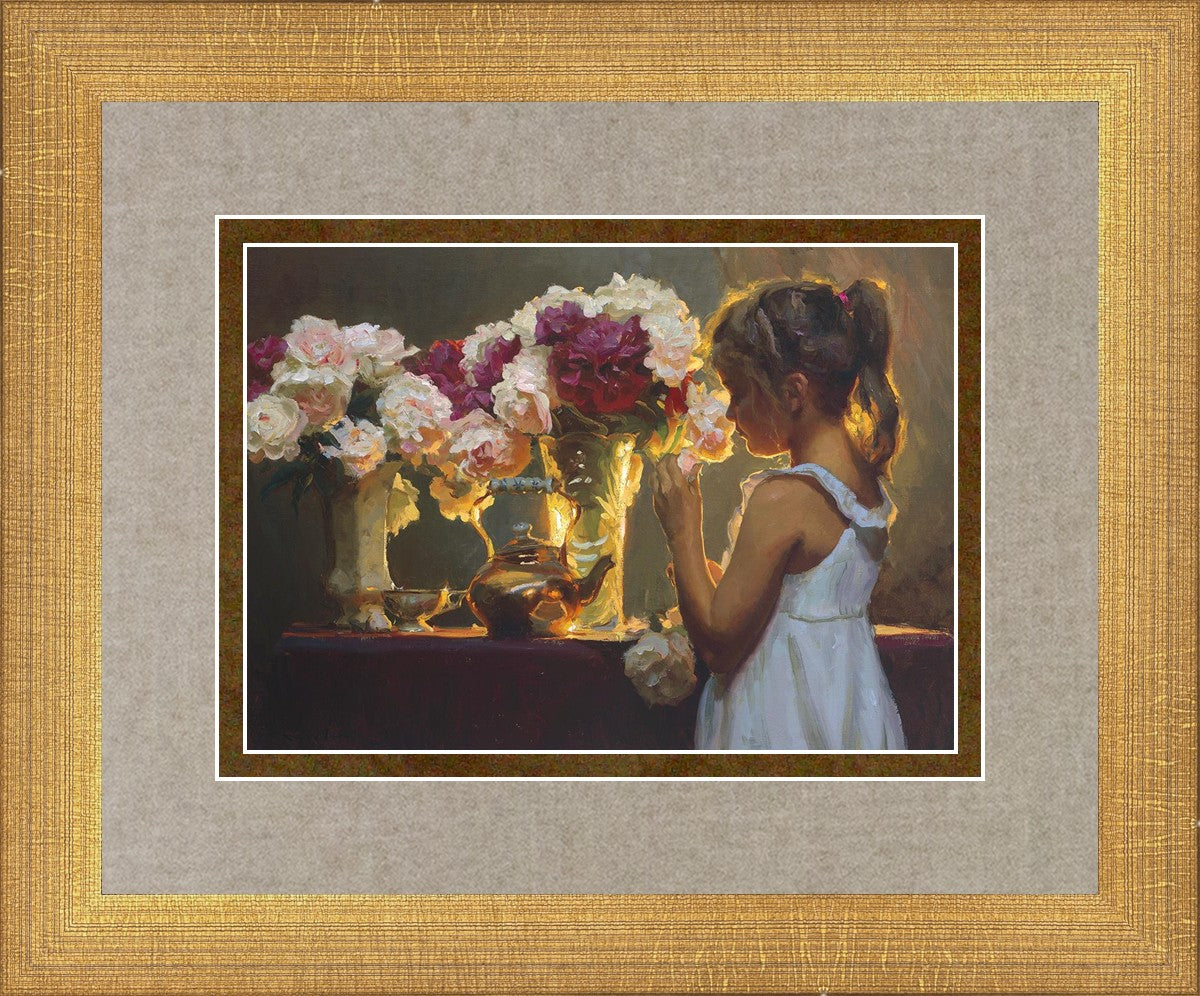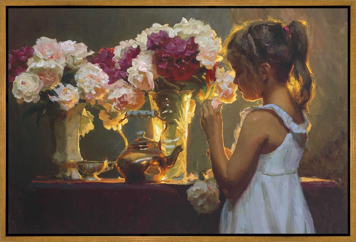 In Spring's Blessing, a young girl shilouetted against warm backlighting takes in the smell of the season first set of fresh cut flowers