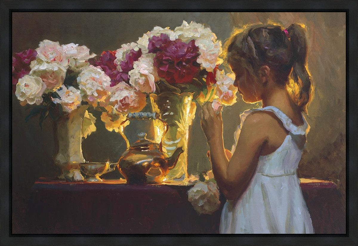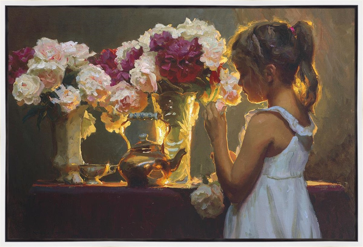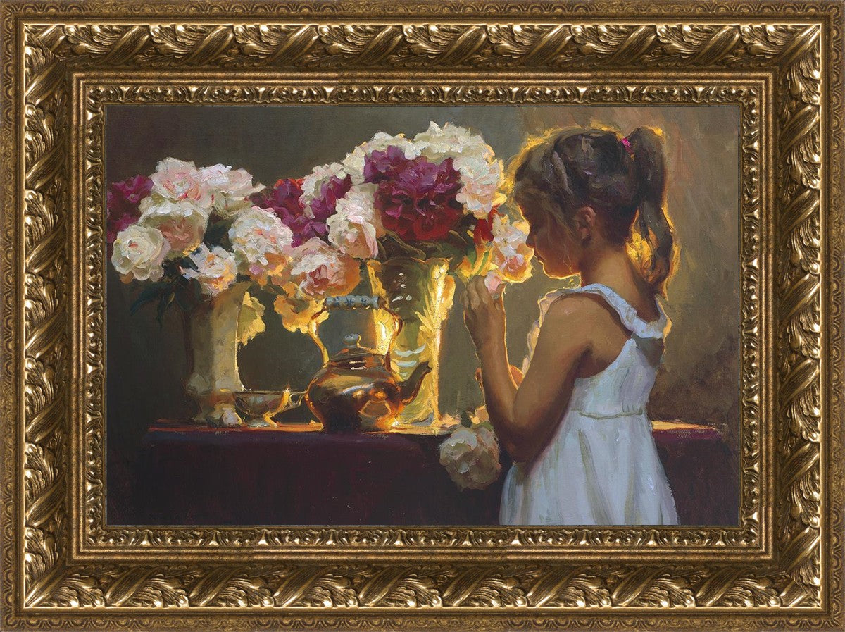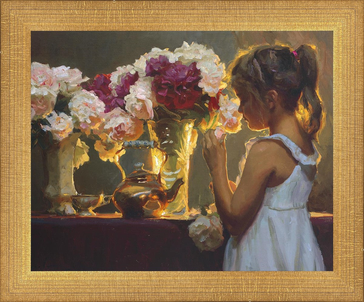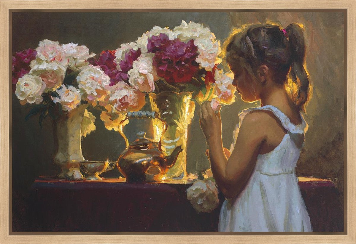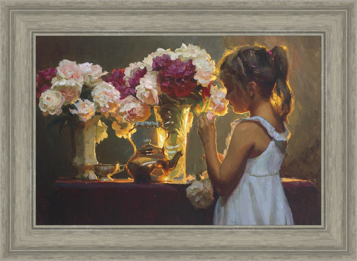 In Spring's Blessing, a young girl shilouetted against warm backlighting takes in the smell of the season first set of fresh cut flowers