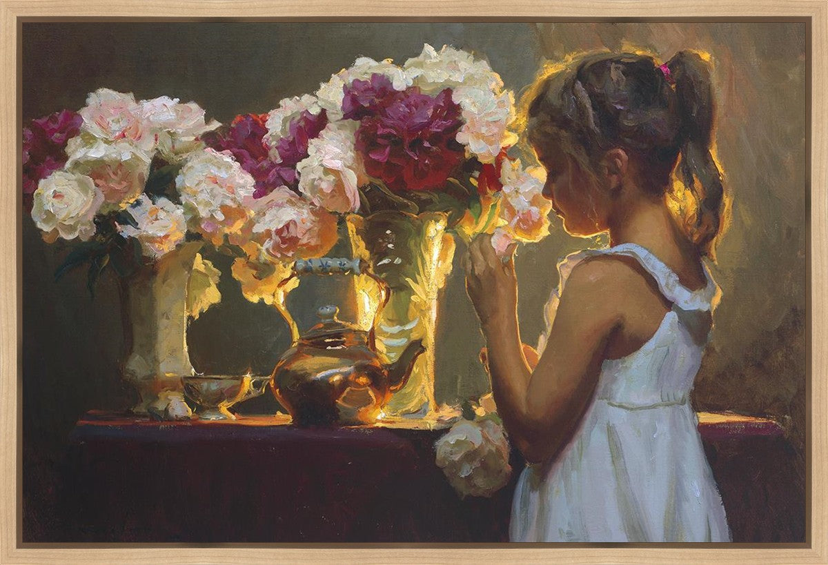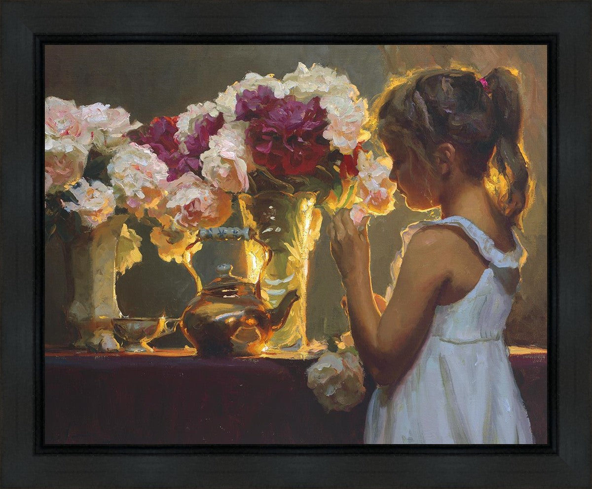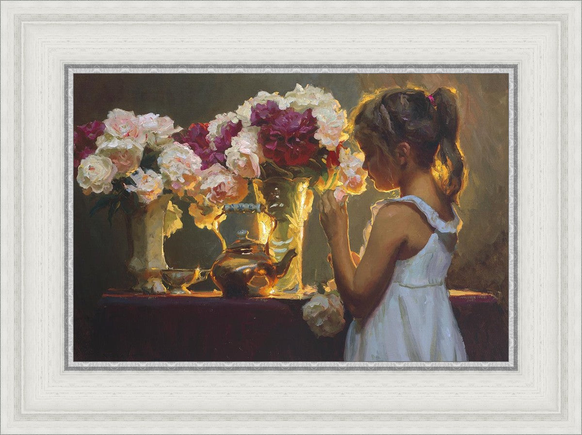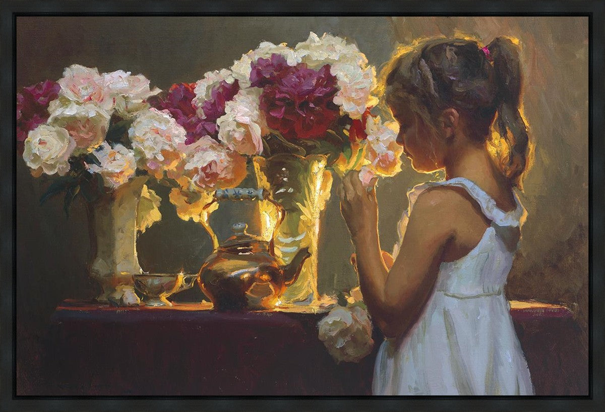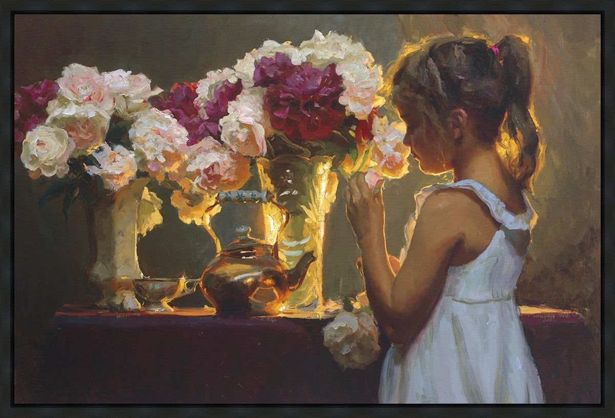 In Spring's Blessing, a young girl shilouetted against warm backlighting takes in the smell of the season first set of fresh cut flowers