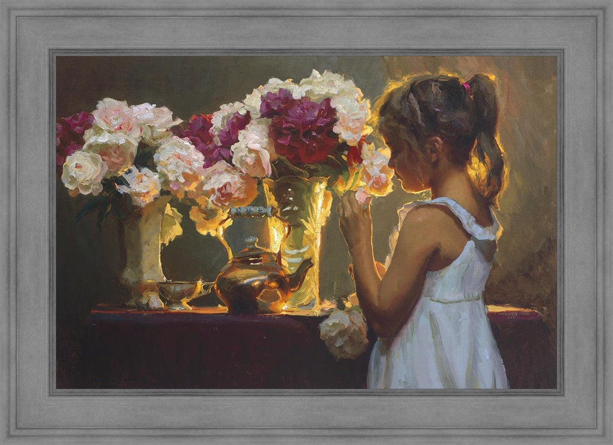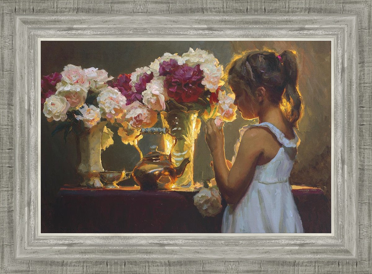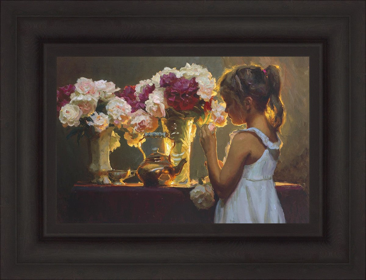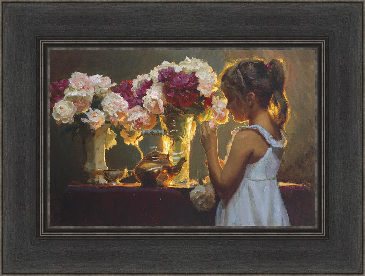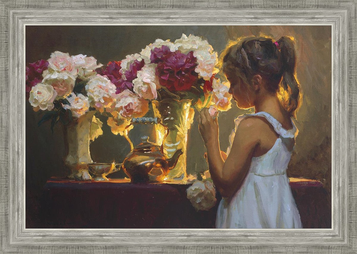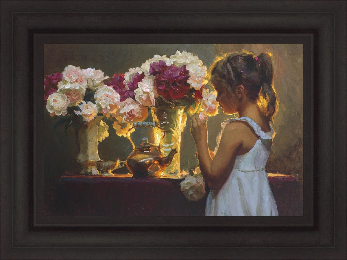 In Spring's Blessing, a young girl shilouetted against warm backlighting takes in the smell of the season first set of fresh cut flowers