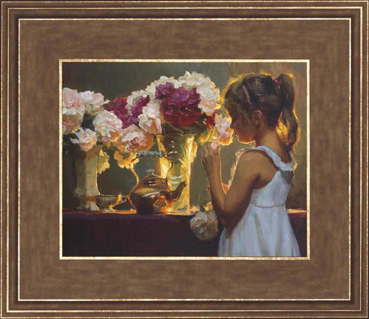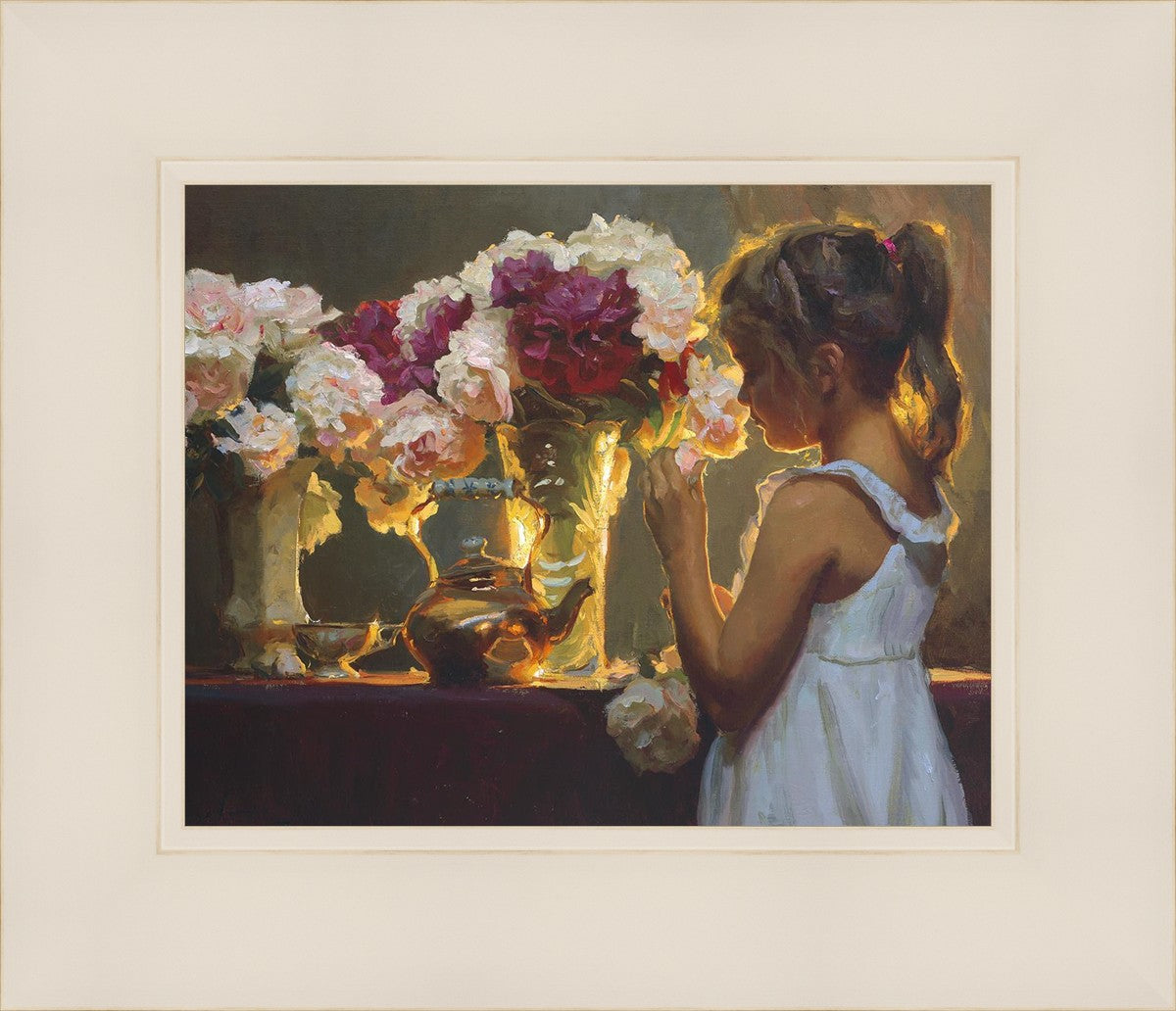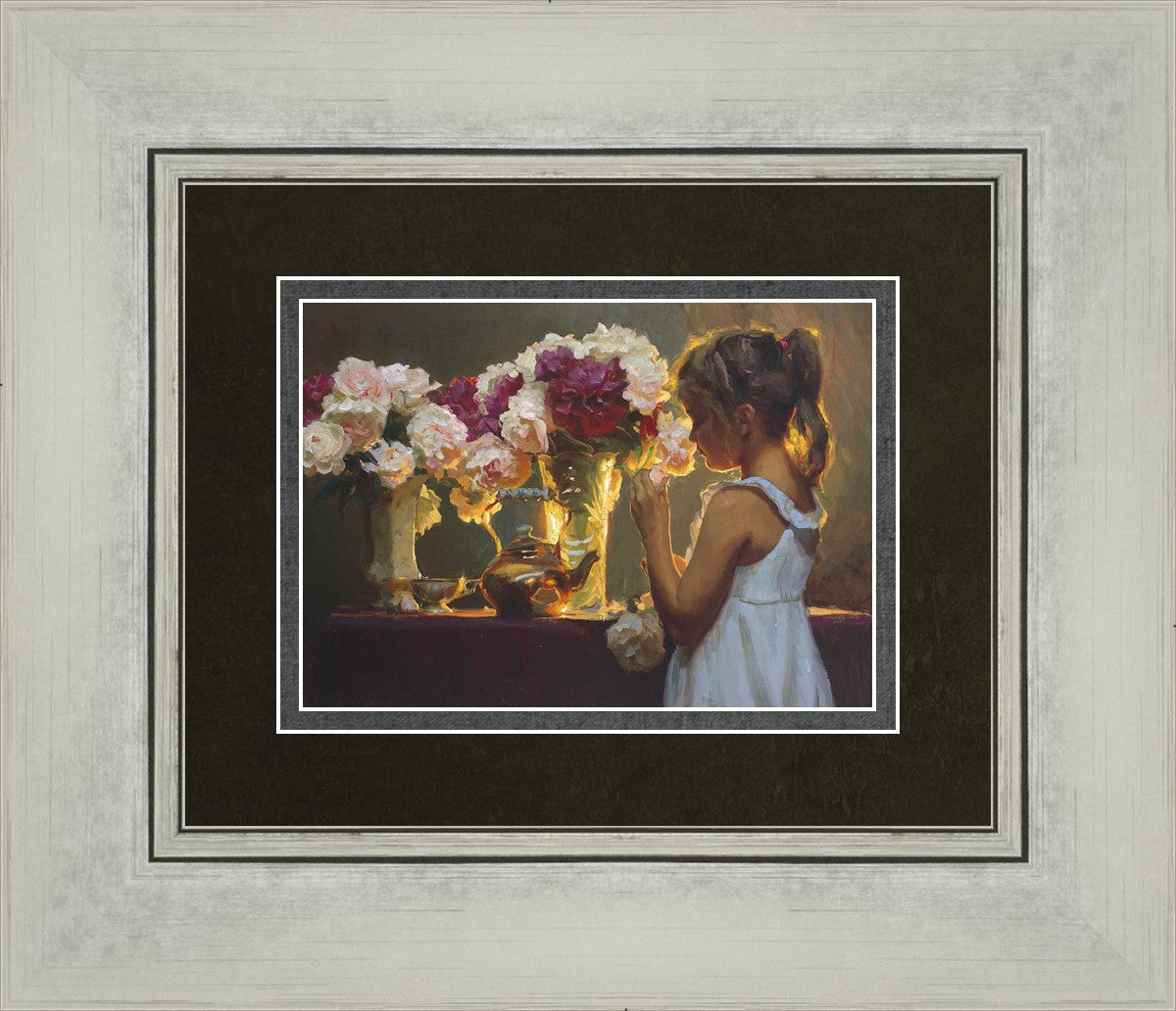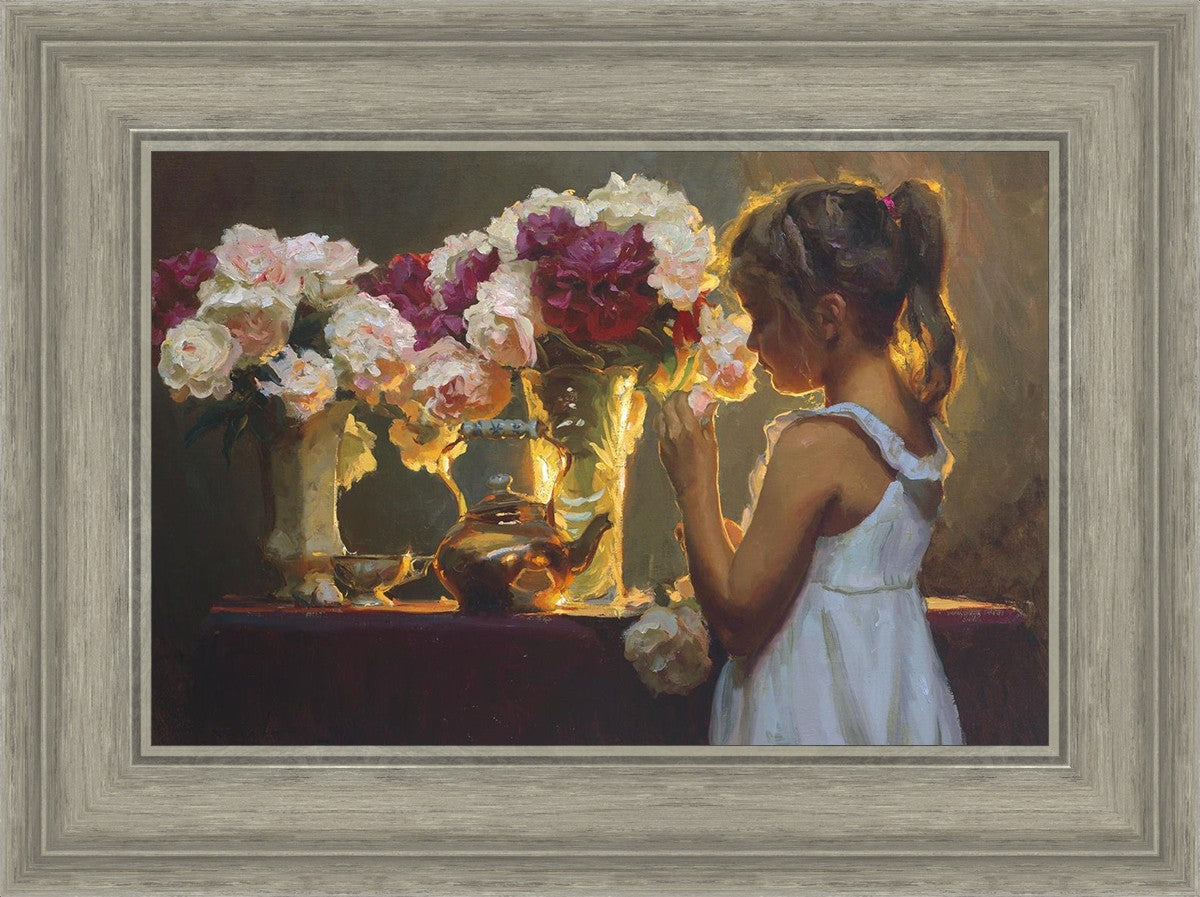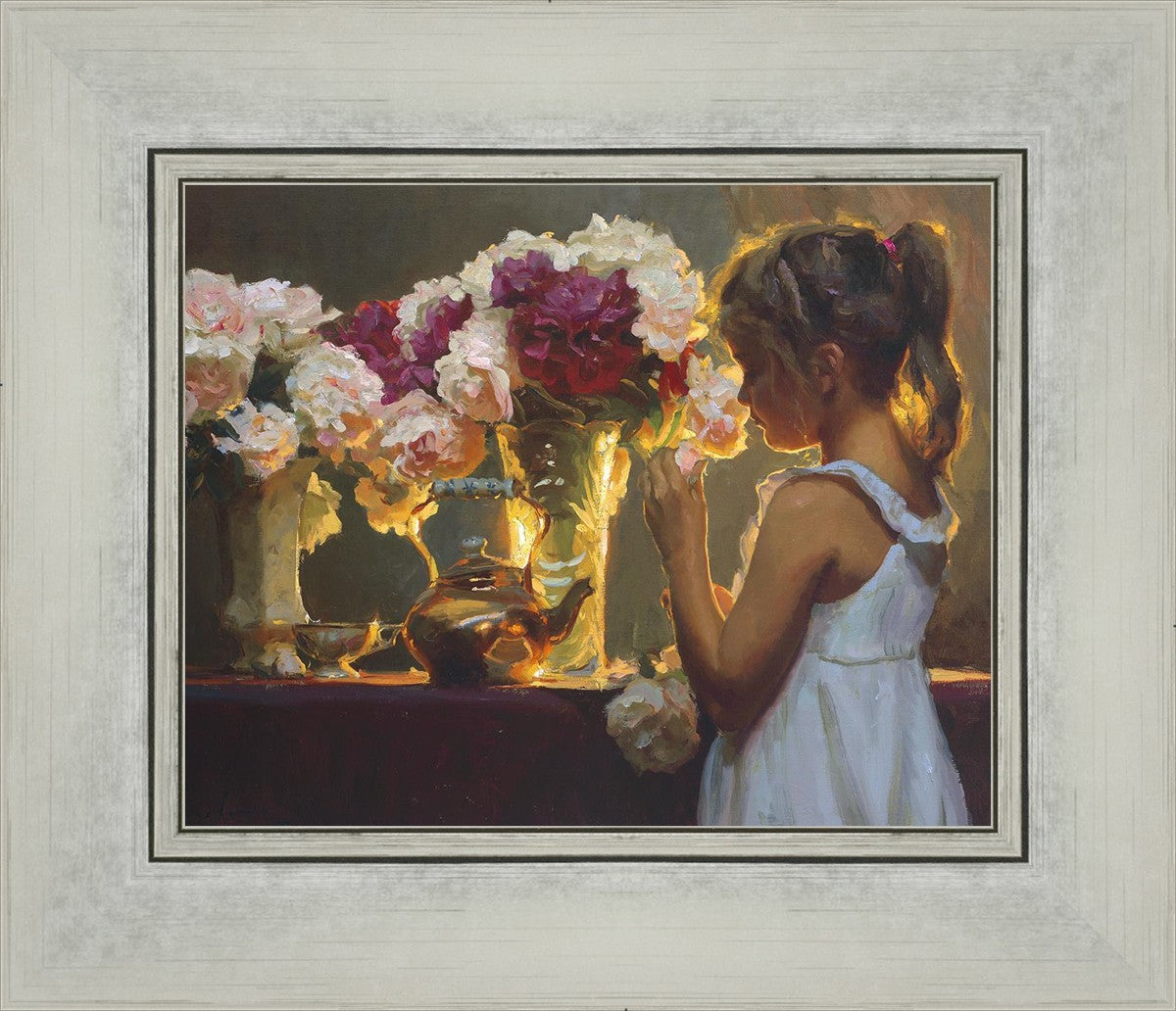 In Spring's Blessing, a young girl shilouetted against warm backlighting takes in the smell of the season first set of fresh cut flowers