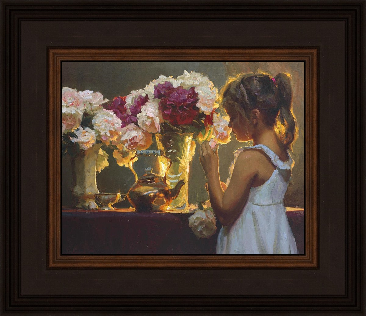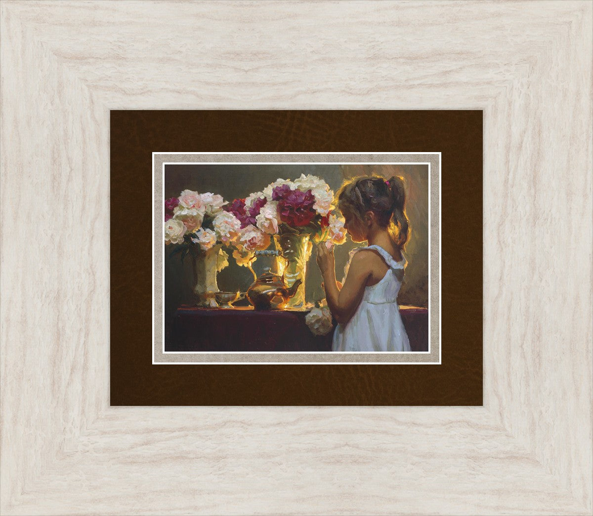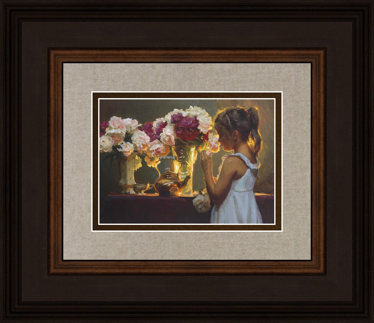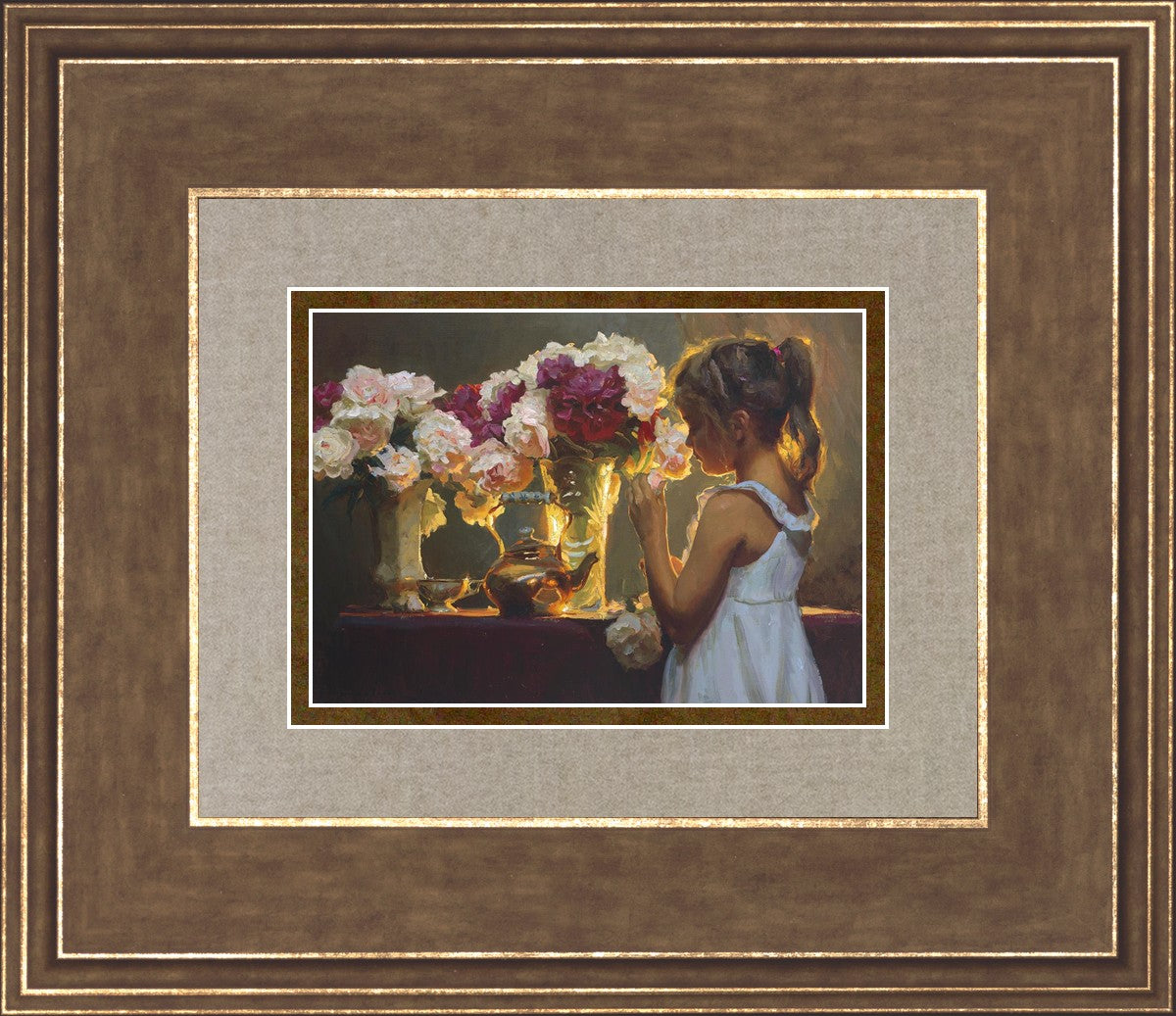 In Spring's Blessing, a young girl shilouetted against warm backlighting takes in the smell of the season first set of fresh cut flowers
