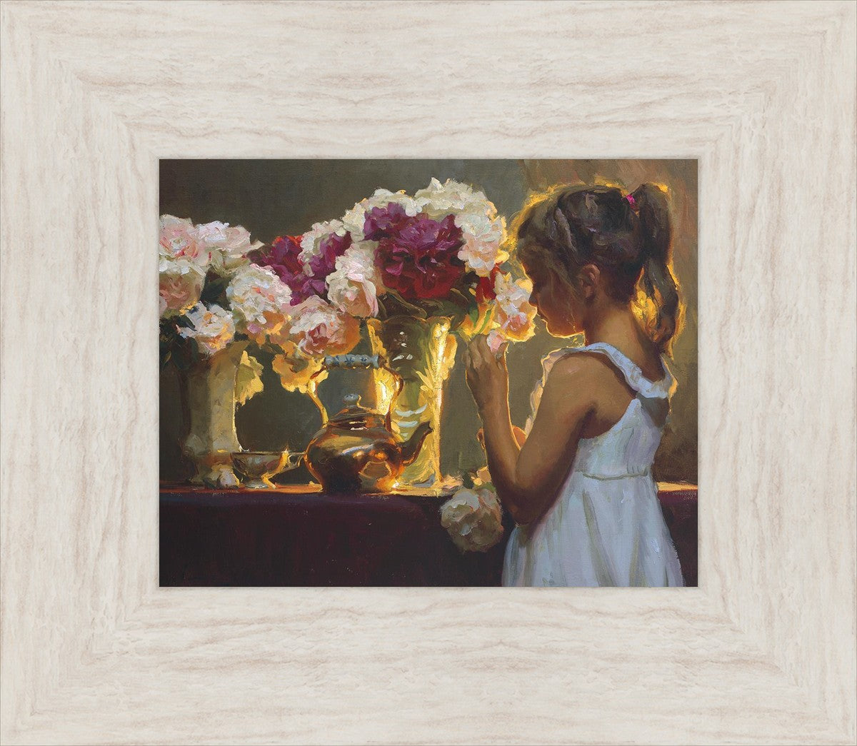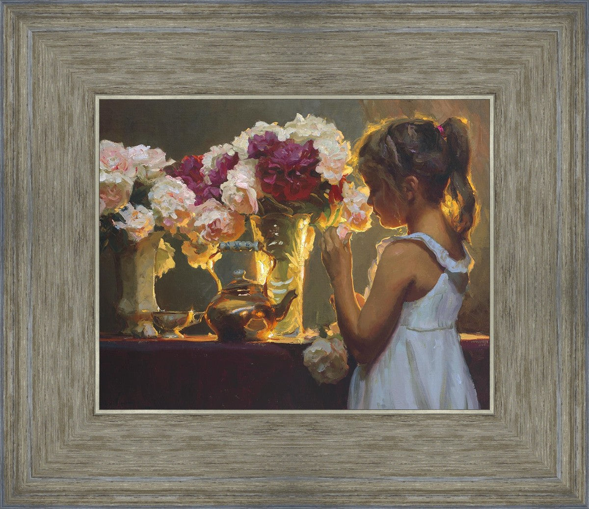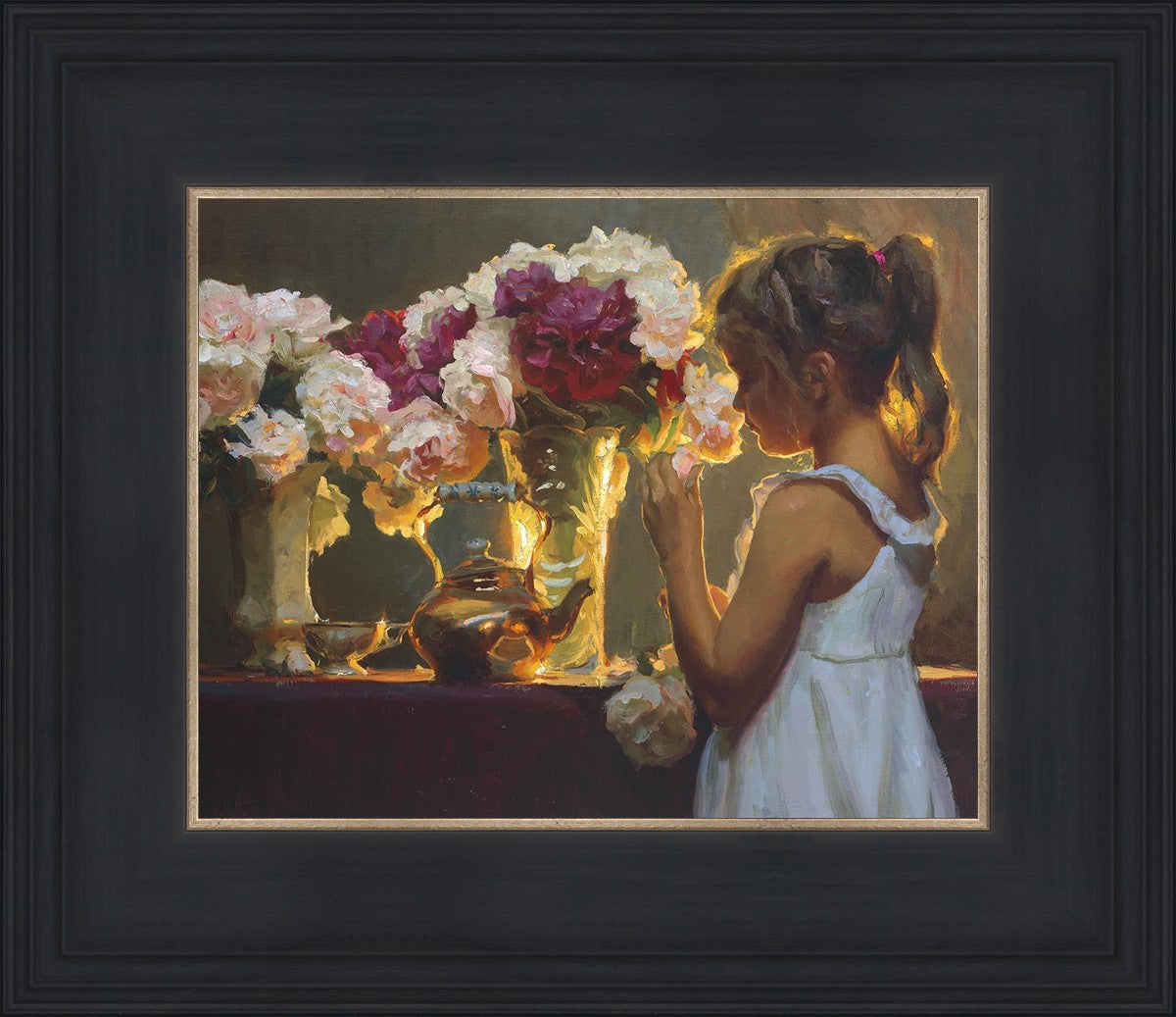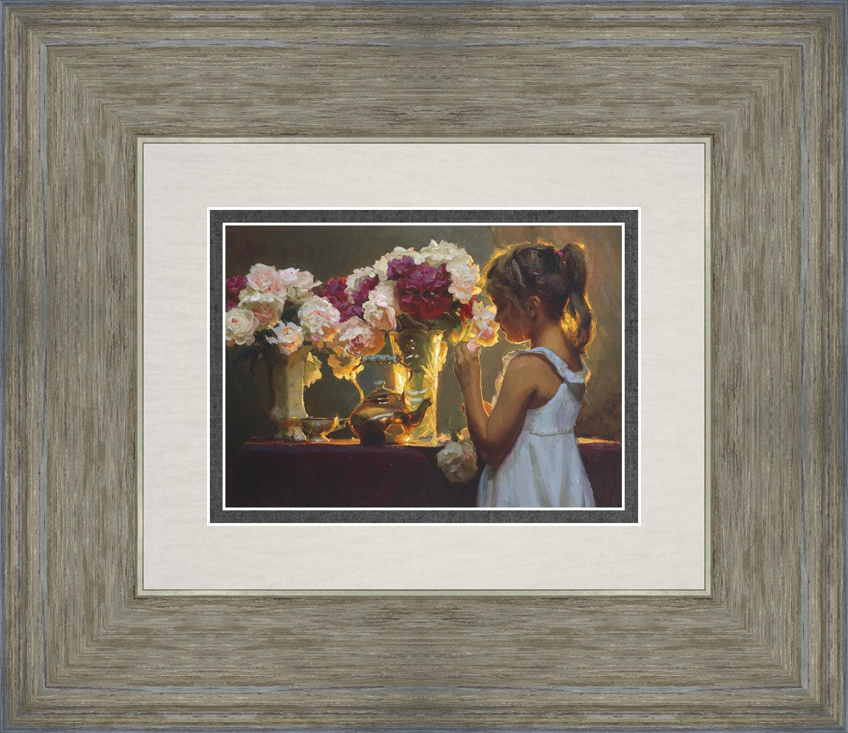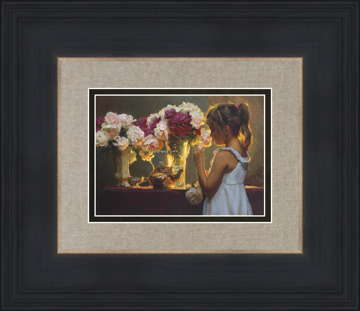 In Spring's Blessing, a young girl shilouetted against warm backlighting takes in the smell of the season first set of fresh cut flowers