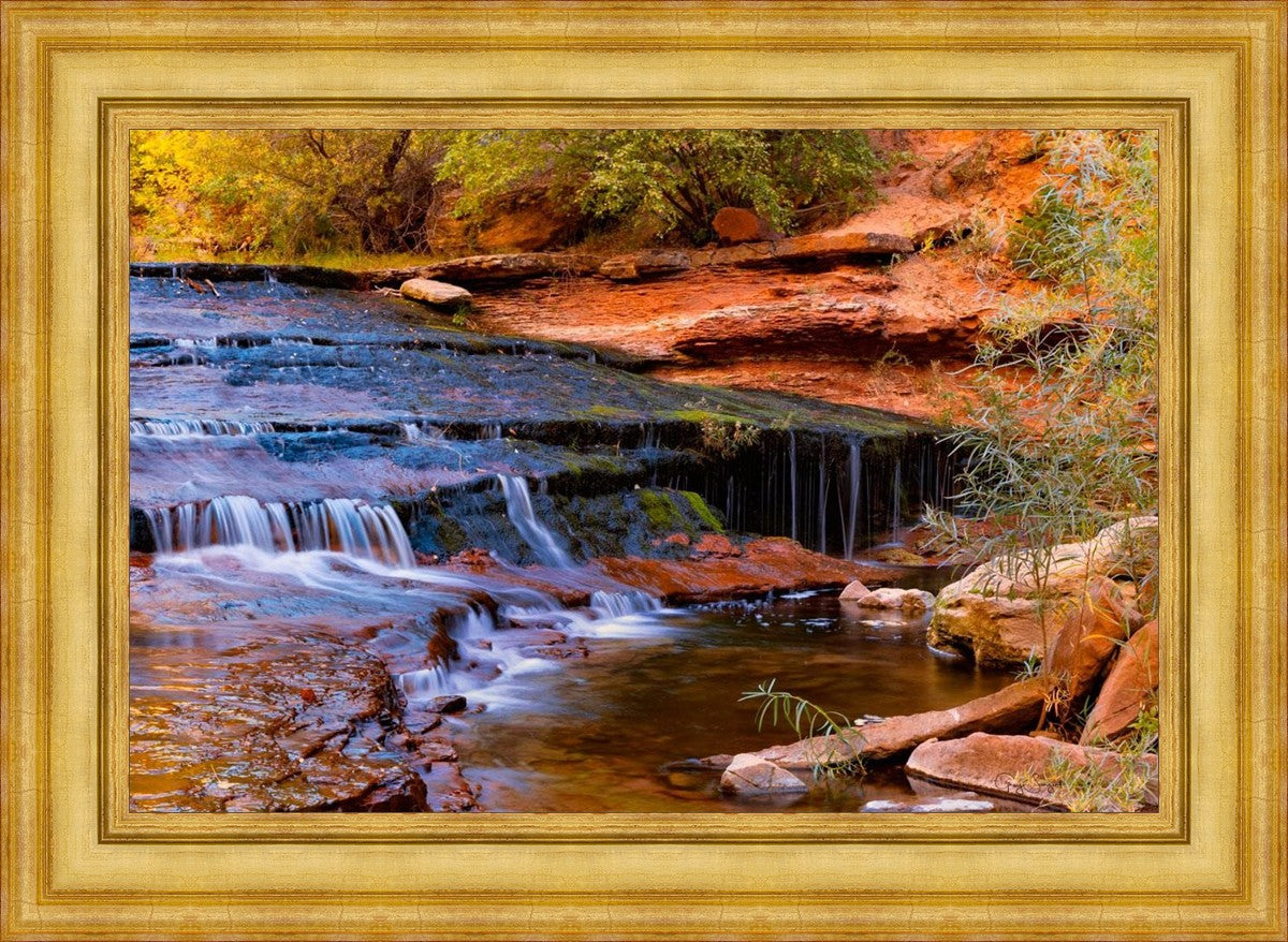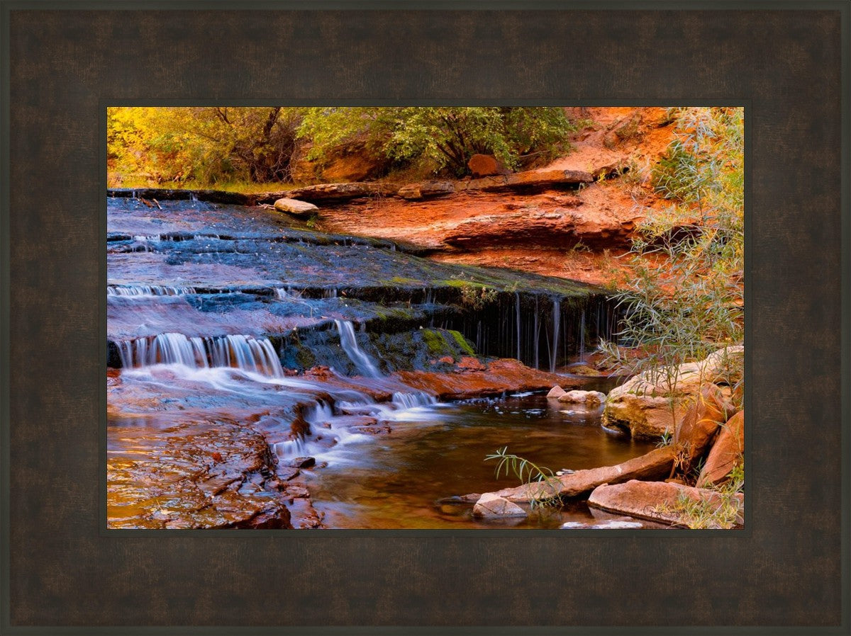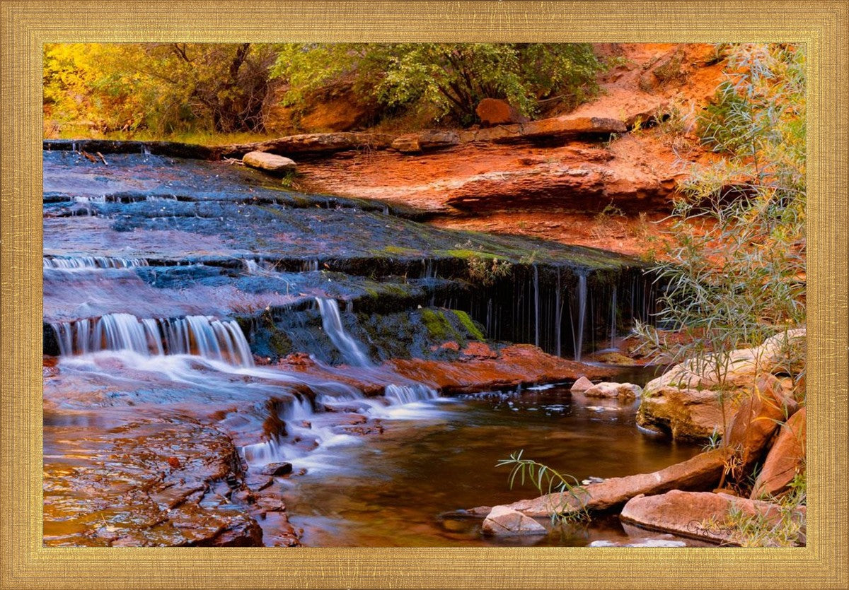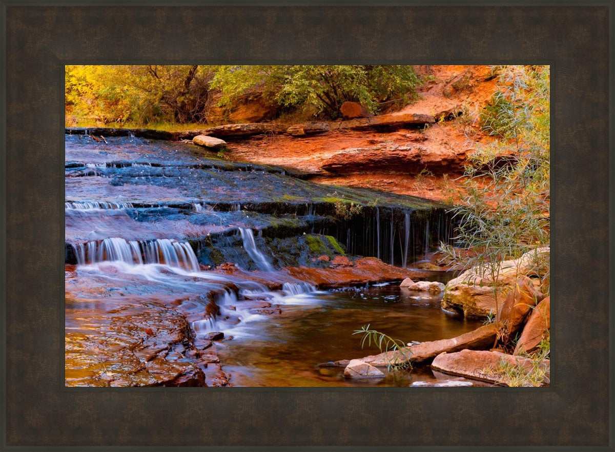 The beautiful North Fork stream runs at the bottom of the canyon and passes over a crimson fossilized bed of Kayenta shale. It's called Arch Angel Falls.