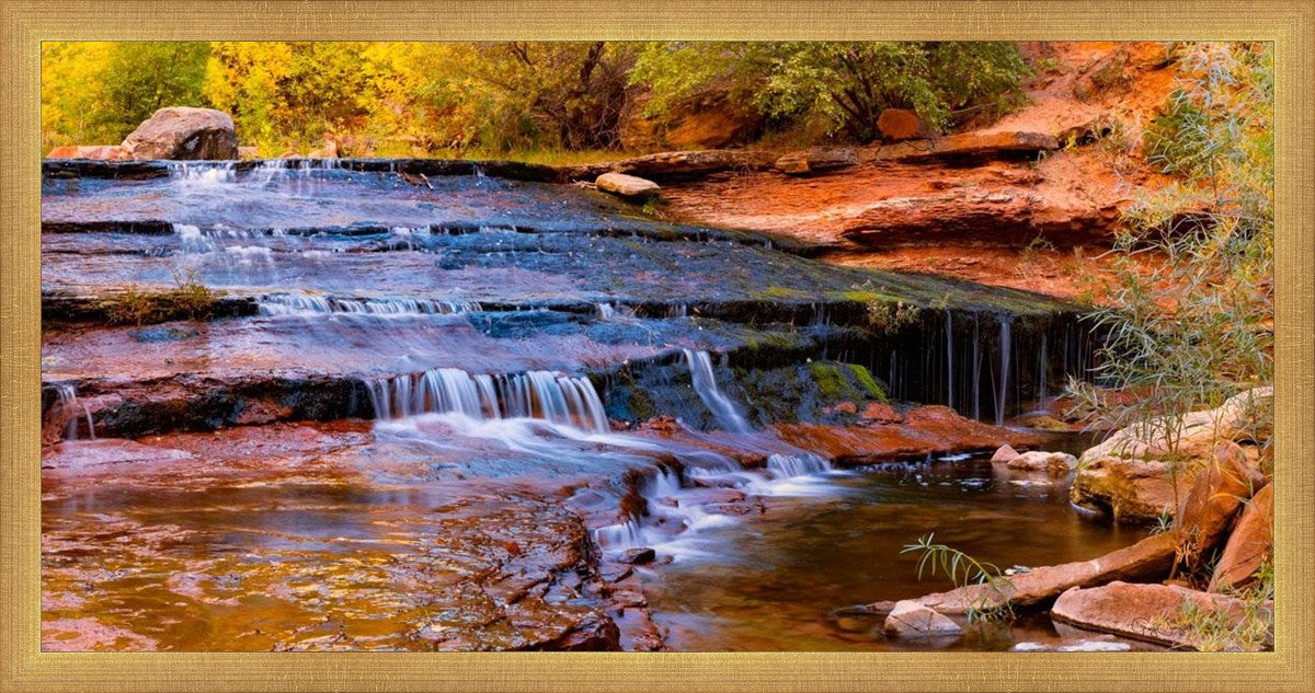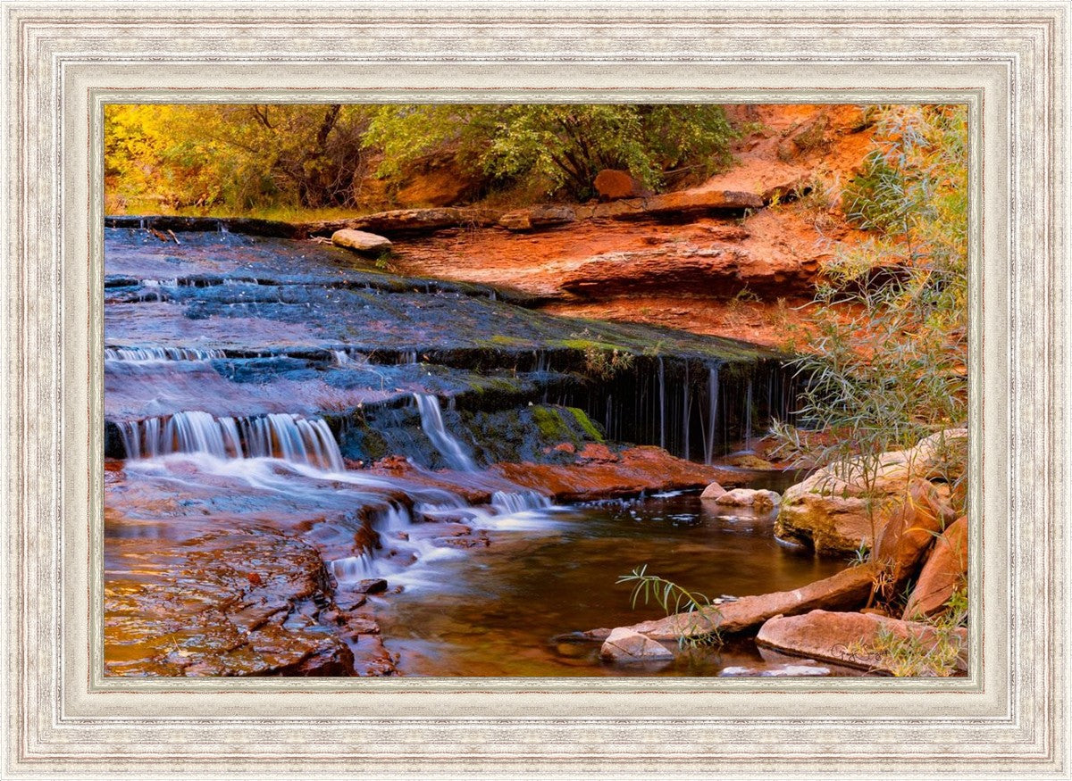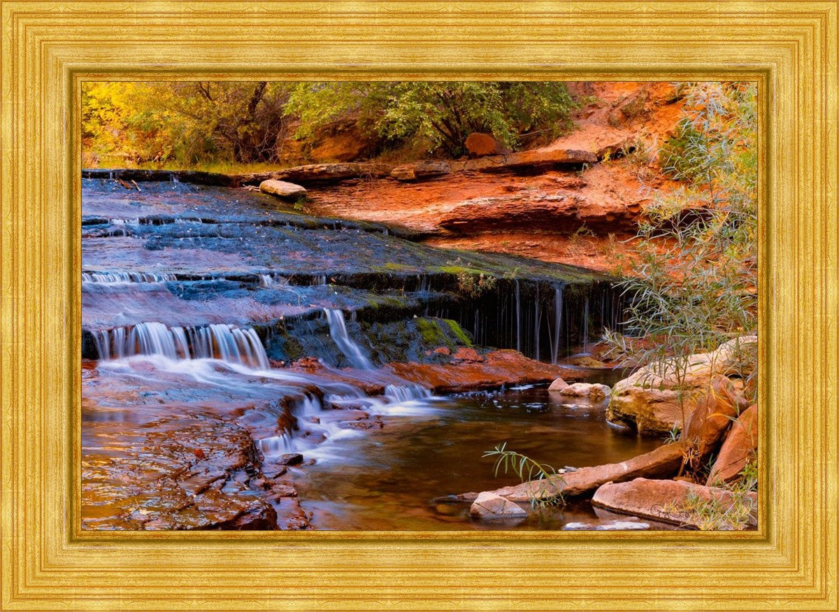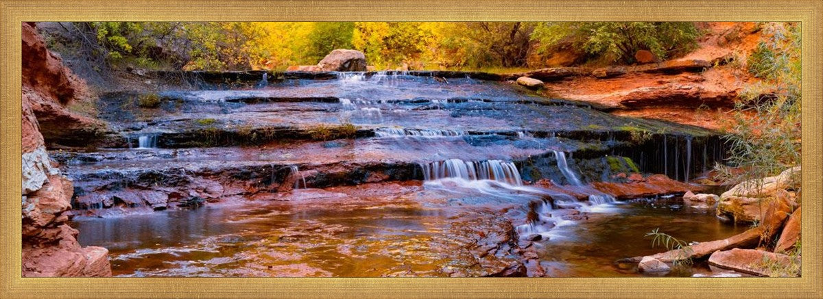The beautiful North Fork stream runs at the bottom of the canyon and passes over a crimson fossilized bed of Kayenta shale. It's called Arch Angel Falls.
