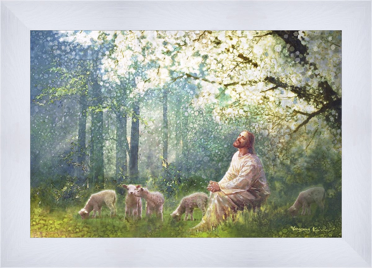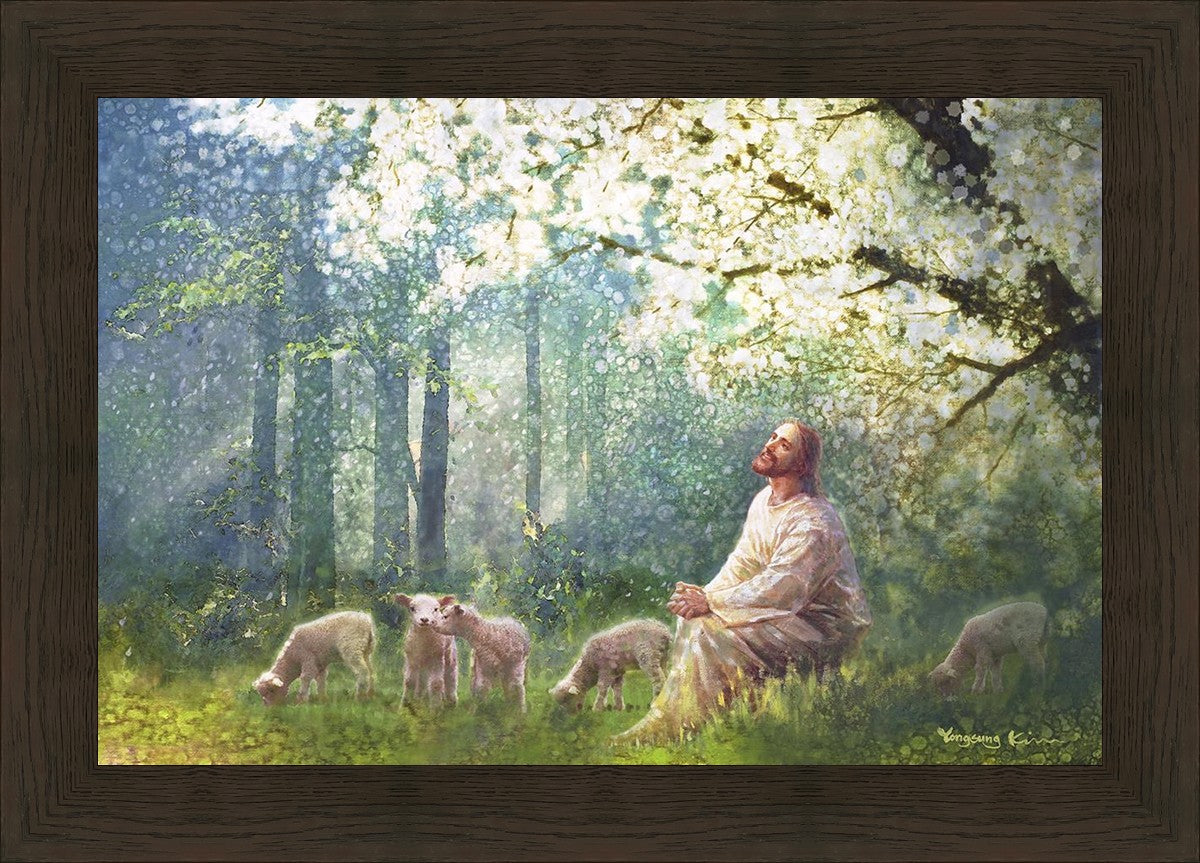 Yong Sung Kim's painting of Sweet is the Work presents Jesus Christ not only as a protector but a caretaker. Here He enjoys time playing beneath a tree nountiful tree with His flock at the edge of an abundant pasture