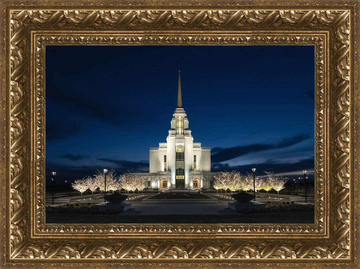 As the cherry trees were in full bloom this last spring and the Temple was preparing for the open house, I was able to capture this shot from the front as the sky turned dark and the Temple lights grew bright.