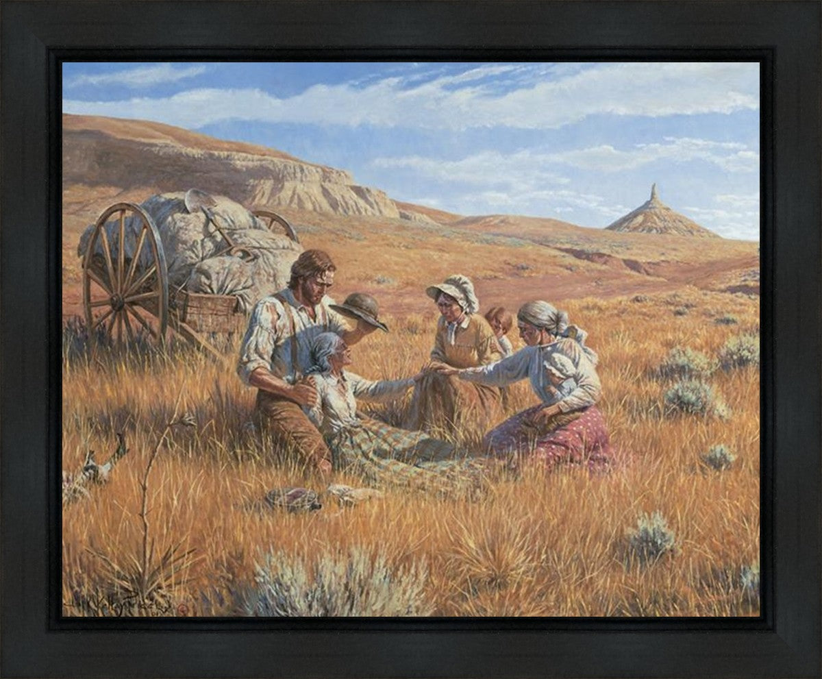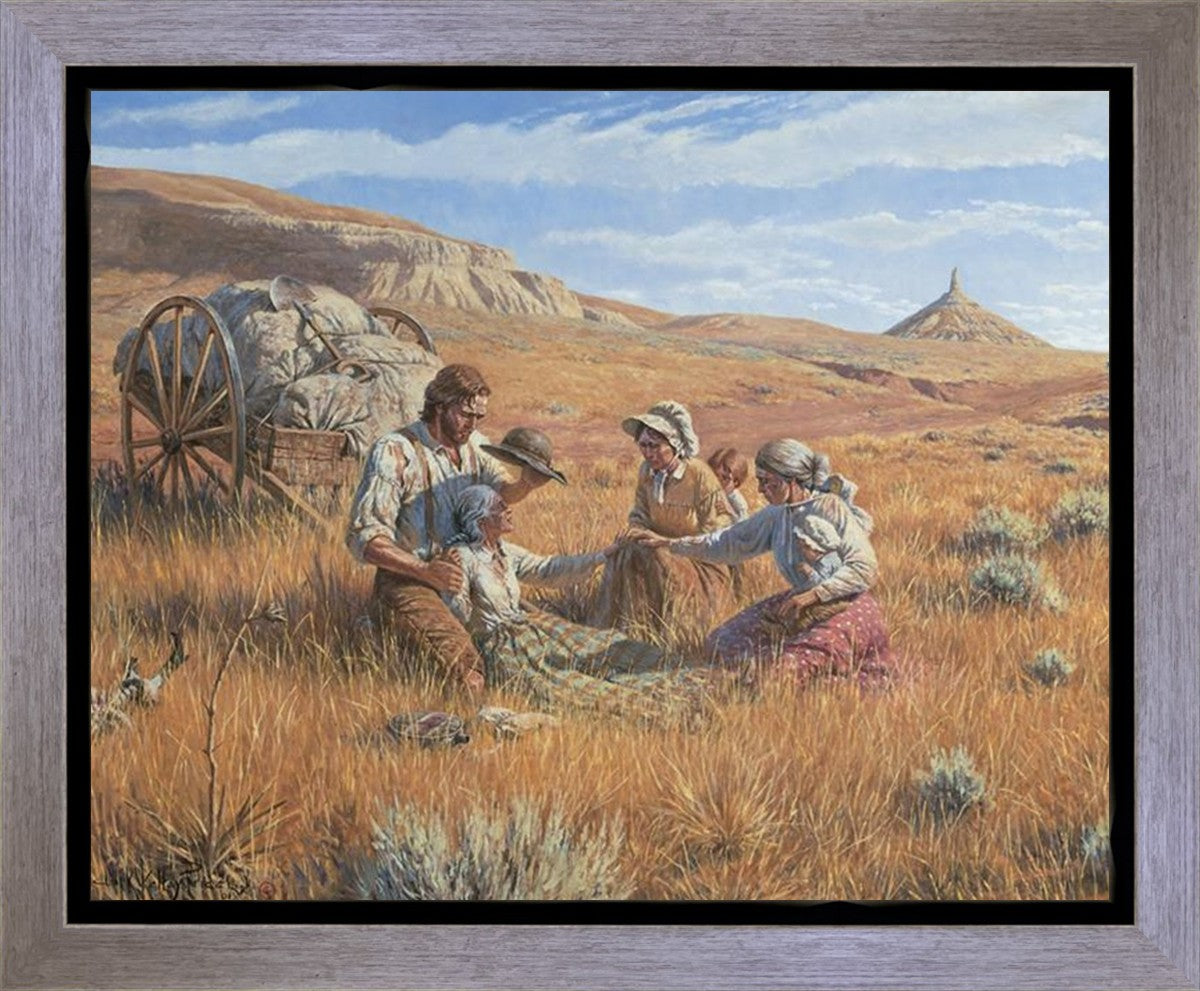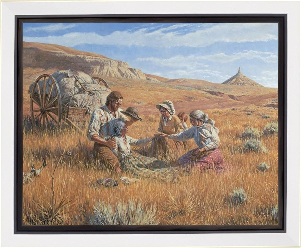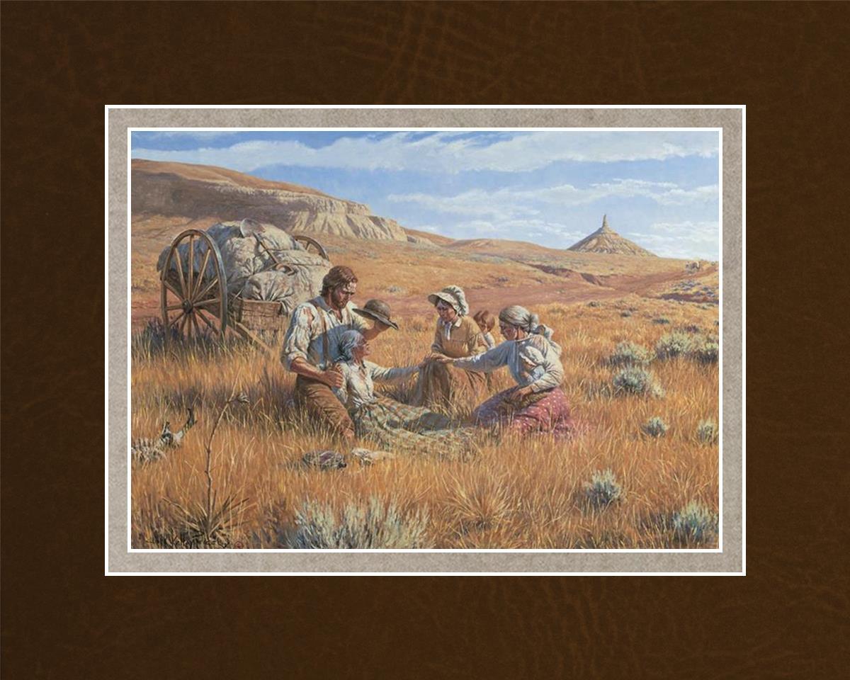 James Steele shades the face of Mary Murray Murdoch, known lovingly as ®Wee Granny.® Mary's physical strength carried her only to Chimney Rock, Nebraska, but her spiritual strength was manifest in her request to have the Steeles tell her son John that she died facing Zion. That testimony still burns in the hearts of her posterity.