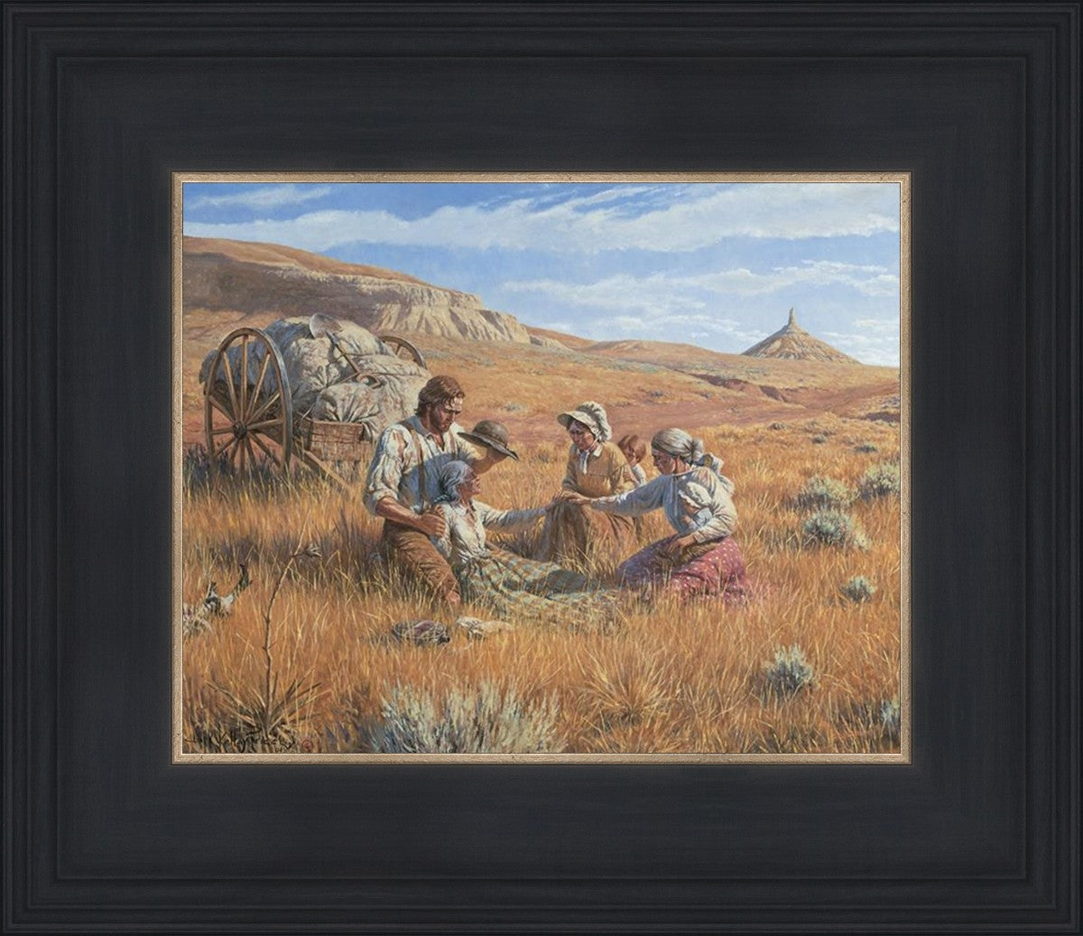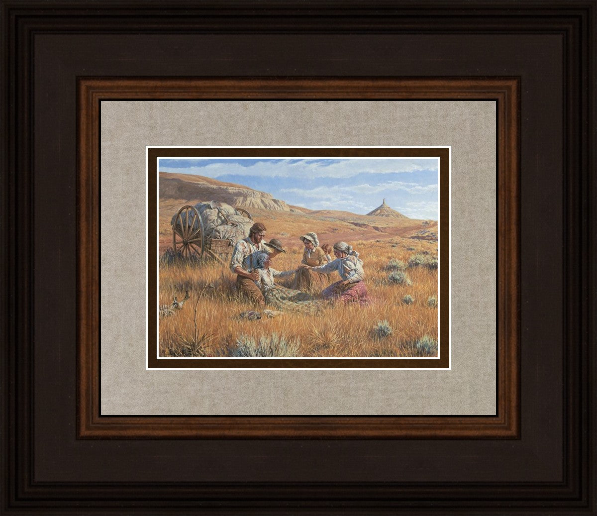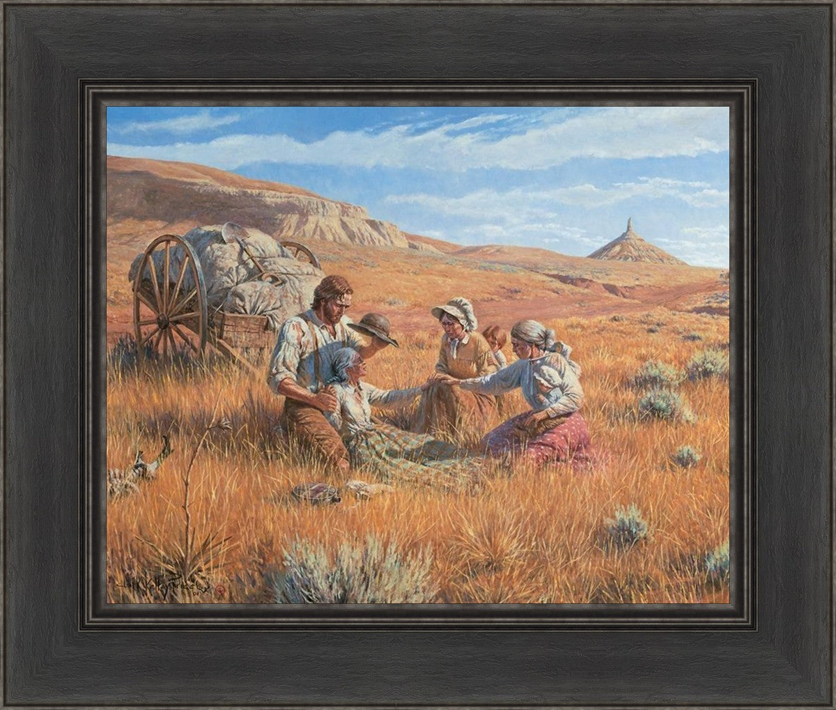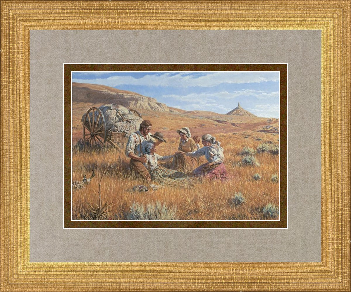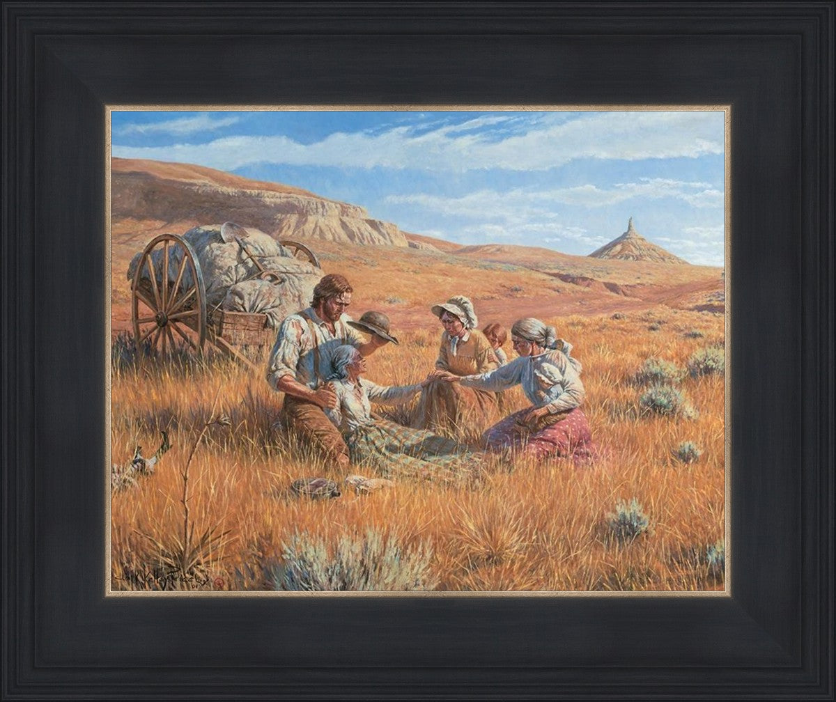 James Steele shades the face of Mary Murray Murdoch, known lovingly as ®Wee Granny.® Mary's physical strength carried her only to Chimney Rock, Nebraska, but her spiritual strength was manifest in her request to have the Steeles tell her son John that she died facing Zion. That testimony still burns in the hearts of her posterity.