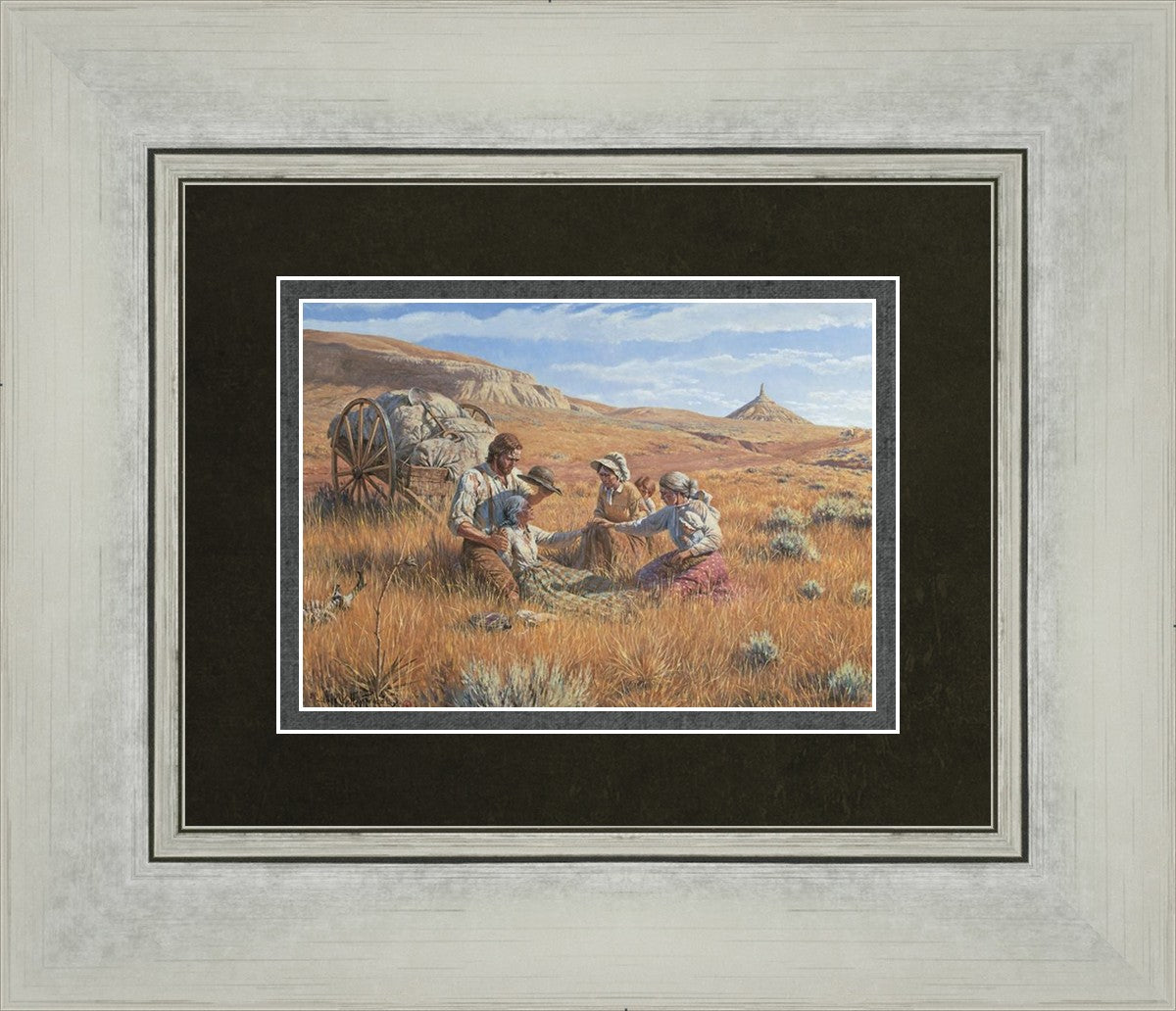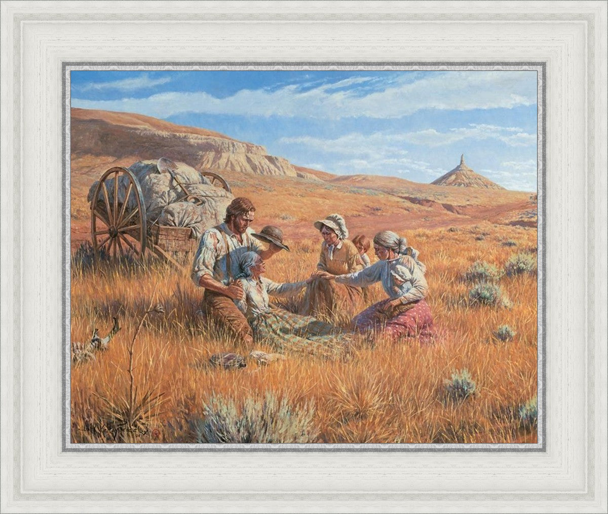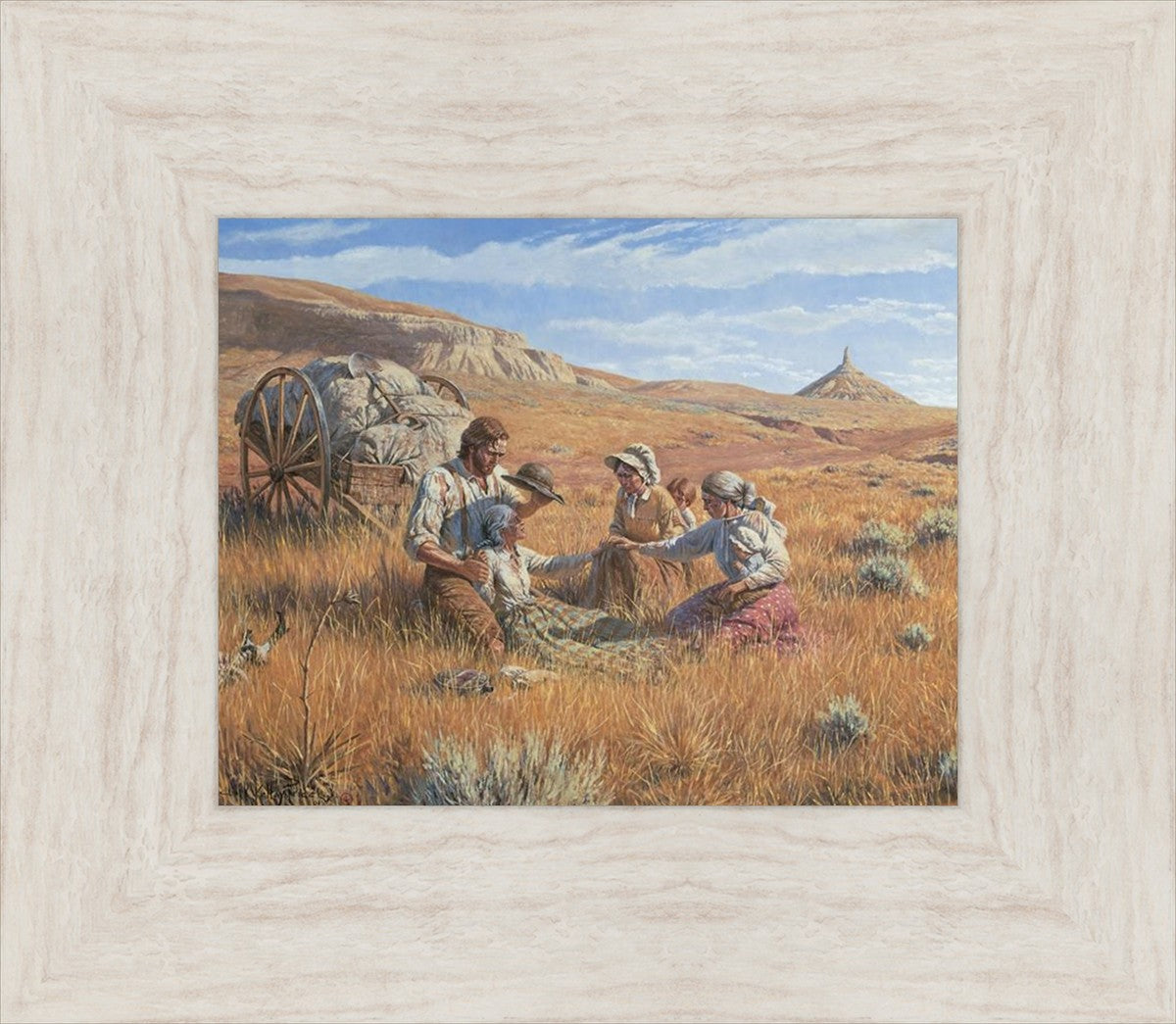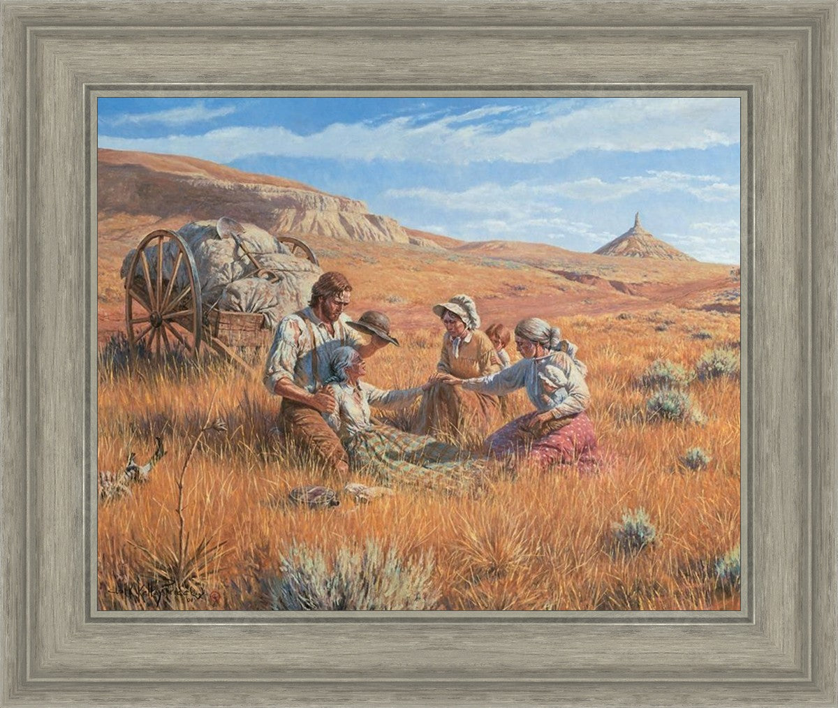 James Steele shades the face of Mary Murray Murdoch, known lovingly as ®Wee Granny.® Mary's physical strength carried her only to Chimney Rock, Nebraska, but her spiritual strength was manifest in her request to have the Steeles tell her son John that she died facing Zion. That testimony still burns in the hearts of her posterity.
