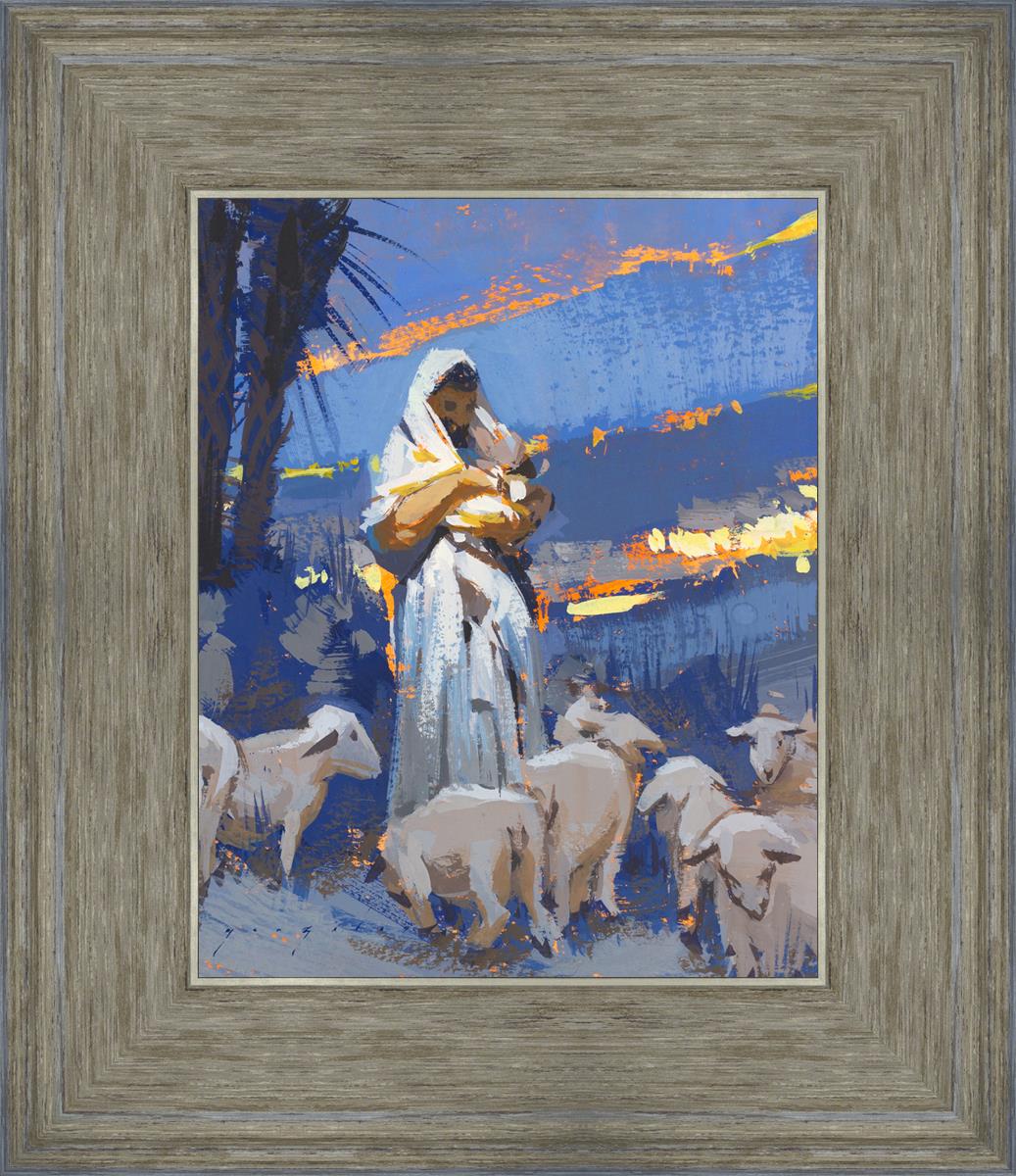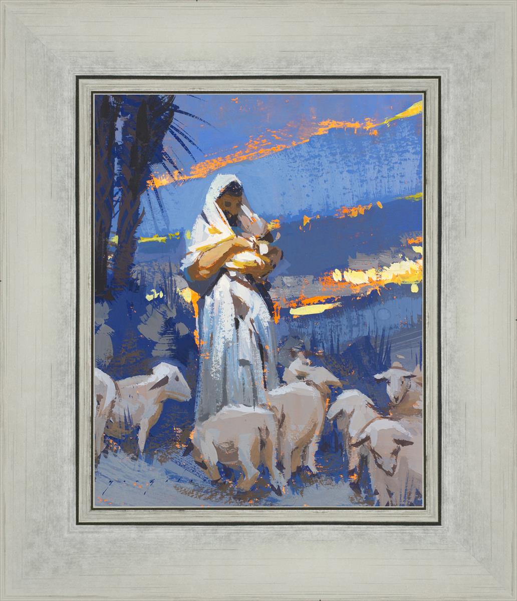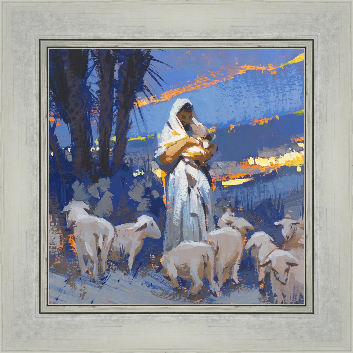 This scene is at night and is an overall cool palette. Christ is centered in frame holding something in his arm and to the left of frame and behind the Shepherd are some palm trees.There are hints of distant lights and some lingering glow of the light setting.