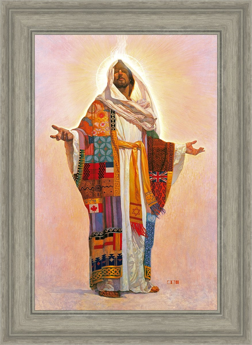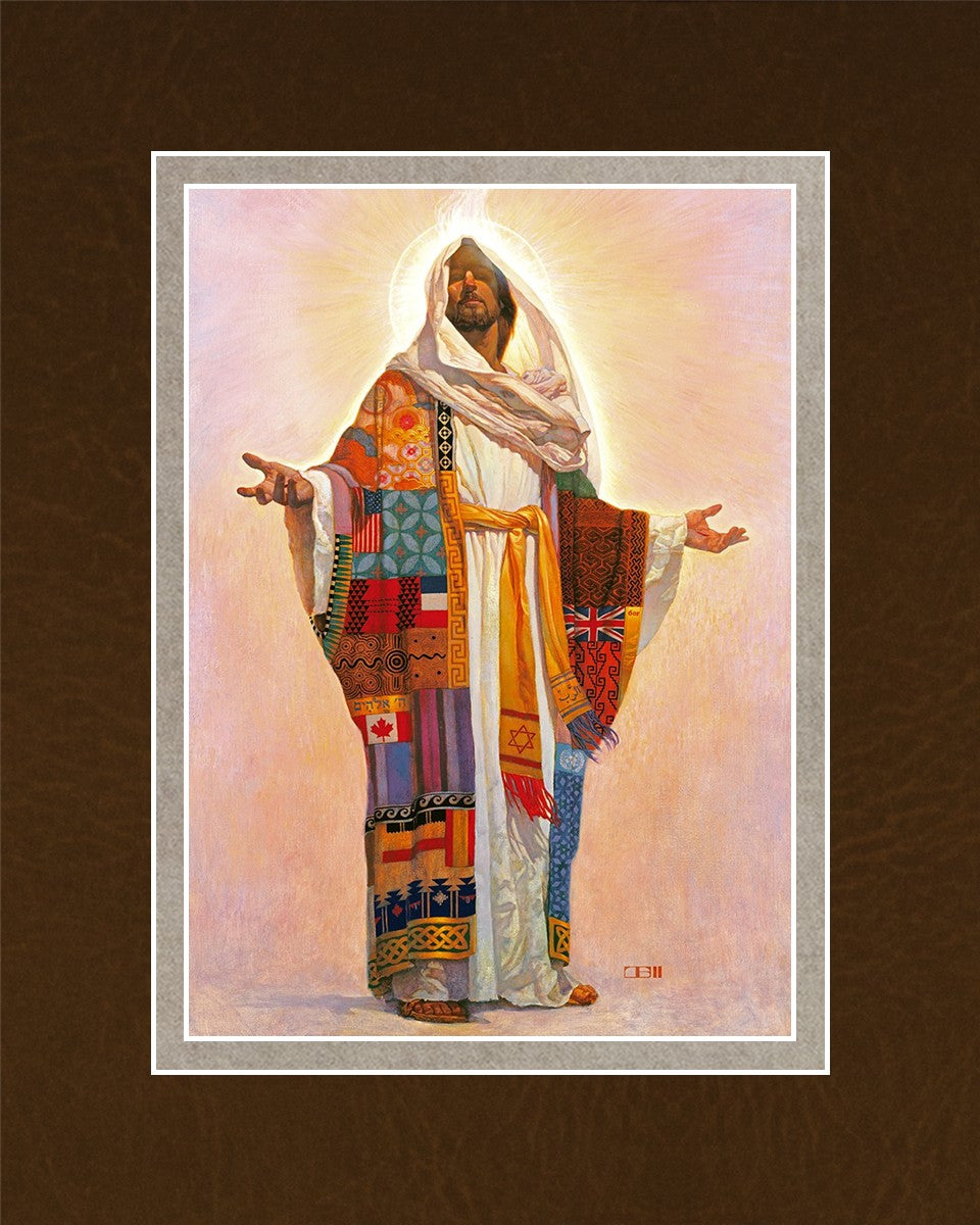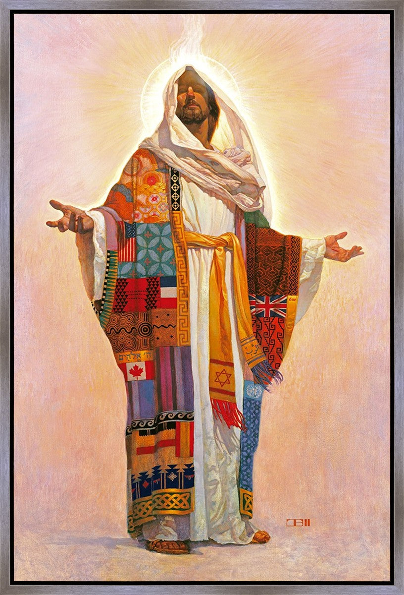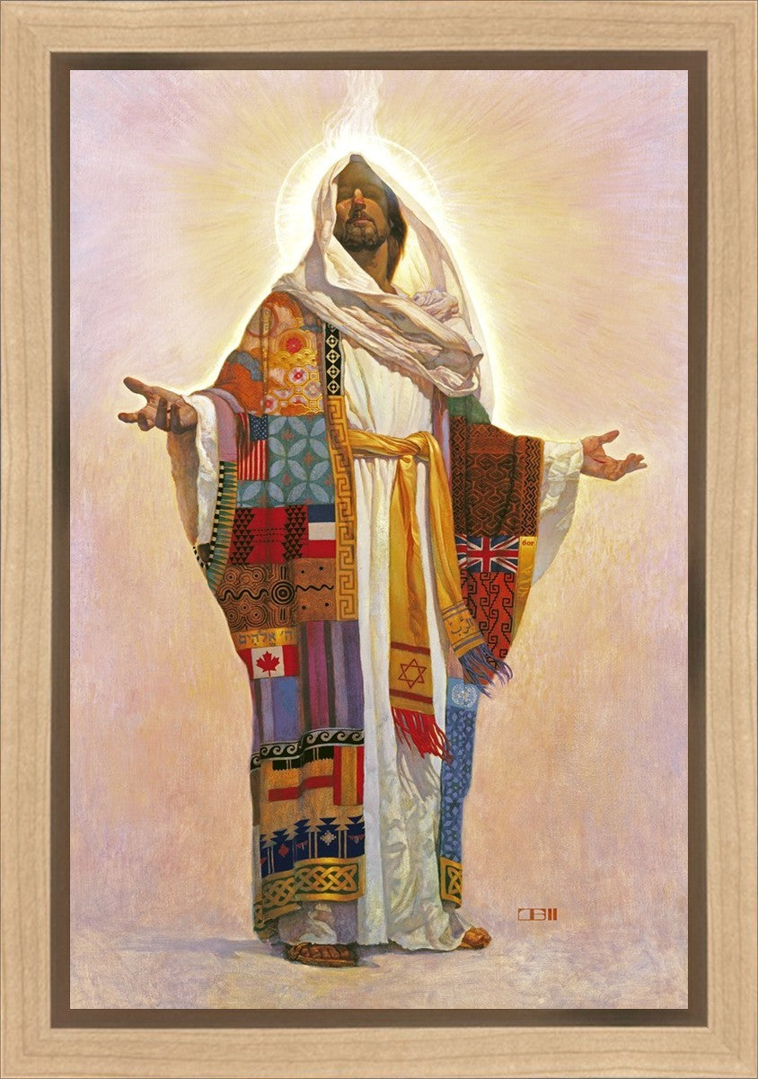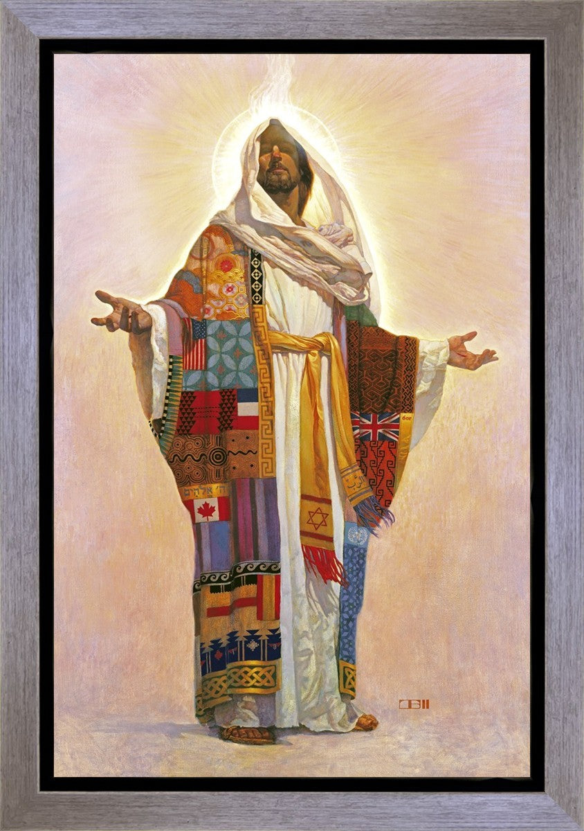 I think we have no concept of how Jesus Christ actually looks; therefore, I have not clearly indicated His features here. Because He is Lord, He represents all the people of the world. On His coat are flags of the nations and fabrics of the cultures of the world. All the colors of the coat represent the sin that He took on Himself on our behalf. The white robe under the coat represents His pureness, His being totally without sin. The golden sash is referred to in Scripture as being worn by royalty. He is truly Lord of All!.