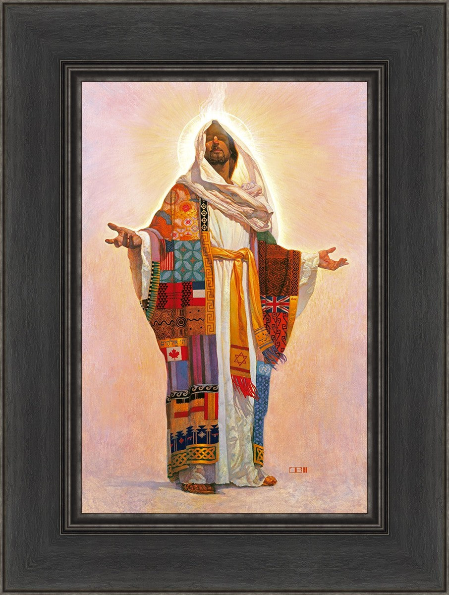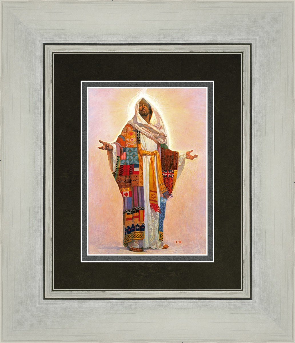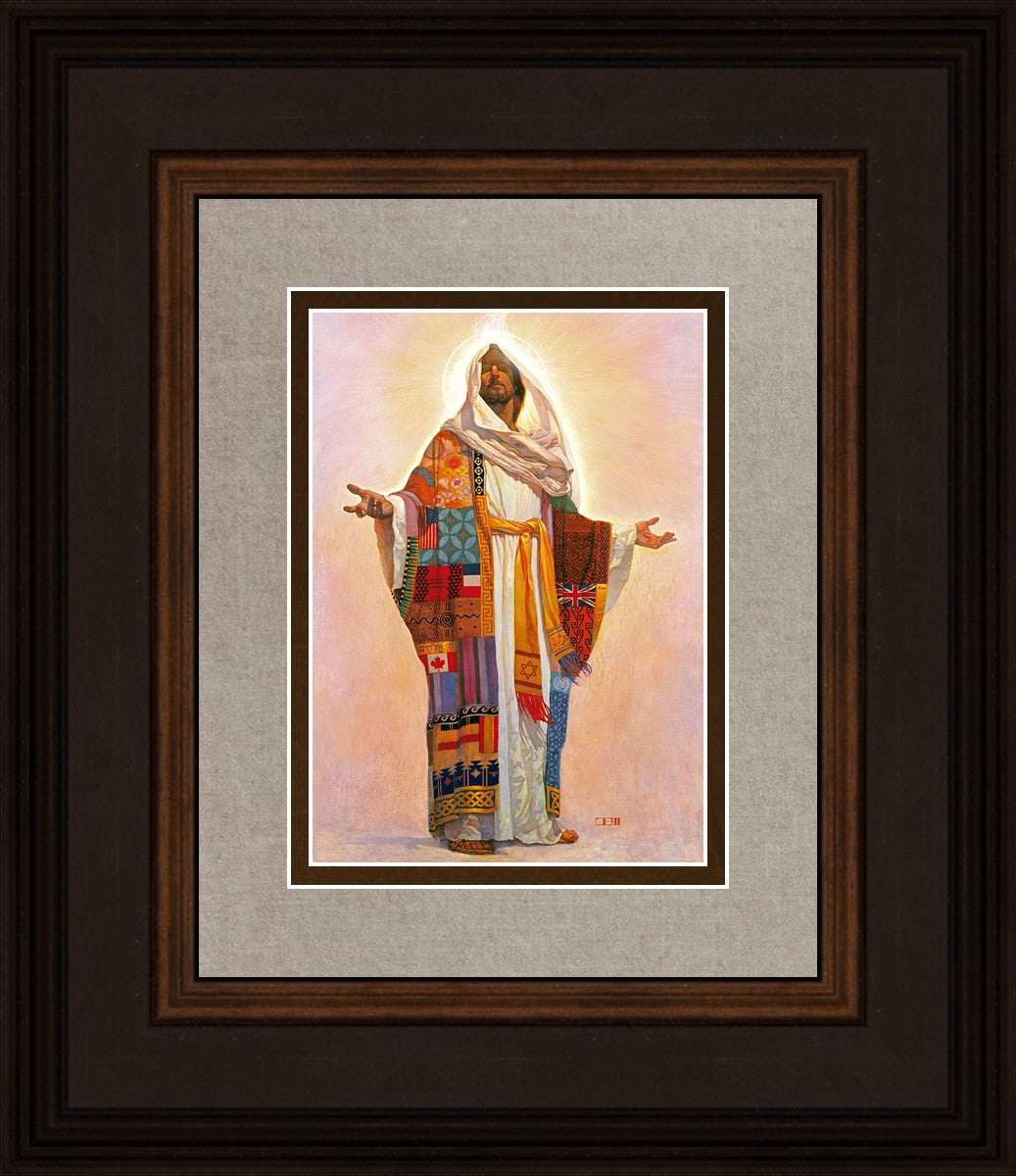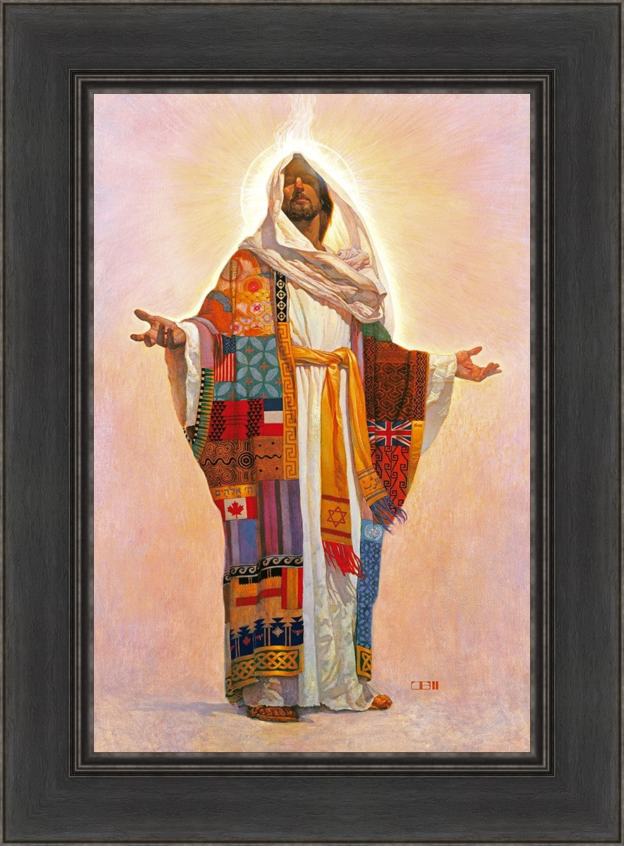 I think we have no concept of how Jesus Christ actually looks; therefore, I have not clearly indicated His features here. Because He is Lord, He represents all the people of the world. On His coat are flags of the nations and fabrics of the cultures of the world. All the colors of the coat represent the sin that He took on Himself on our behalf. The white robe under the coat represents His pureness, His being totally without sin. The golden sash is referred to in Scripture as being worn by royalty. He is truly Lord of All!.