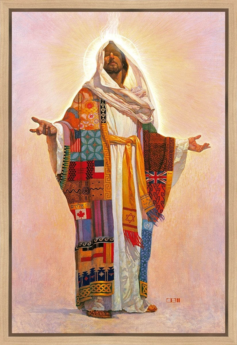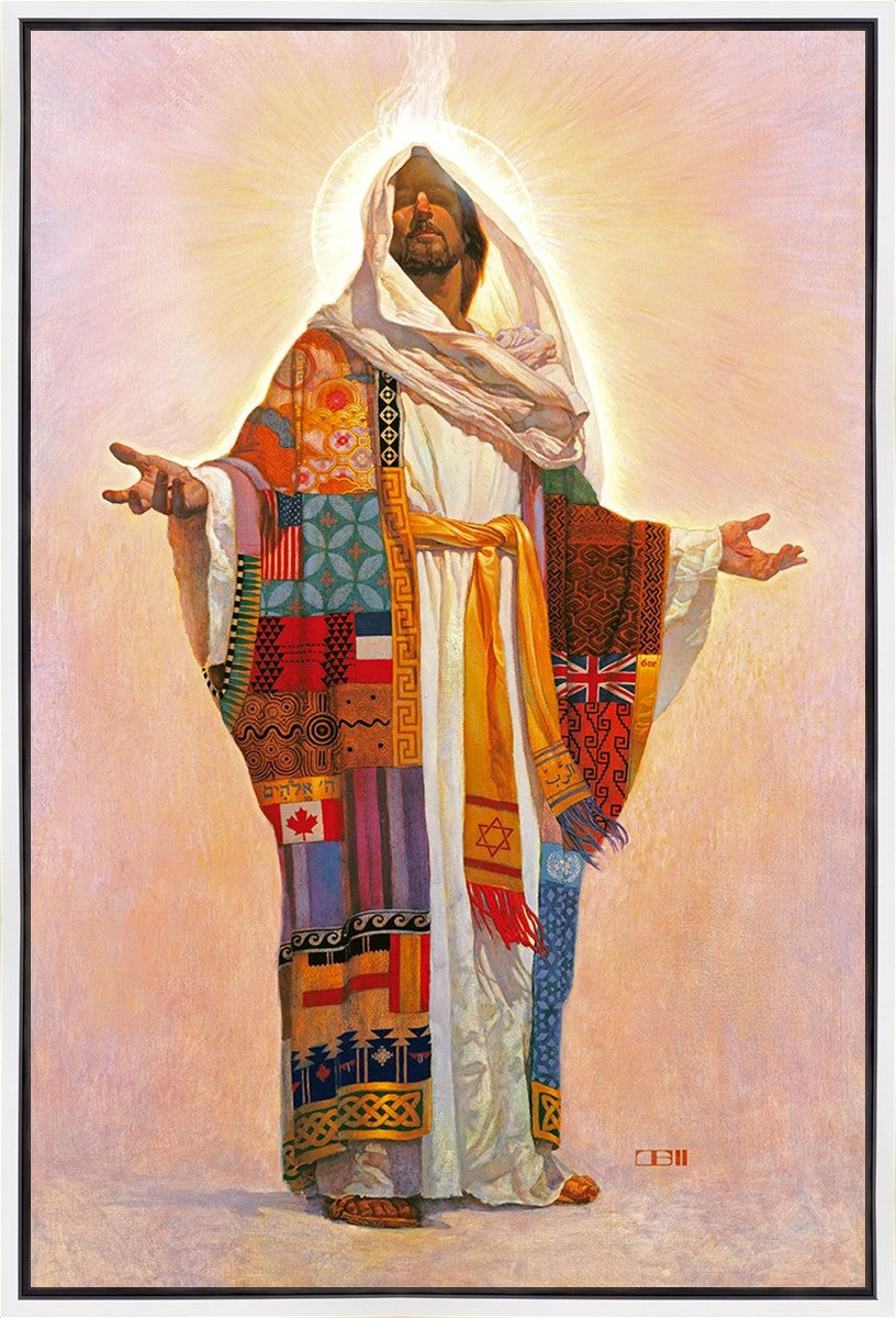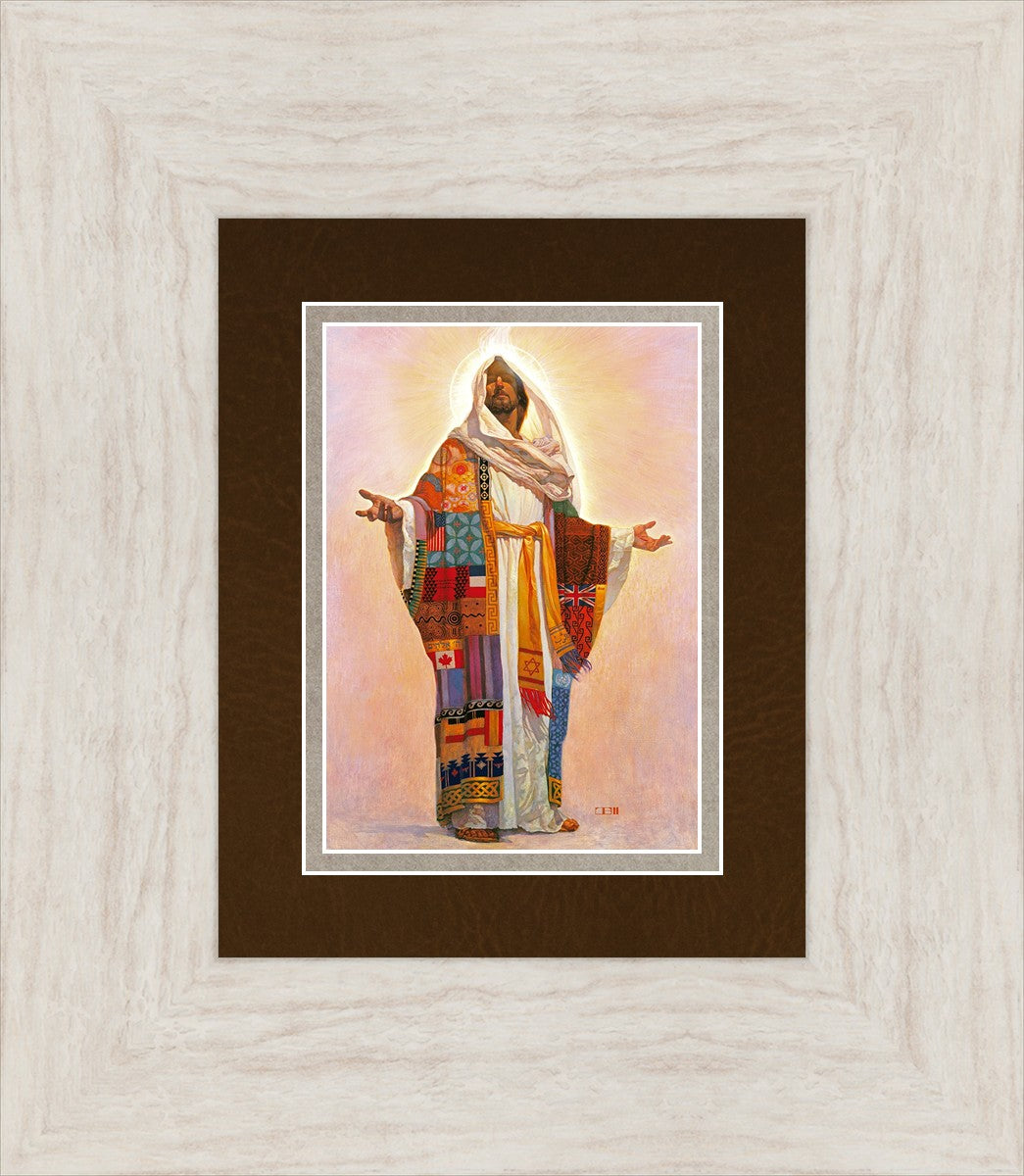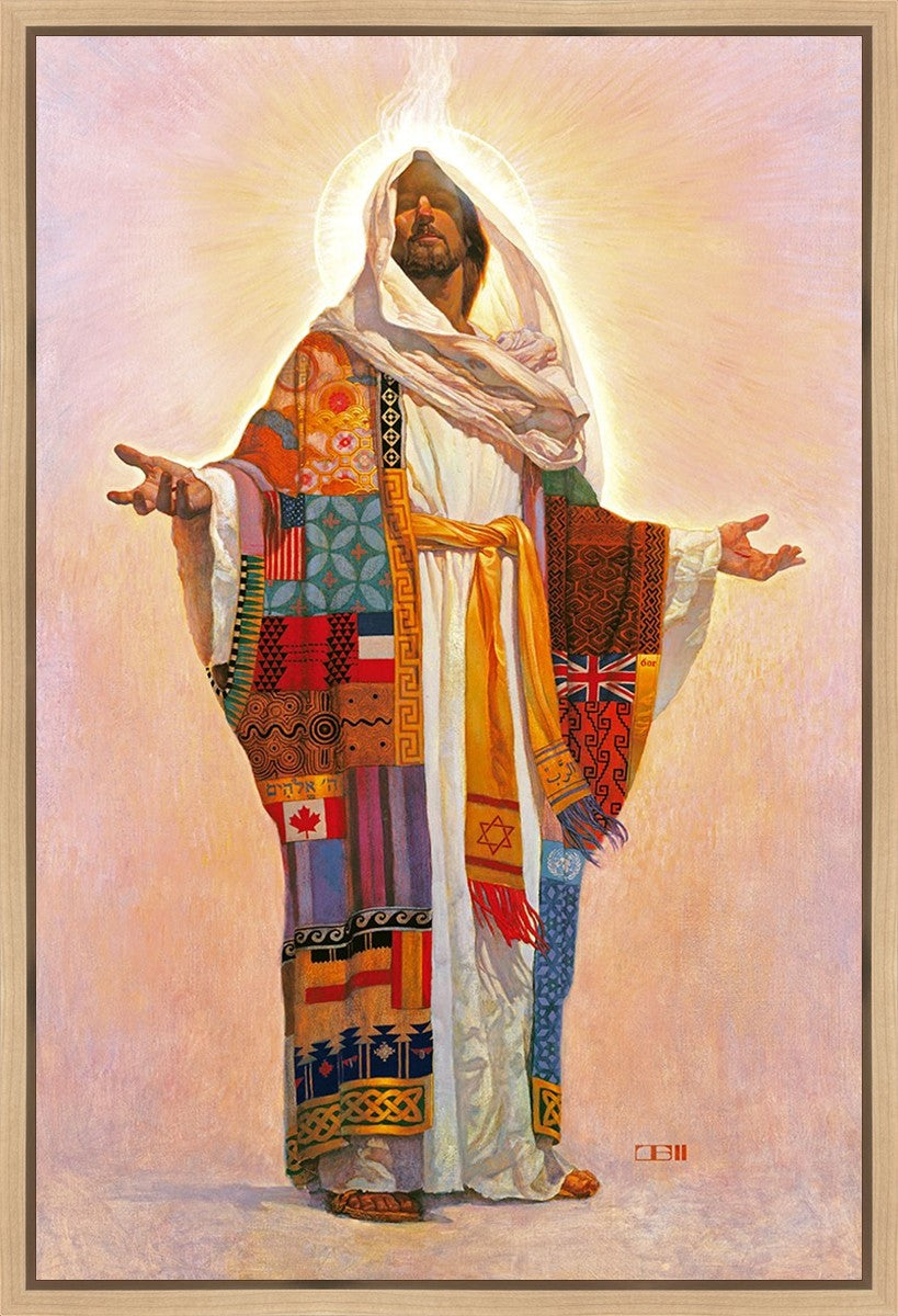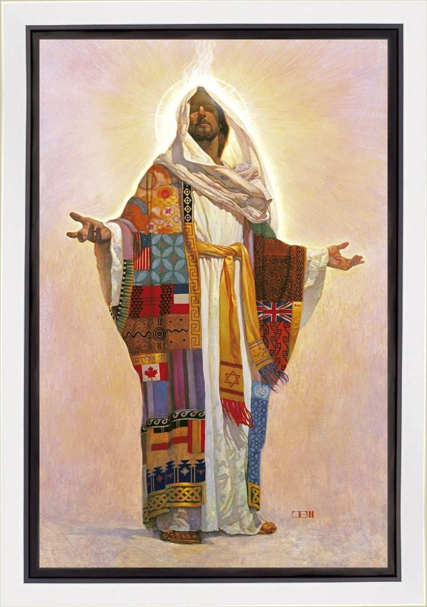 I think we have no concept of how Jesus Christ actually looks; therefore, I have not clearly indicated His features here. Because He is Lord, He represents all the people of the world. On His coat are flags of the nations and fabrics of the cultures of the world. All the colors of the coat represent the sin that He took on Himself on our behalf. The white robe under the coat represents His pureness, His being totally without sin. The golden sash is referred to in Scripture as being worn by royalty. He is truly Lord of All!.