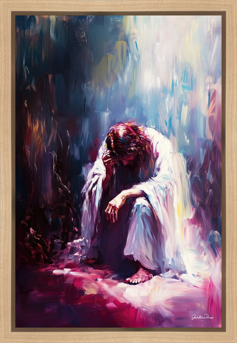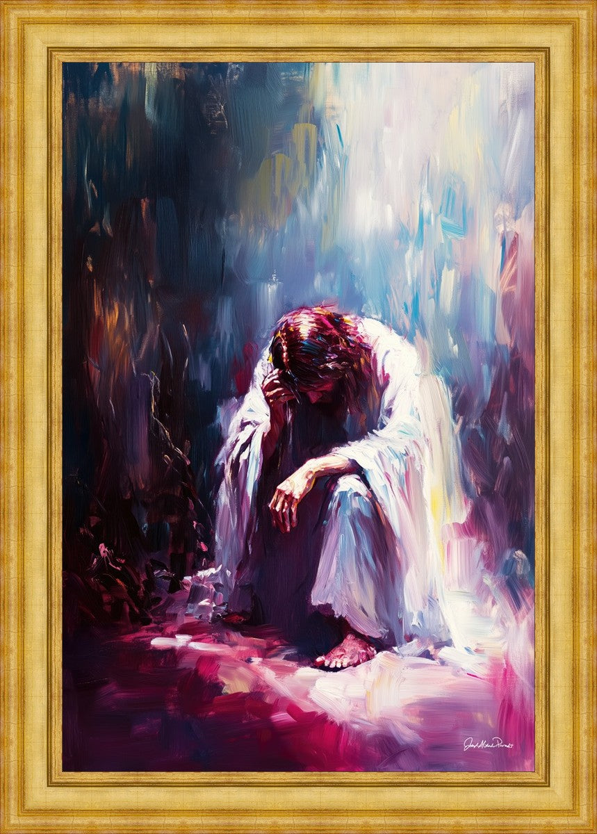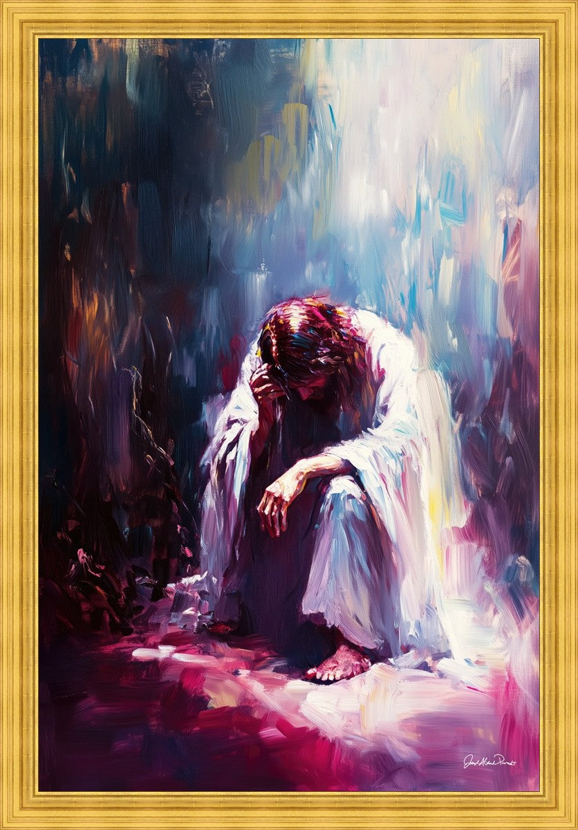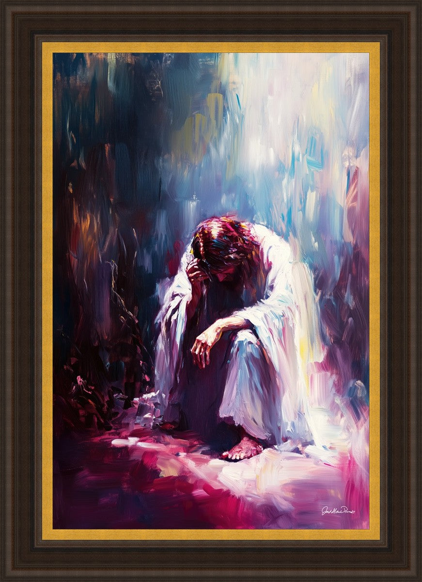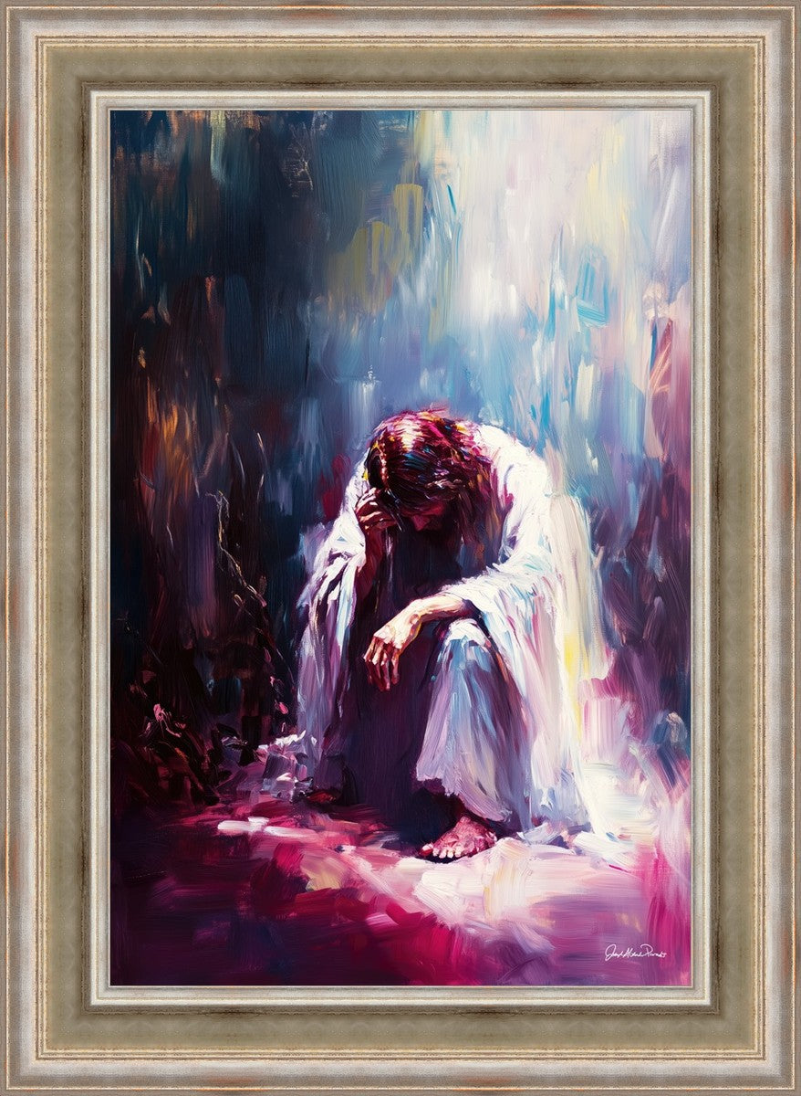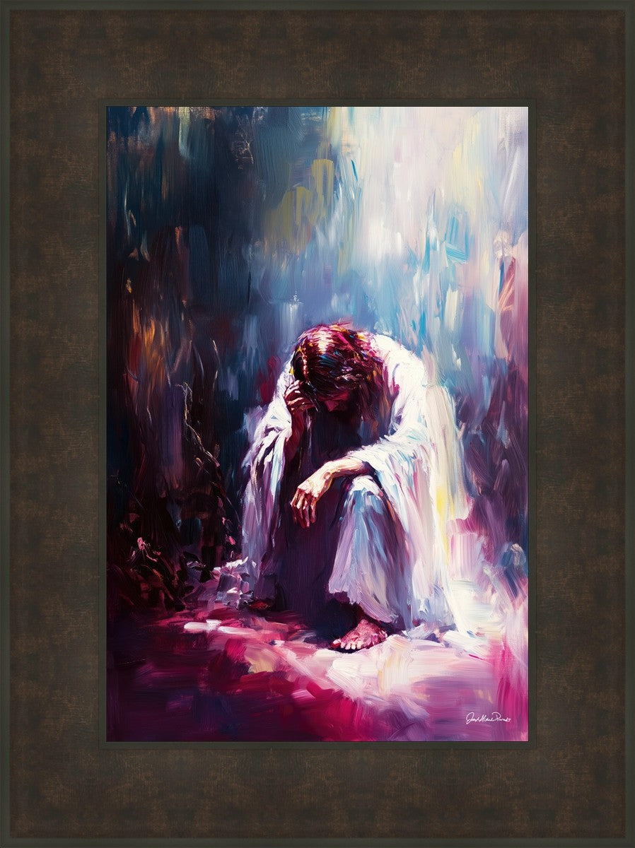 This artwork is a very intimate and poignant moment depicting the Lord resting between His miracle of performing the Atonement in the Garden of Gethsemane, having drunk from that bitter cup. It is a heartfelt reminder of what the Lord did for each of us, and is meant to invoke gratitude for His ultimate act of charity.