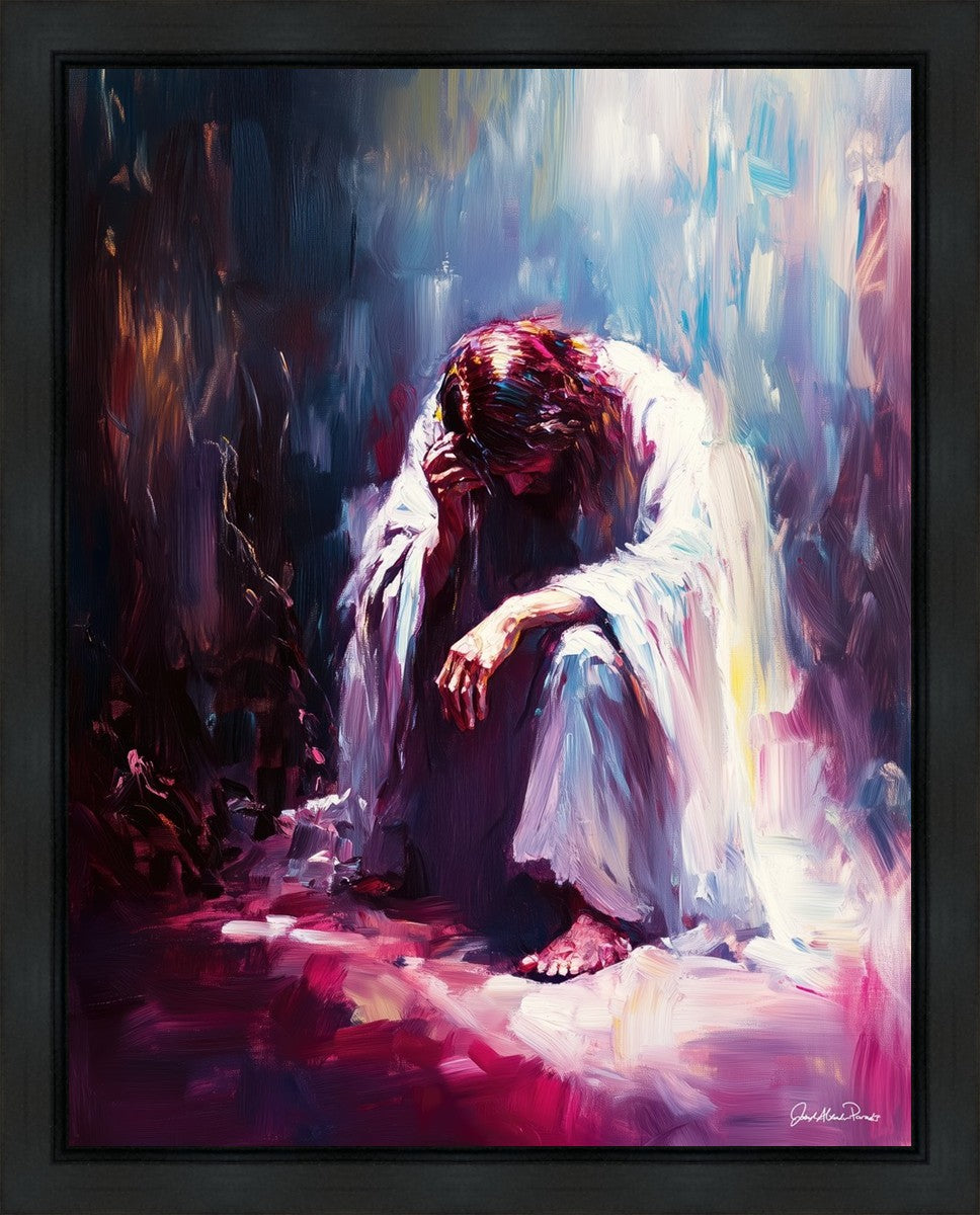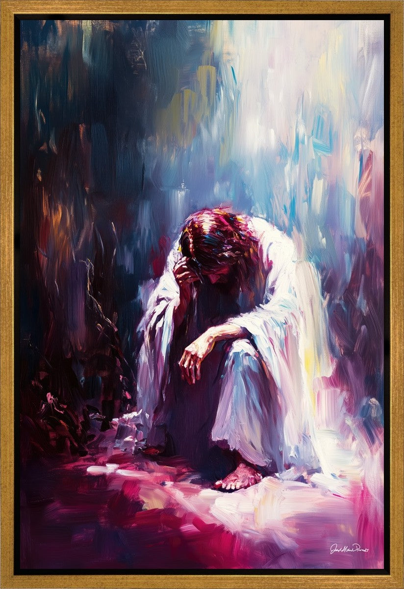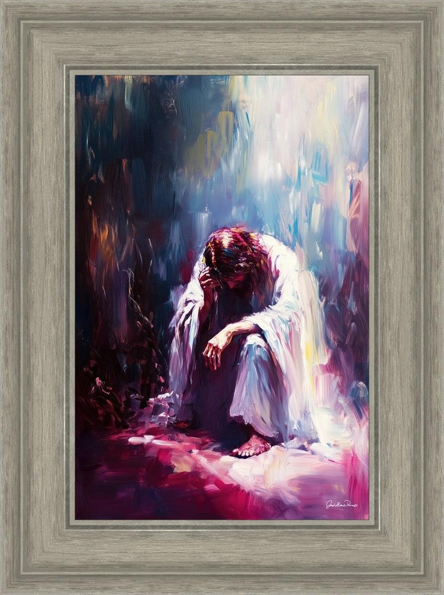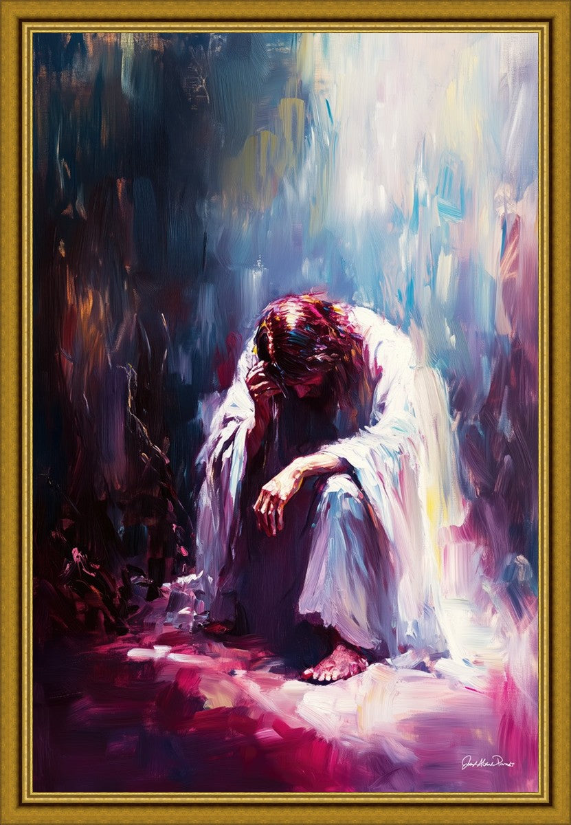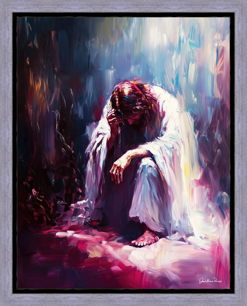 This artwork is a very intimate and poignant moment depicting the Lord resting between His miracle of performing the Atonement in the Garden of Gethsemane, having drunk from that bitter cup. It is a heartfelt reminder of what the Lord did for each of us, and is meant to invoke gratitude for His ultimate act of charity.