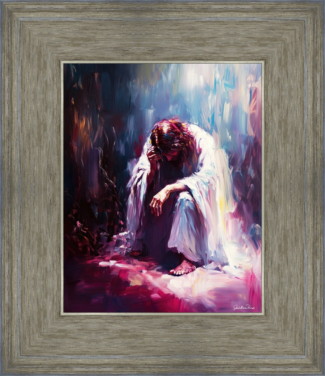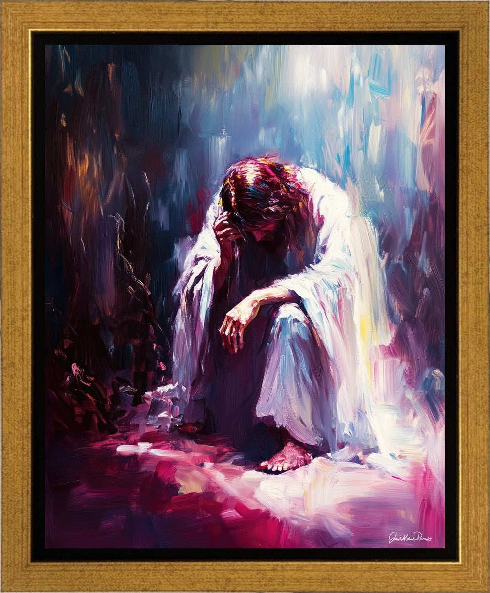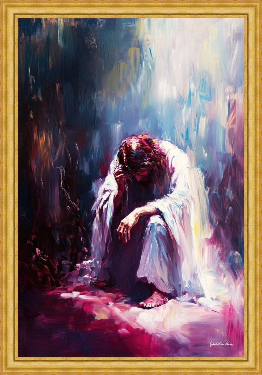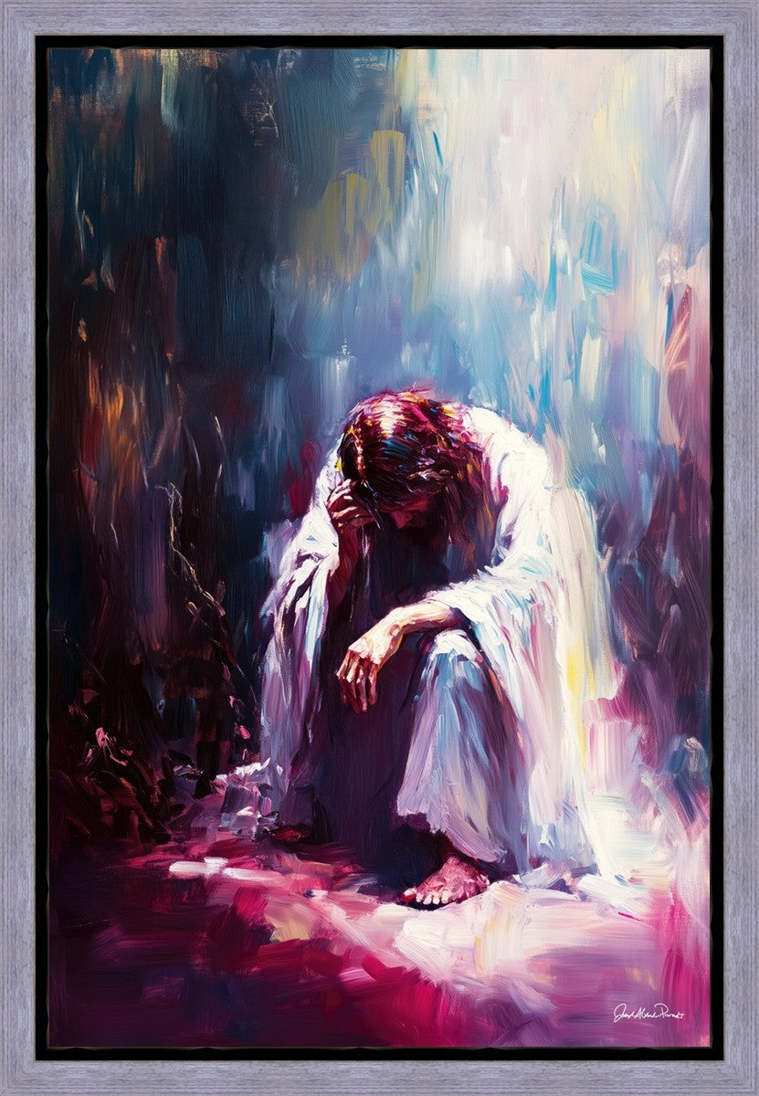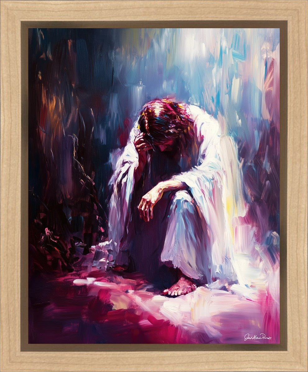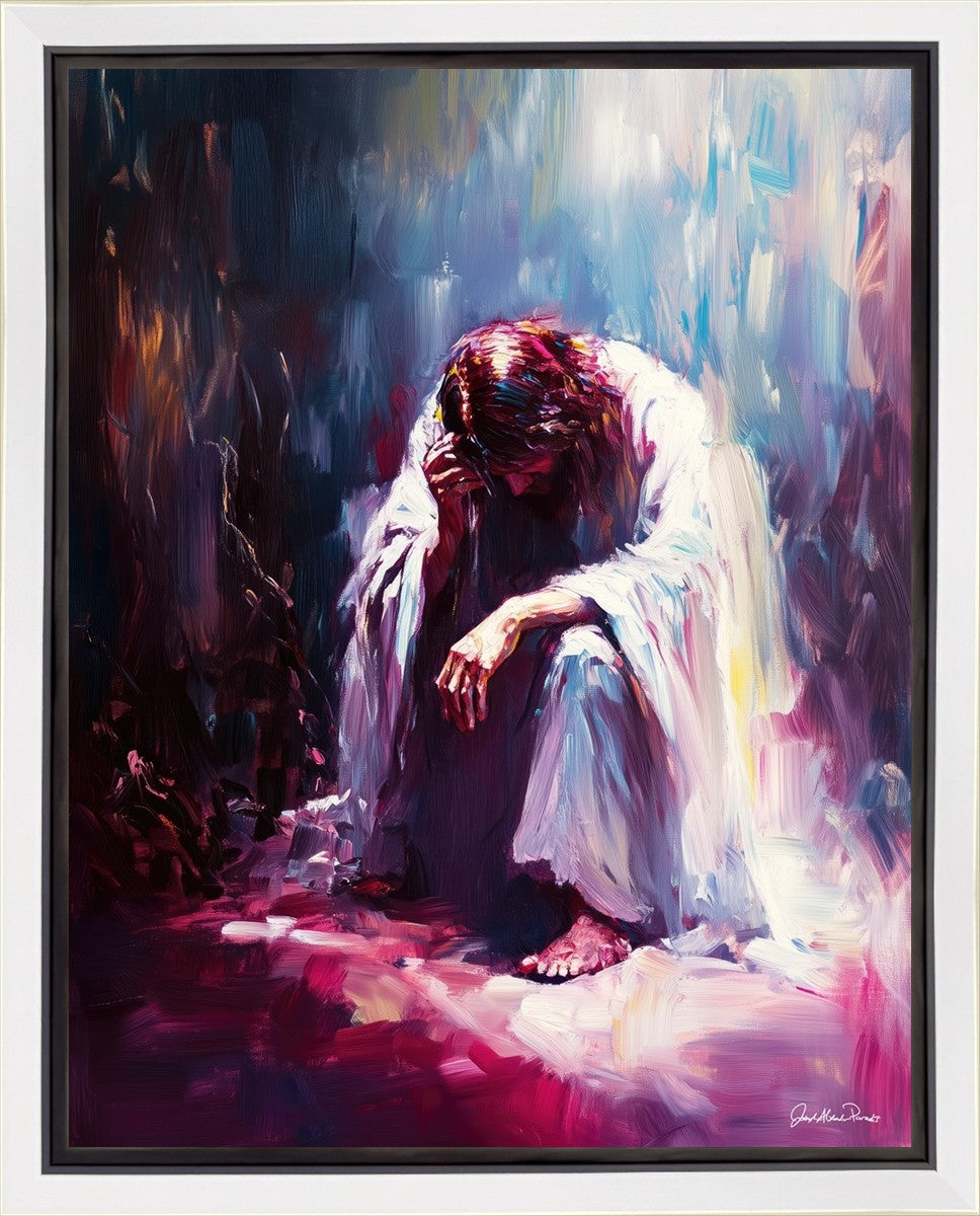 This artwork is a very intimate and poignant moment depicting the Lord resting between His miracle of performing the Atonement in the Garden of Gethsemane, having drunk from that bitter cup. It is a heartfelt reminder of what the Lord did for each of us, and is meant to invoke gratitude for His ultimate act of charity.