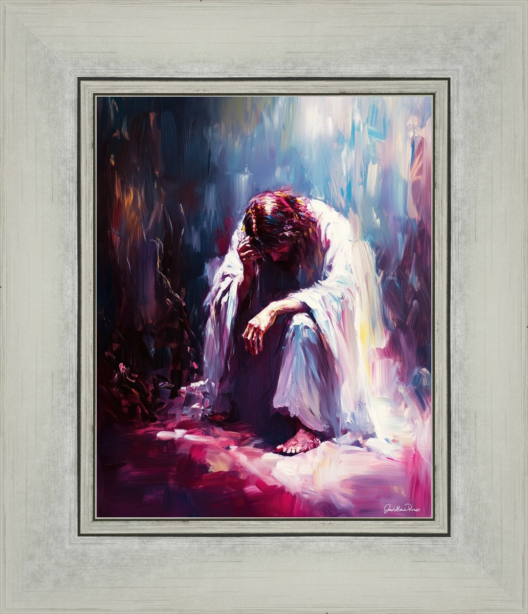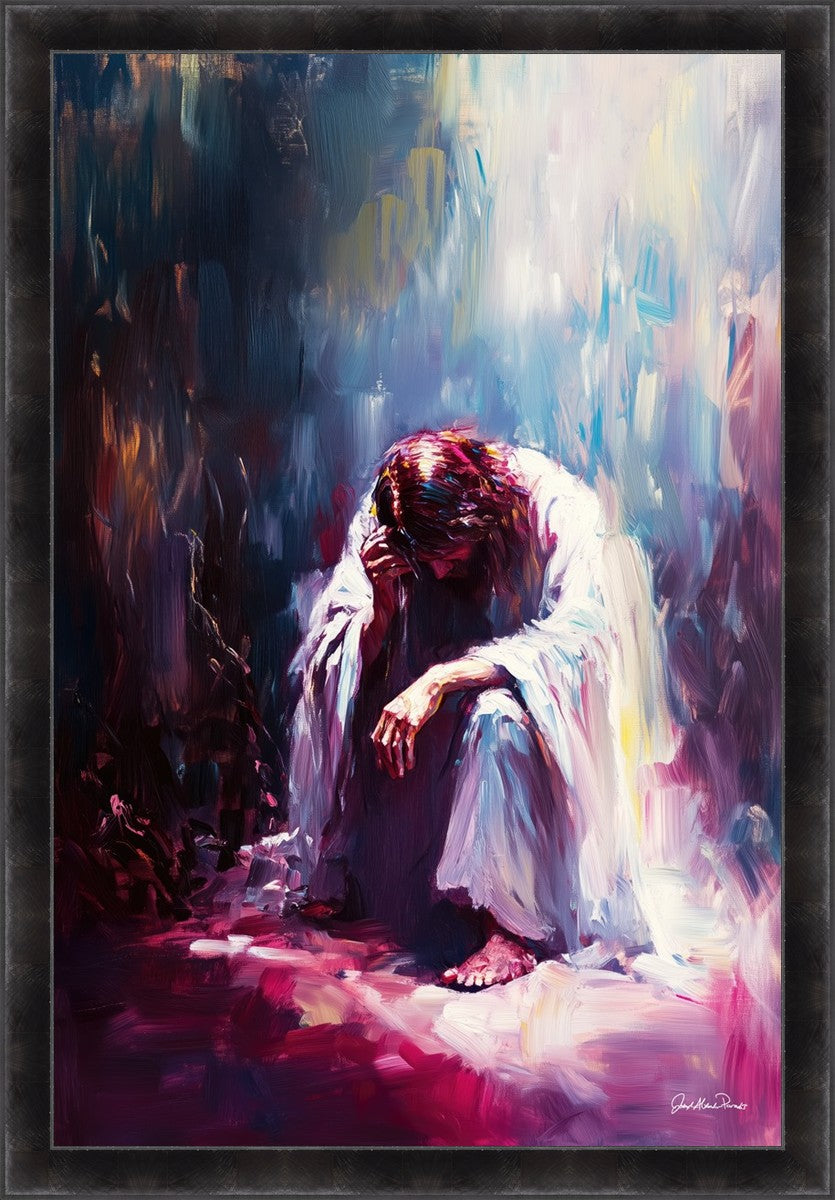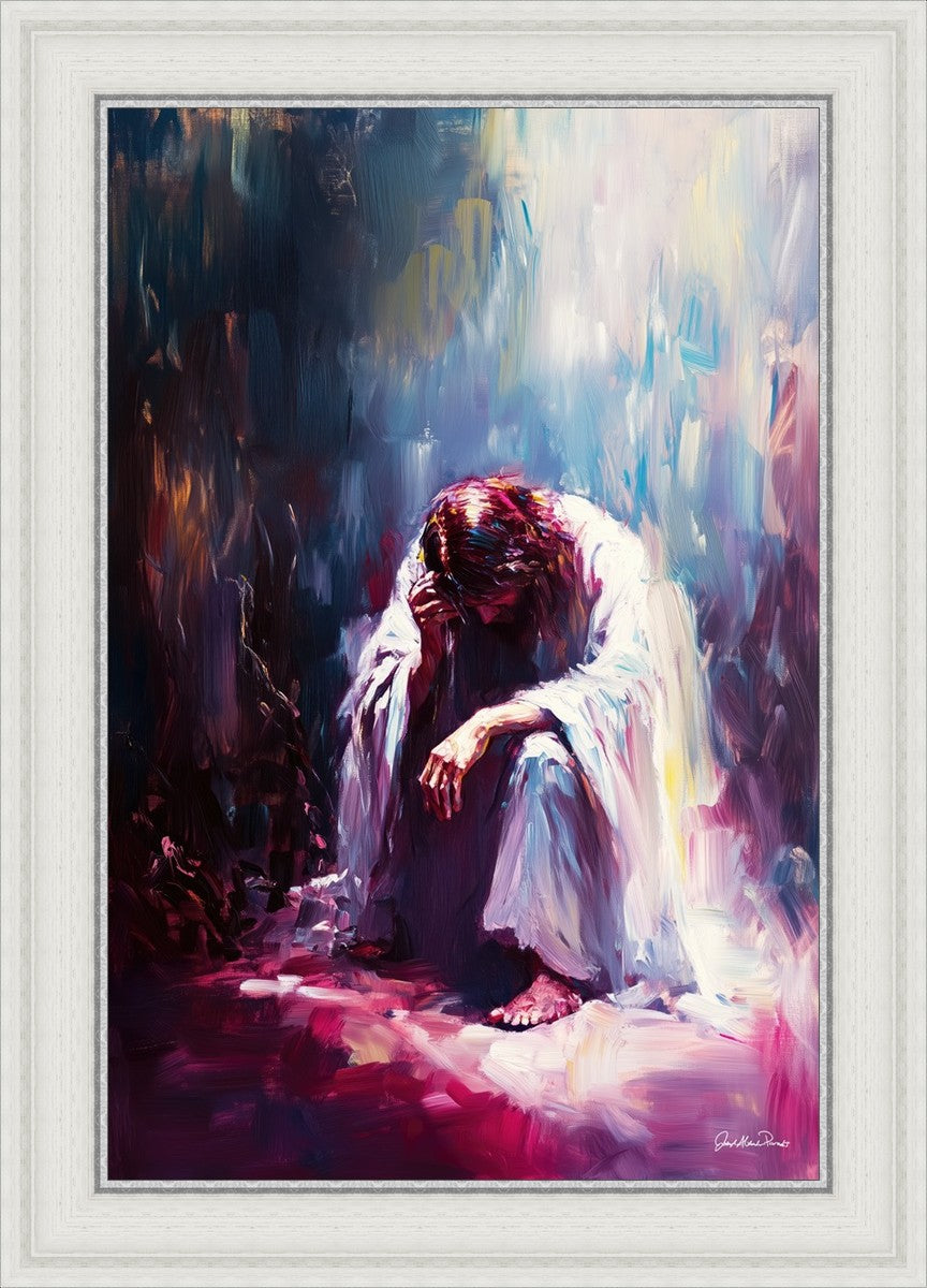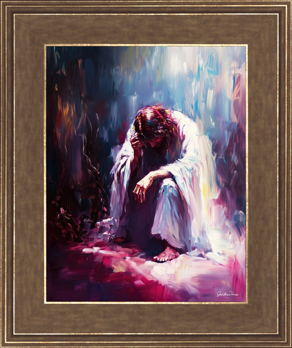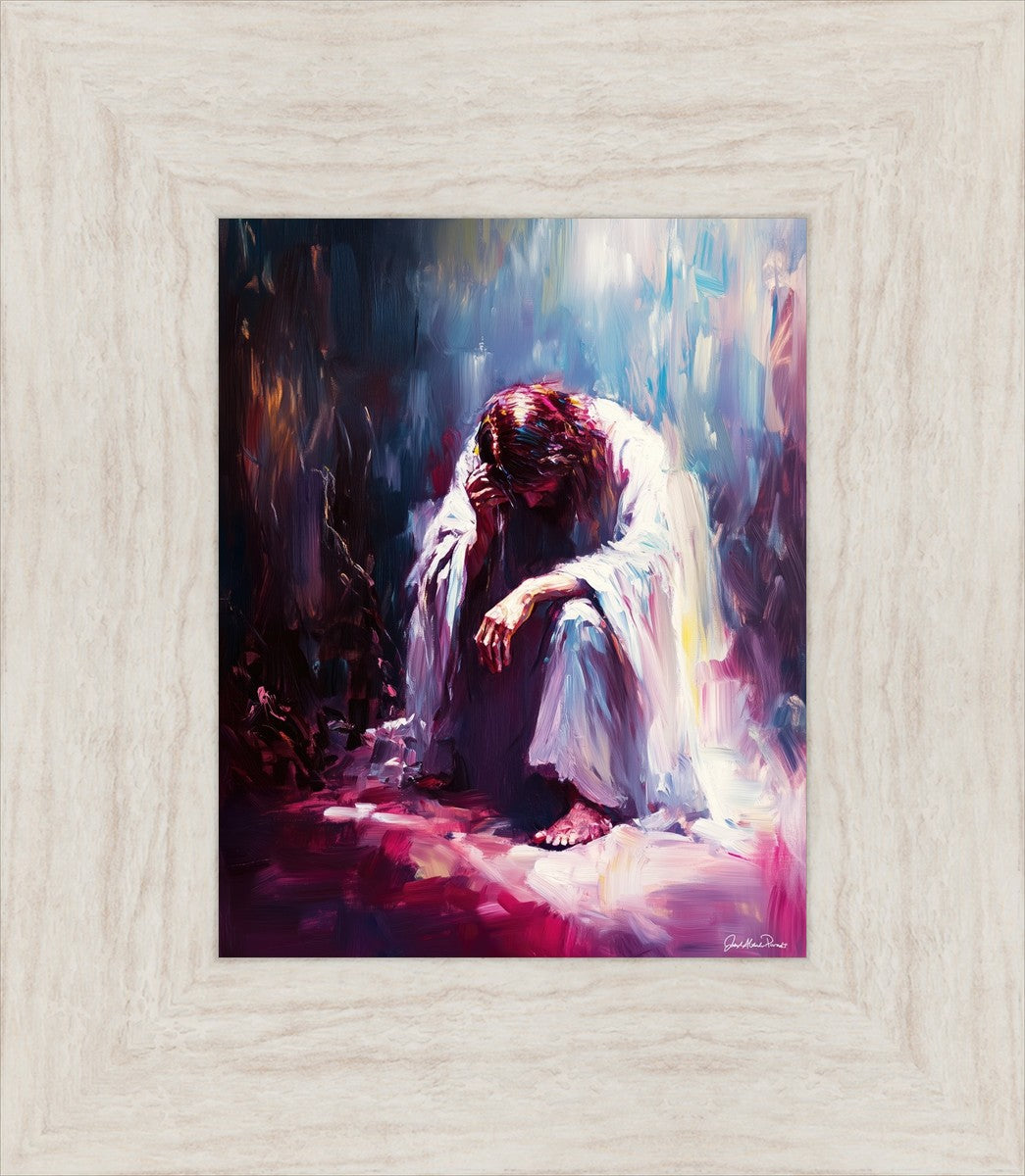 This artwork is a very intimate and poignant moment depicting the Lord resting between His miracle of performing the Atonement in the Garden of Gethsemane, having drunk from that bitter cup. It is a heartfelt reminder of what the Lord did for each of us, and is meant to invoke gratitude for His ultimate act of charity.