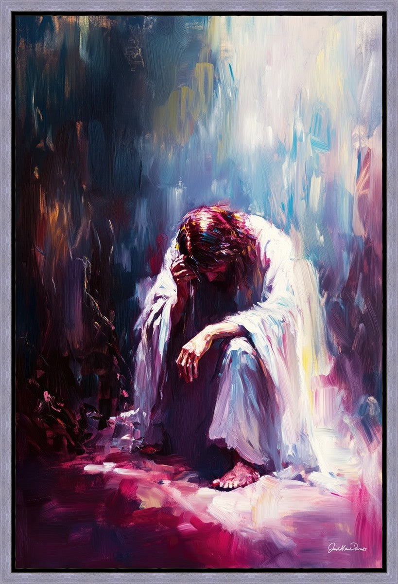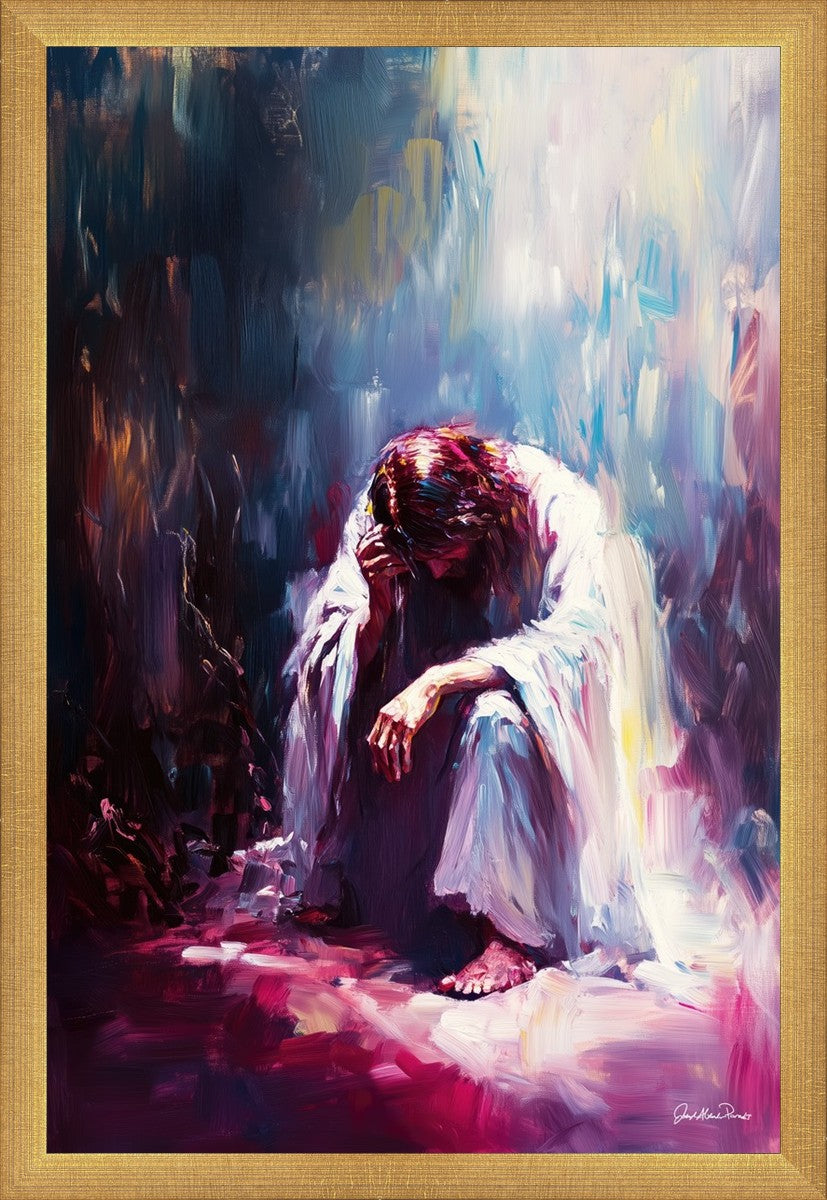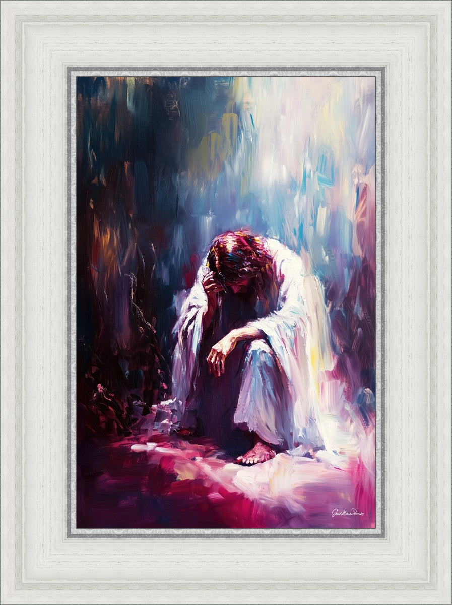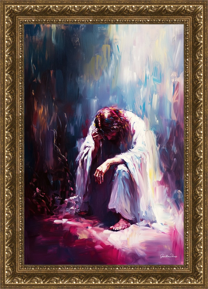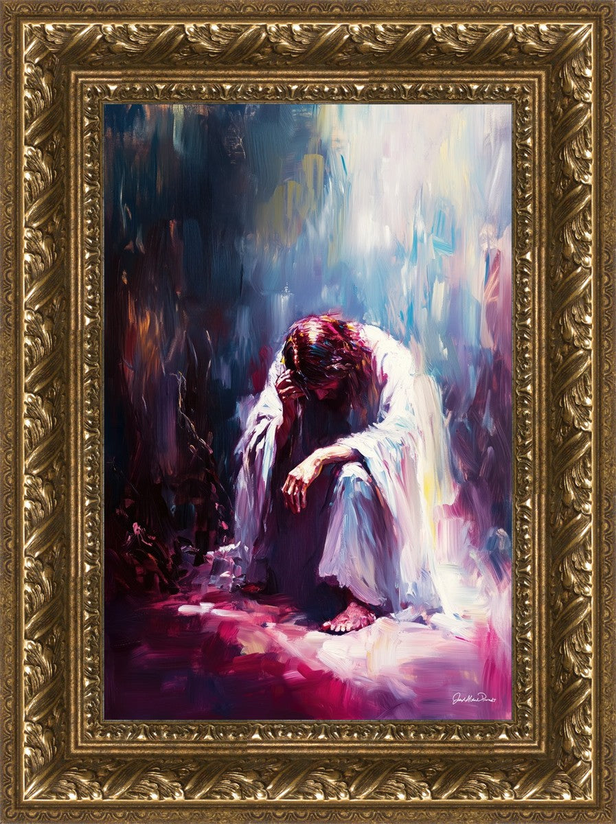 This artwork is a very intimate and poignant moment depicting the Lord resting between His miracle of performing the Atonement in the Garden of Gethsemane, having drunk from that bitter cup. It is a heartfelt reminder of what the Lord did for each of us, and is meant to invoke gratitude for His ultimate act of charity.
