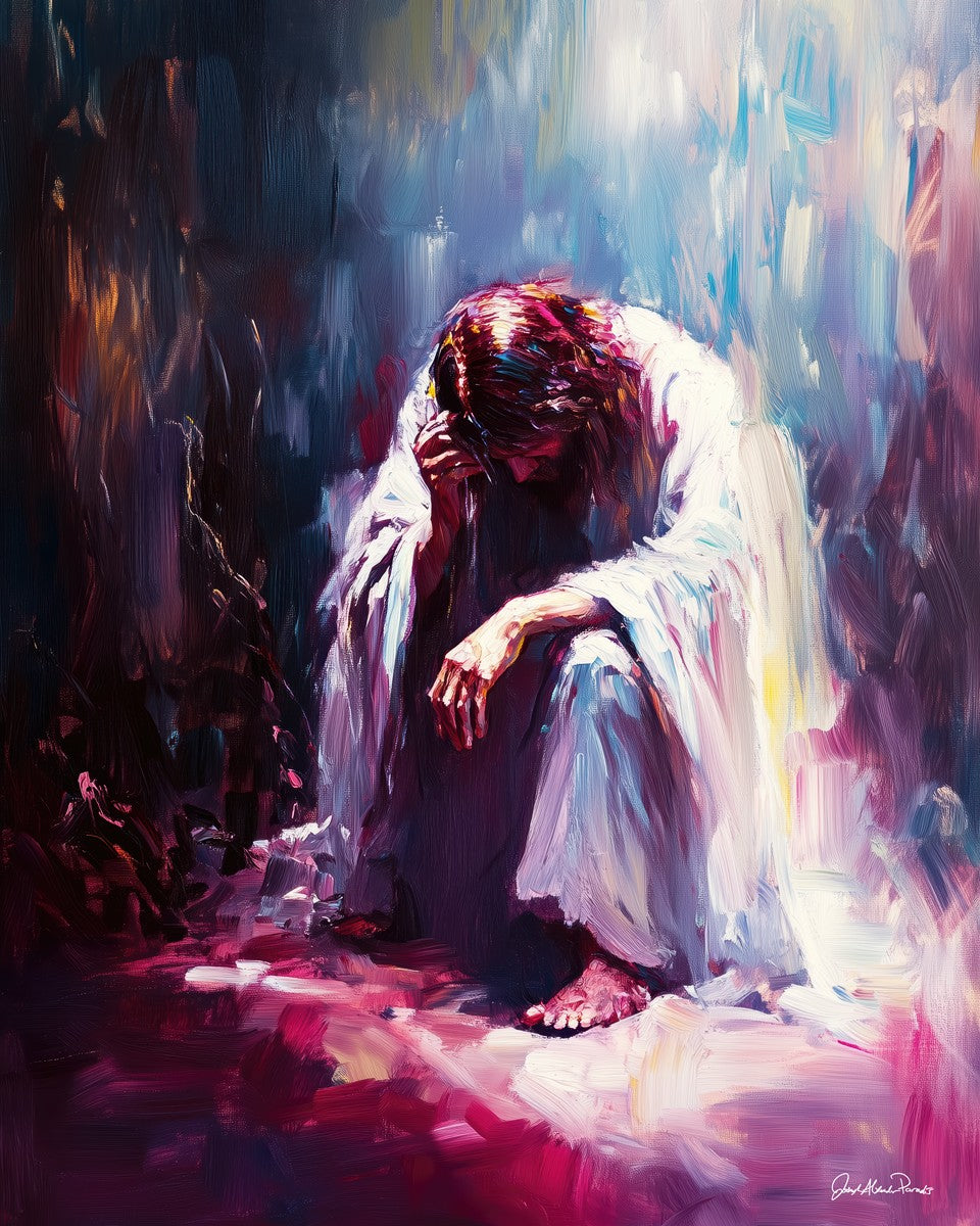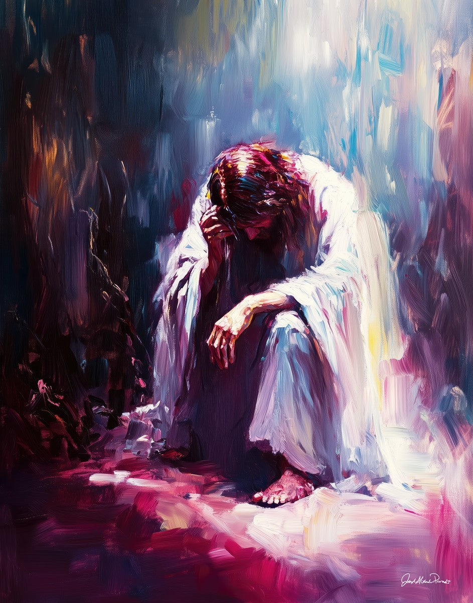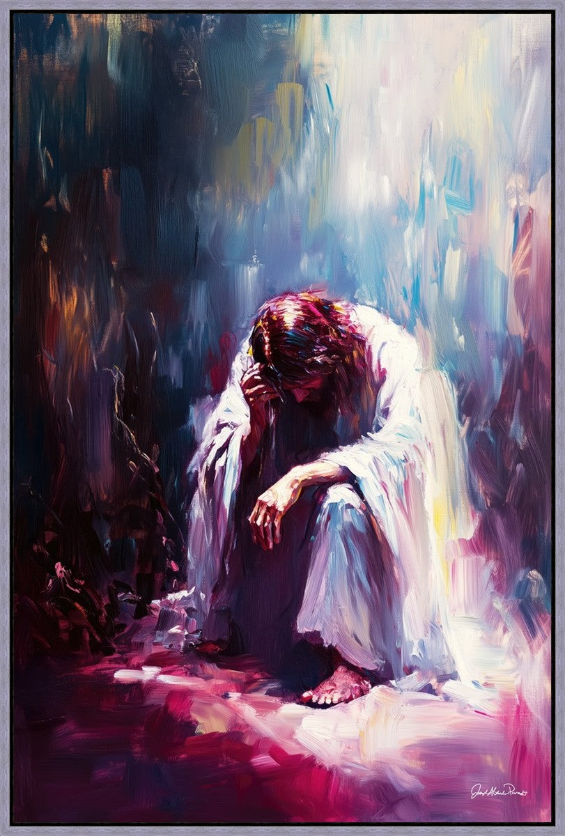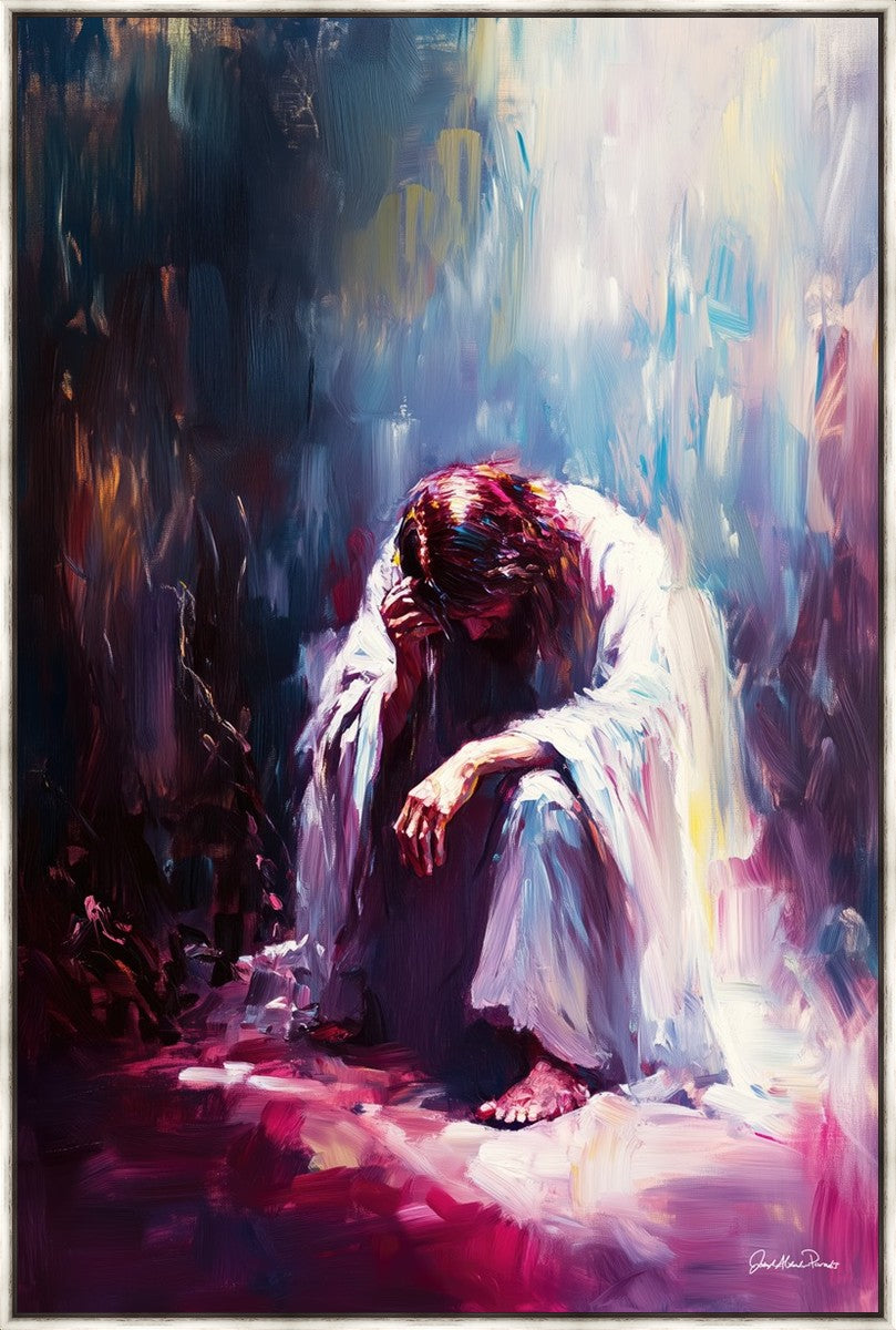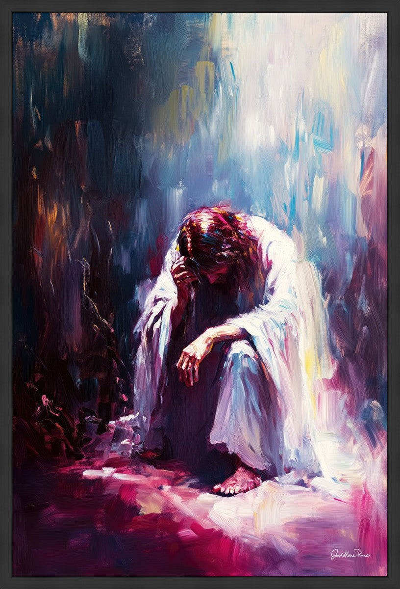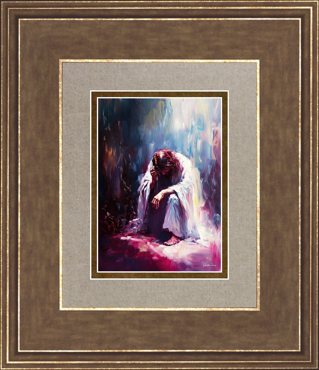 This artwork is a very intimate and poignant moment depicting the Lord resting between His miracle of performing the Atonement in the Garden of Gethsemane, having drunk from that bitter cup. It is a heartfelt reminder of what the Lord did for each of us, and is meant to invoke gratitude for His ultimate act of charity.