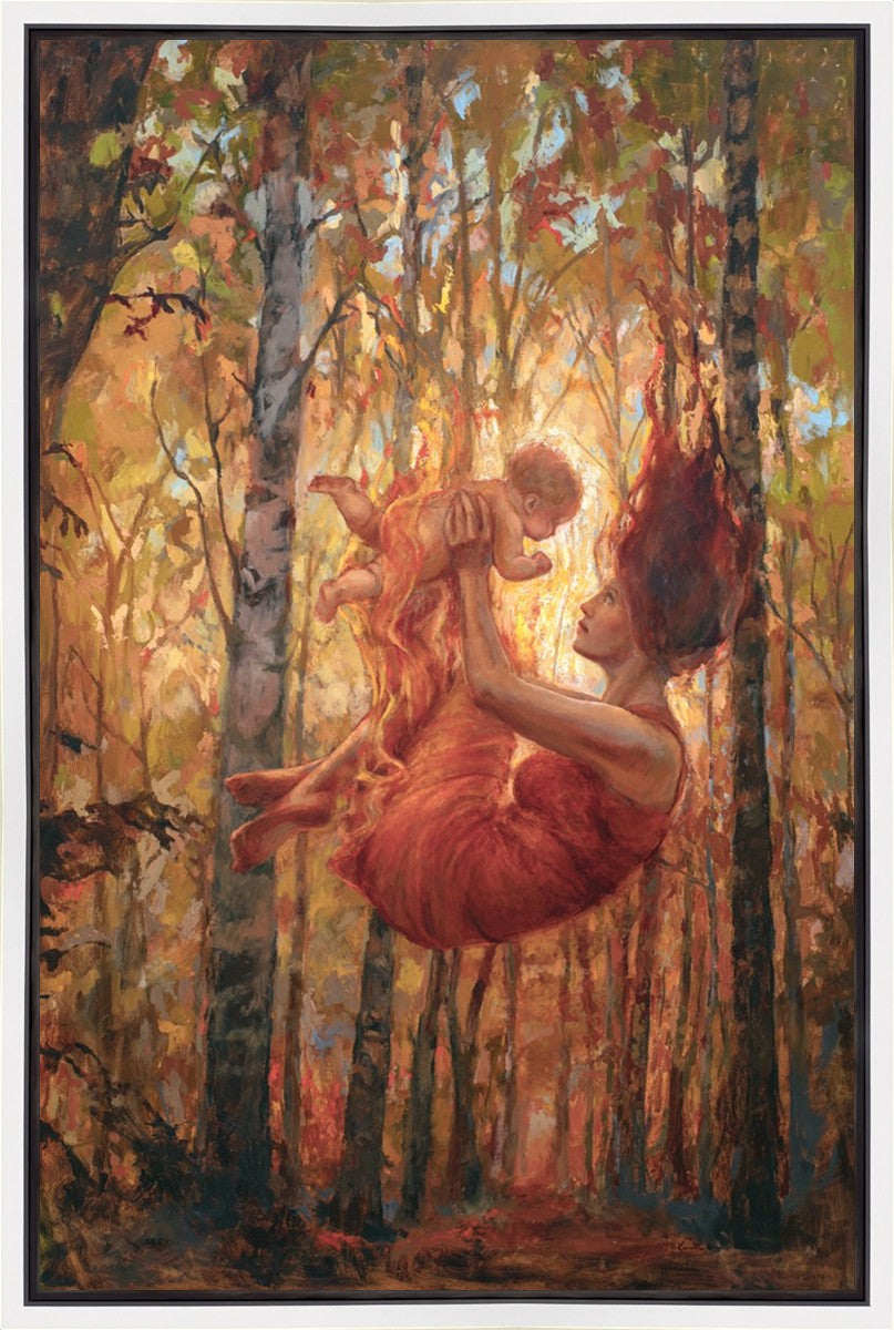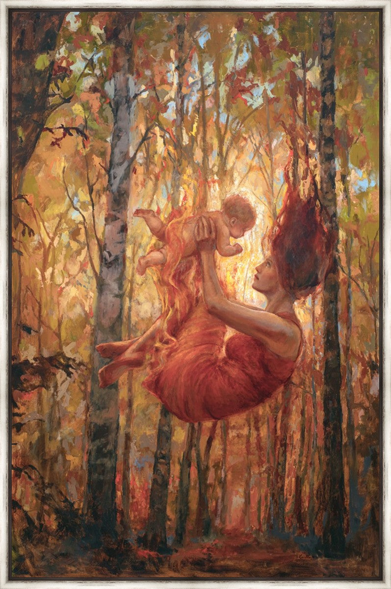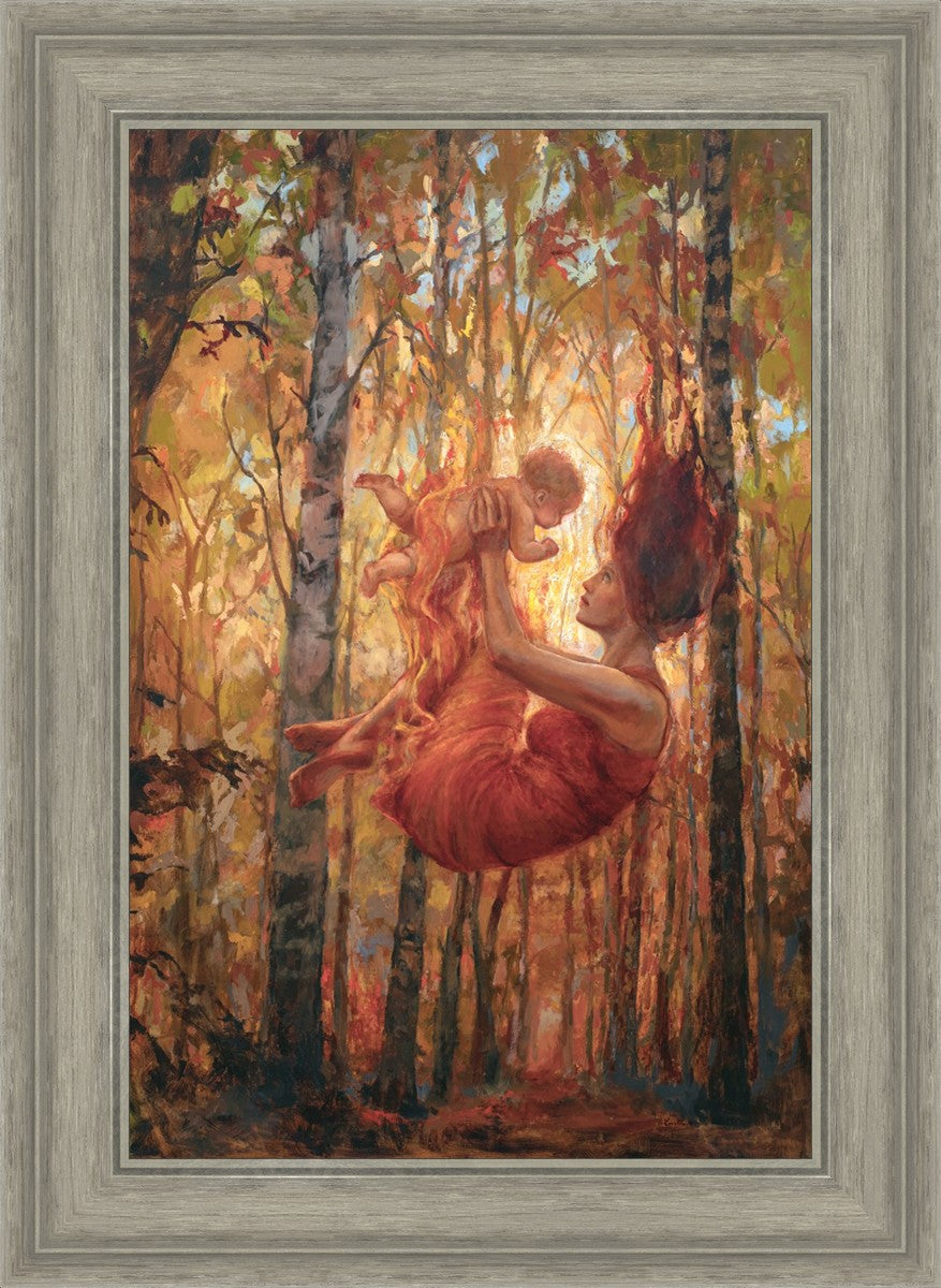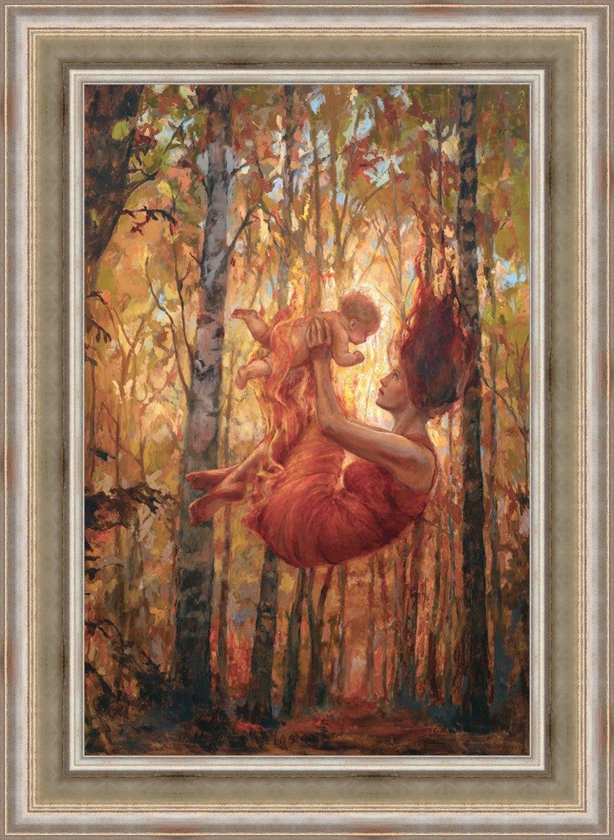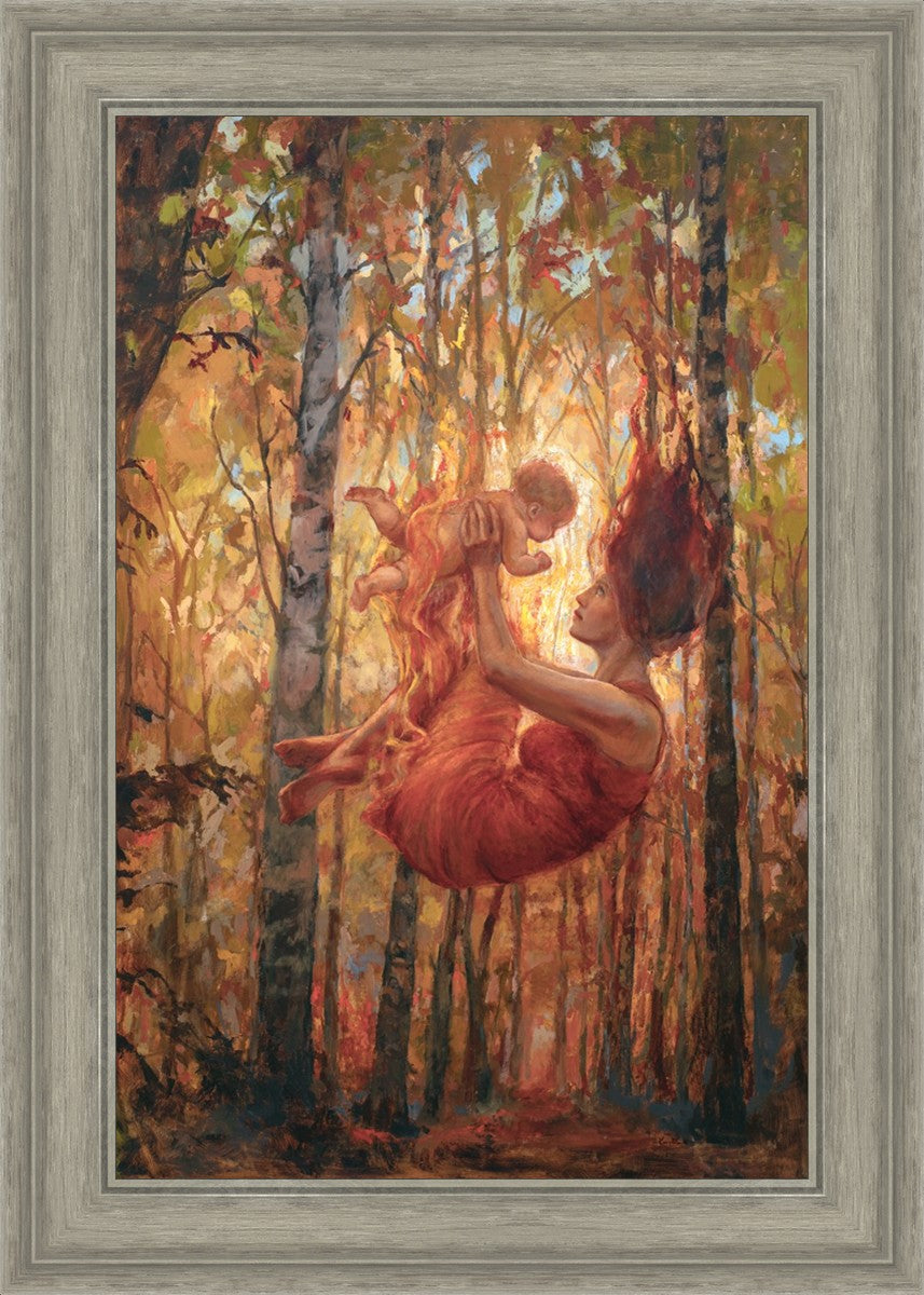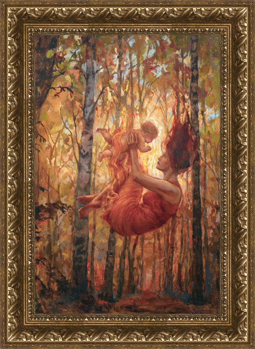 This woman represents Eve bringing all of humanity to earth. I set this fall of humankind in the season of fall. The season that reminds us of the beauty that can be found in change. The fire is a representation of the Holy Spirit or the presence of God. It is also an indication of the refiners fire that we will experience while during our mortality.