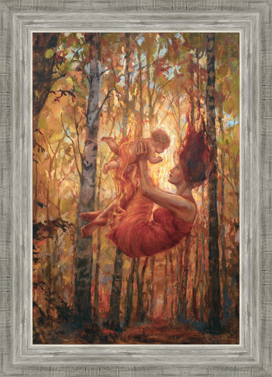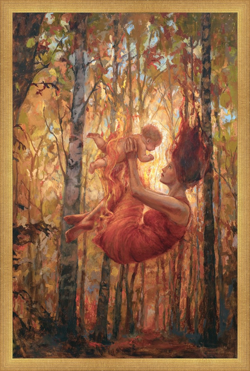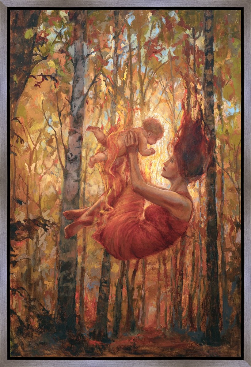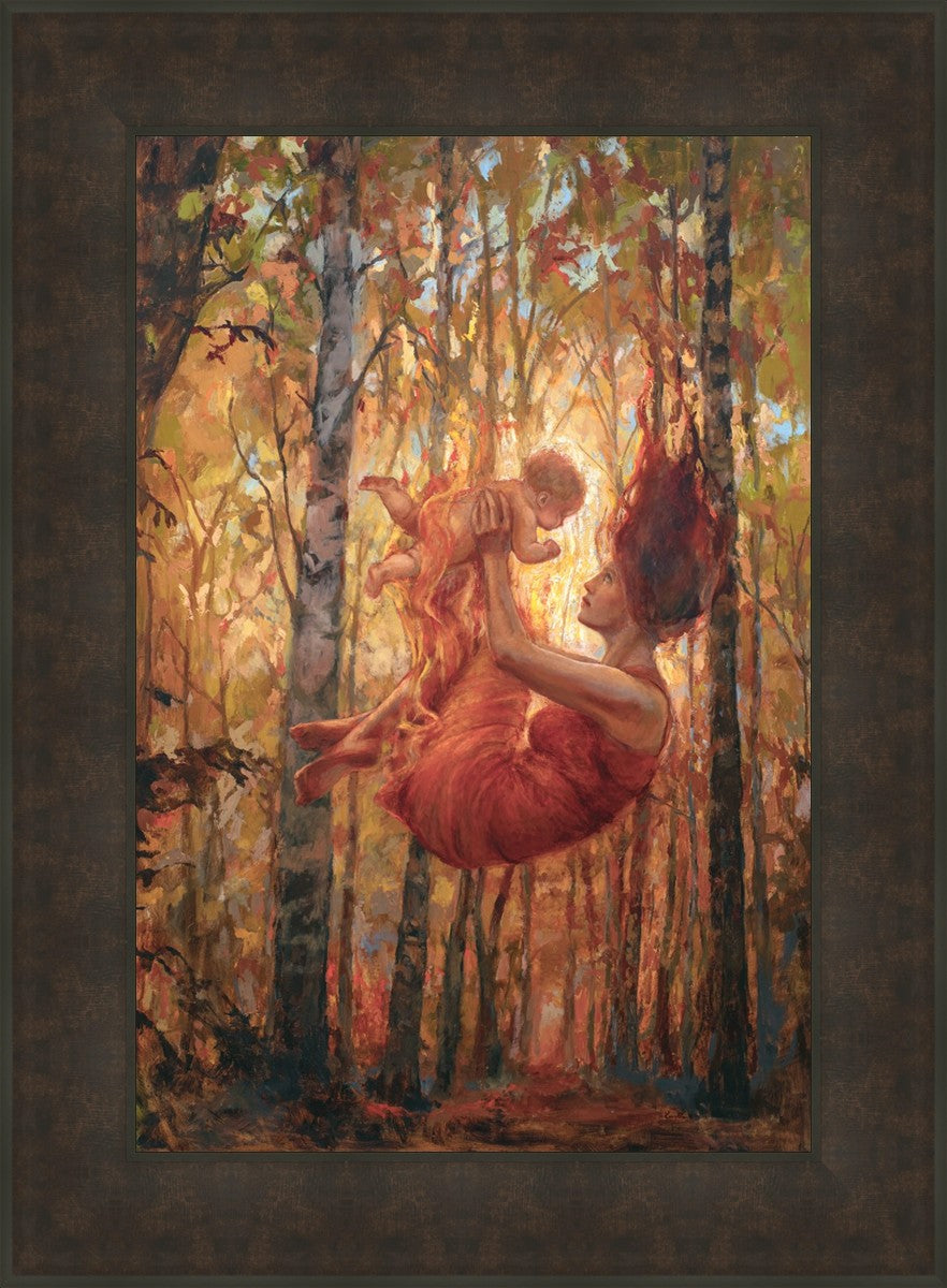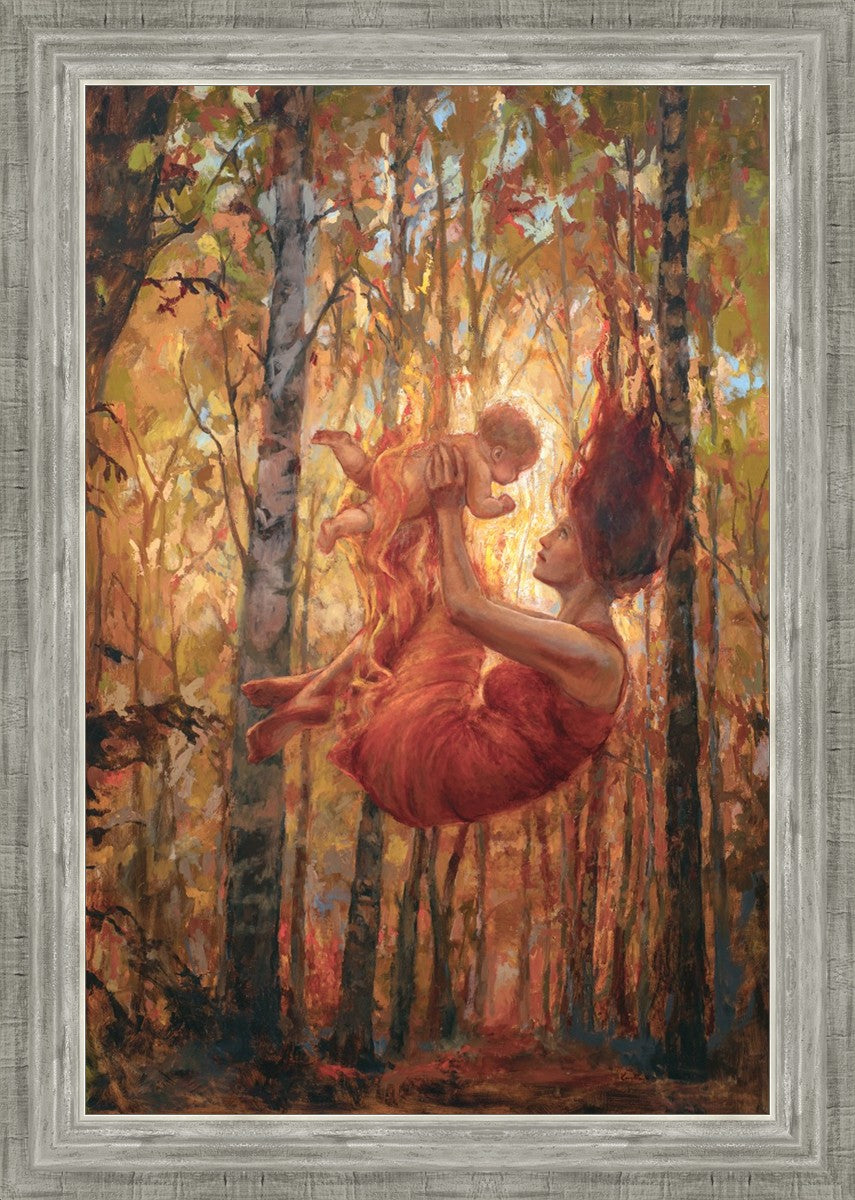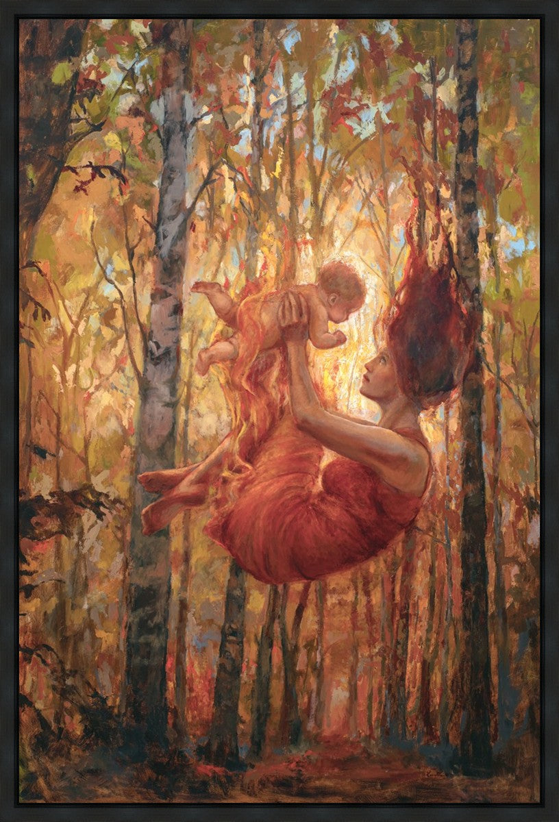 This woman represents Eve bringing all of humanity to earth. I set this fall of humankind in the season of fall. The season that reminds us of the beauty that can be found in change. The fire is a representation of the Holy Spirit or the presence of God. It is also an indication of the refiners fire that we will experience while during our mortality.