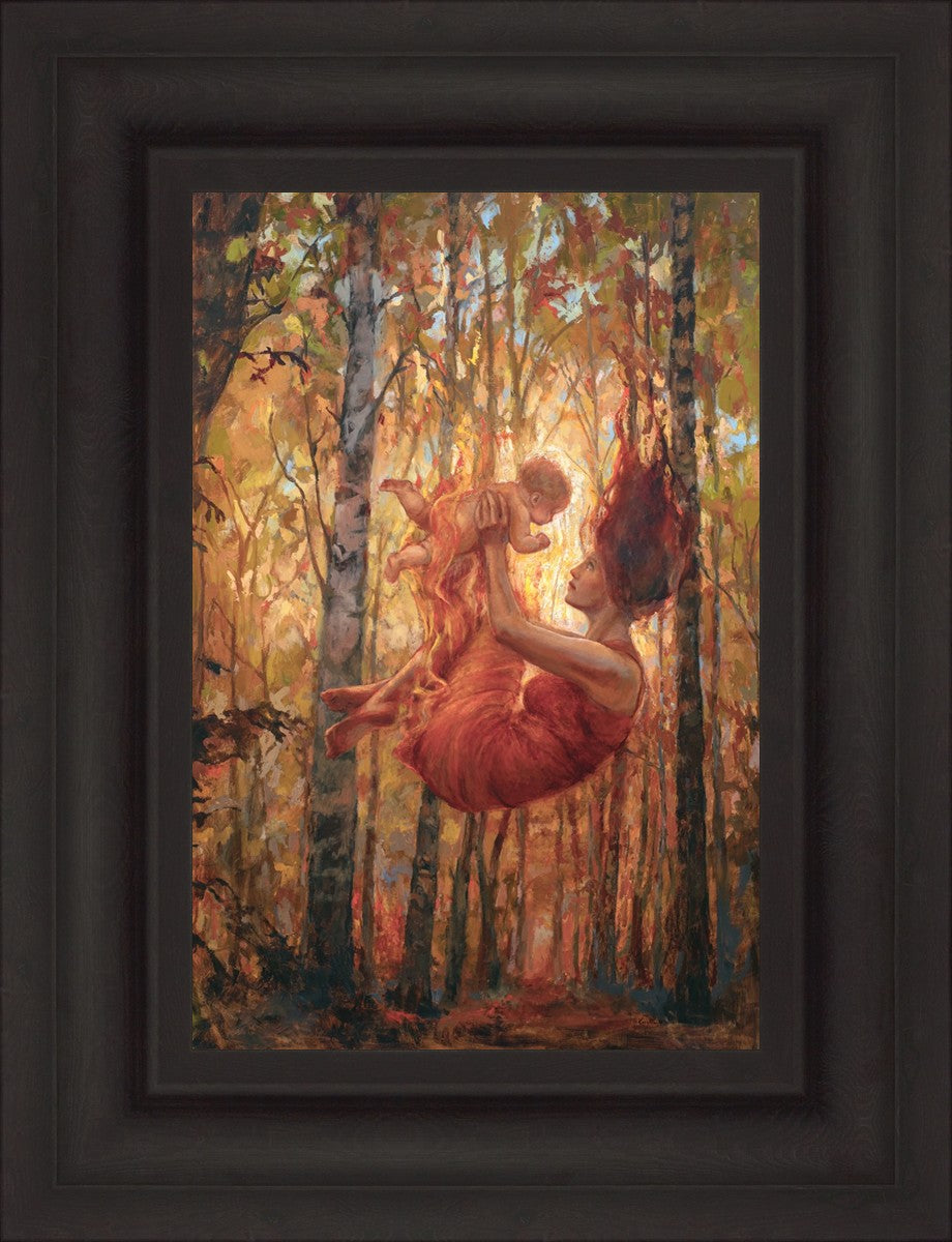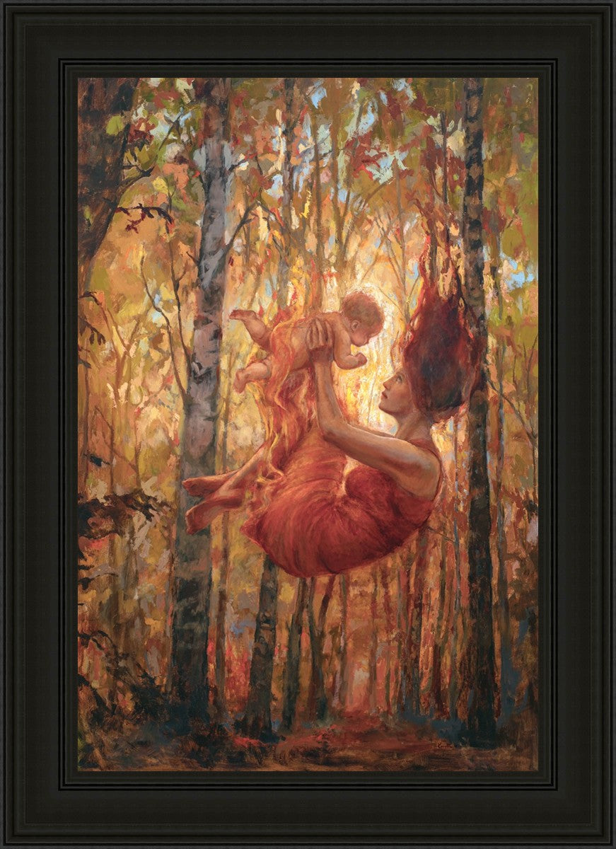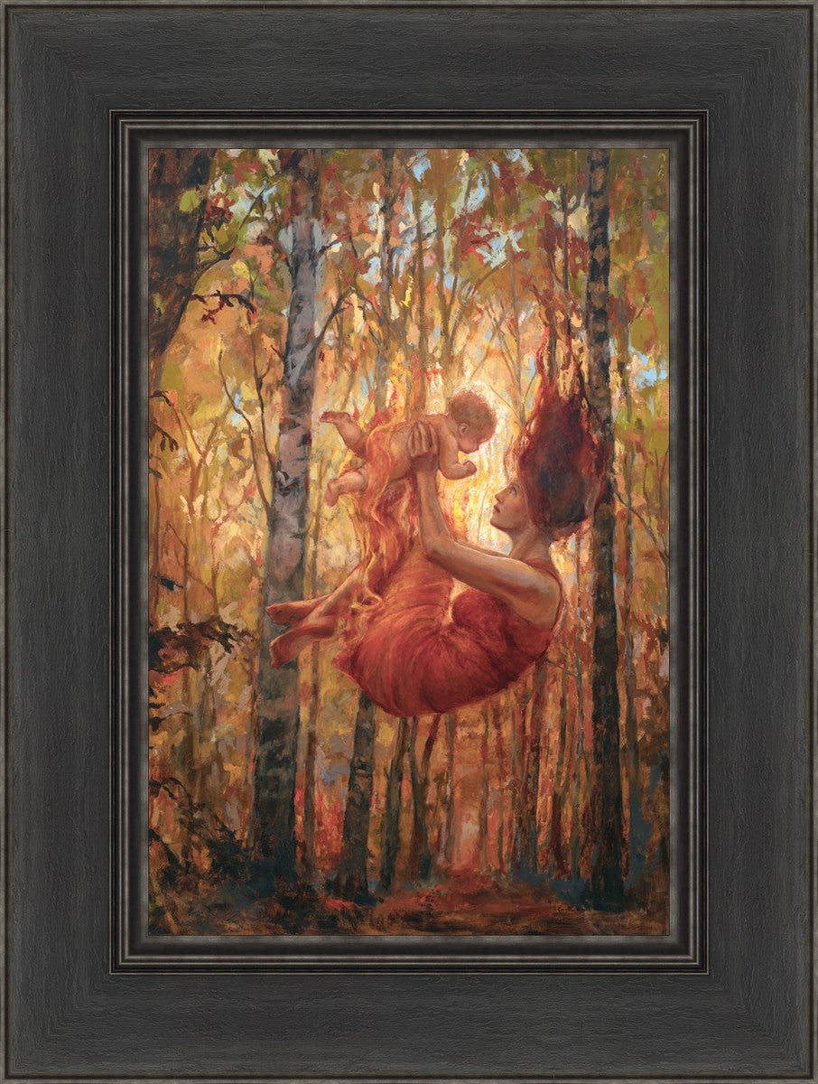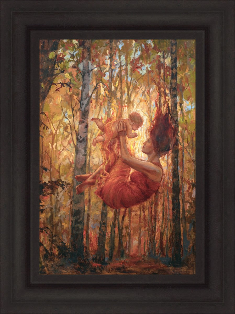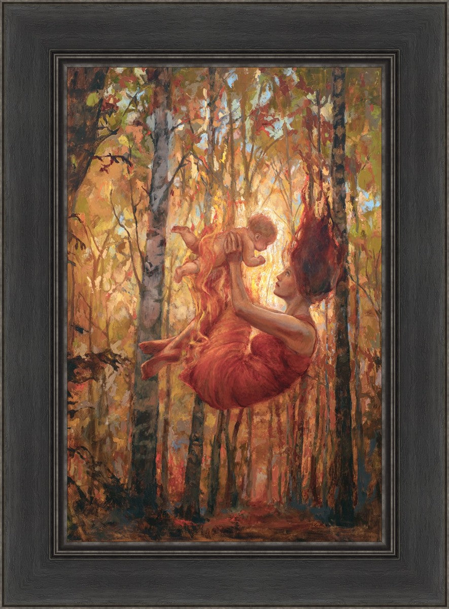 This woman represents Eve bringing all of humanity to earth. I set this fall of humankind in the season of fall. The season that reminds us of the beauty that can be found in change. The fire is a representation of the Holy Spirit or the presence of God. It is also an indication of the refiners fire that we will experience while during our mortality.