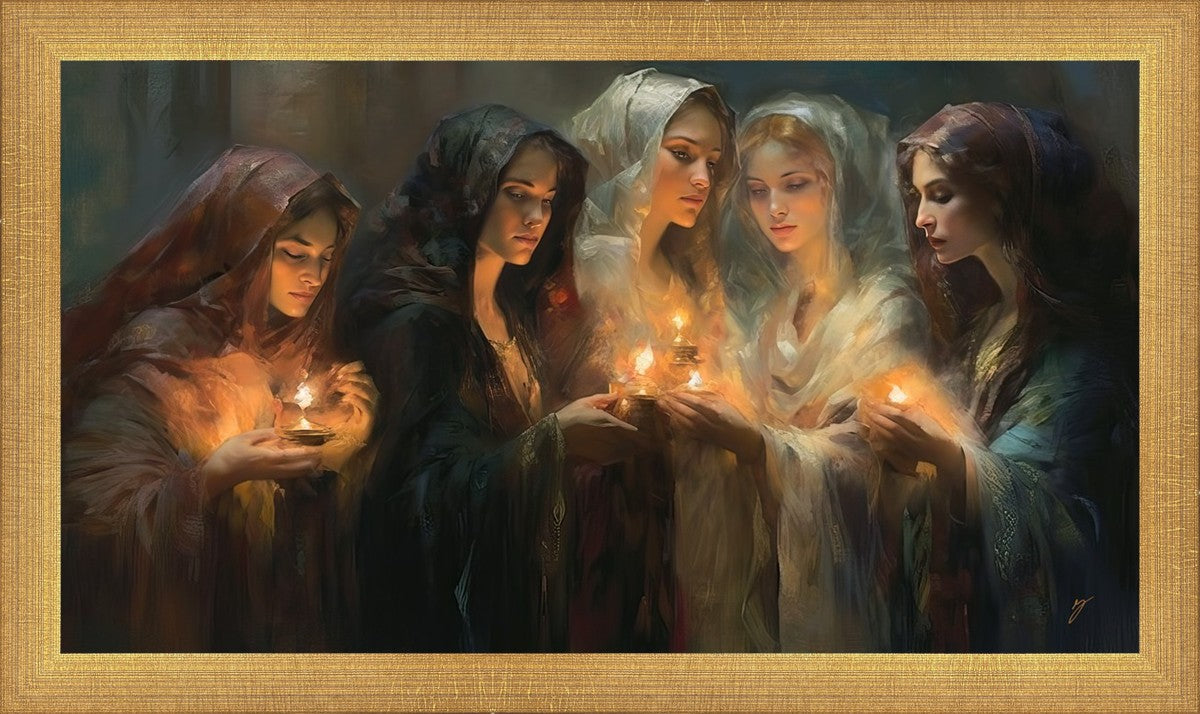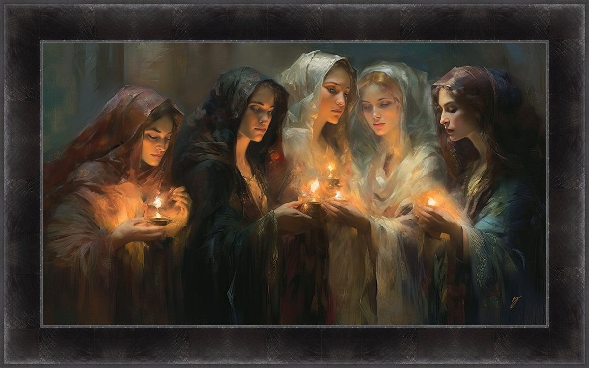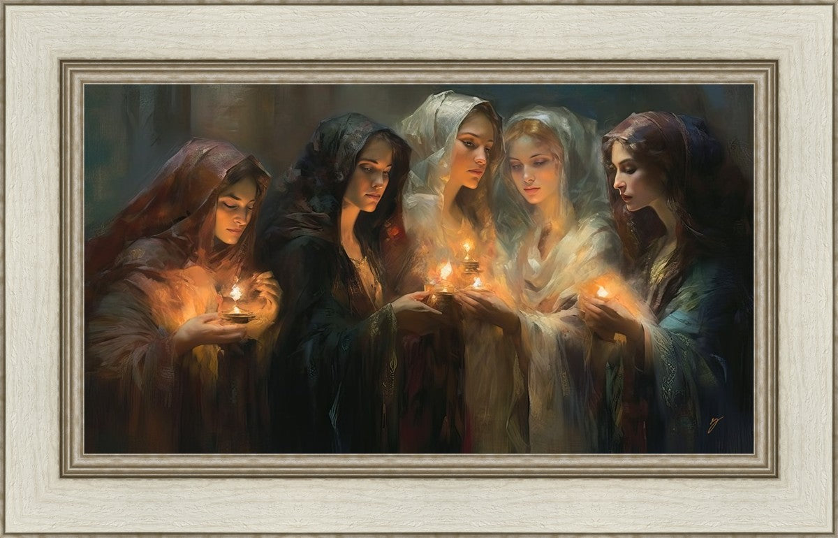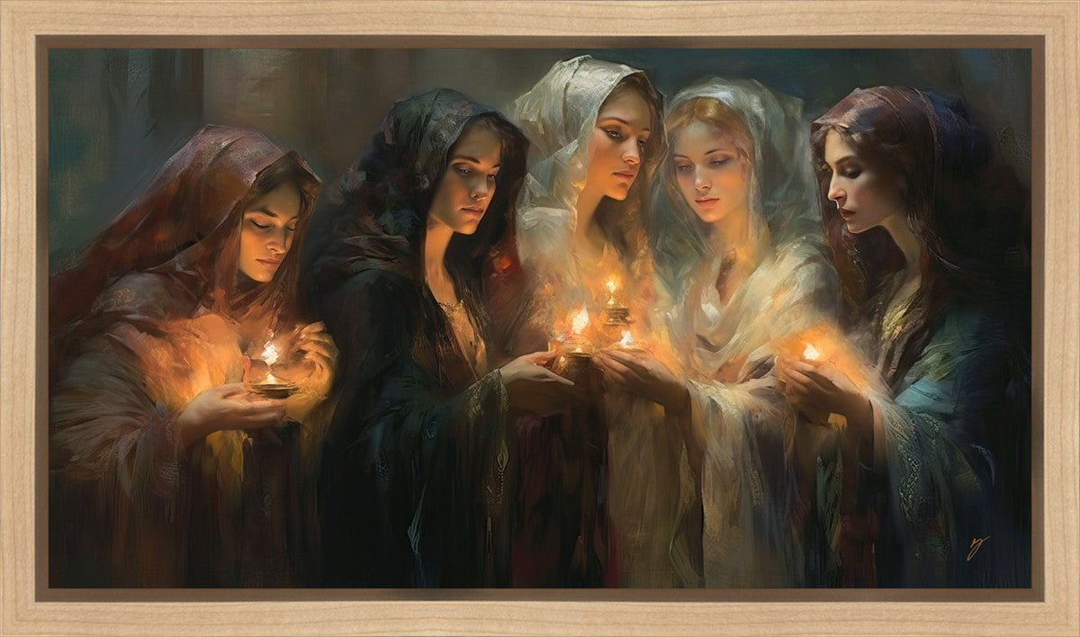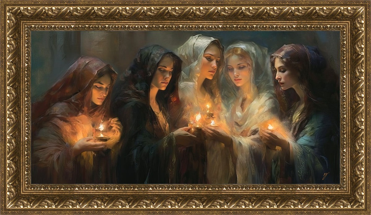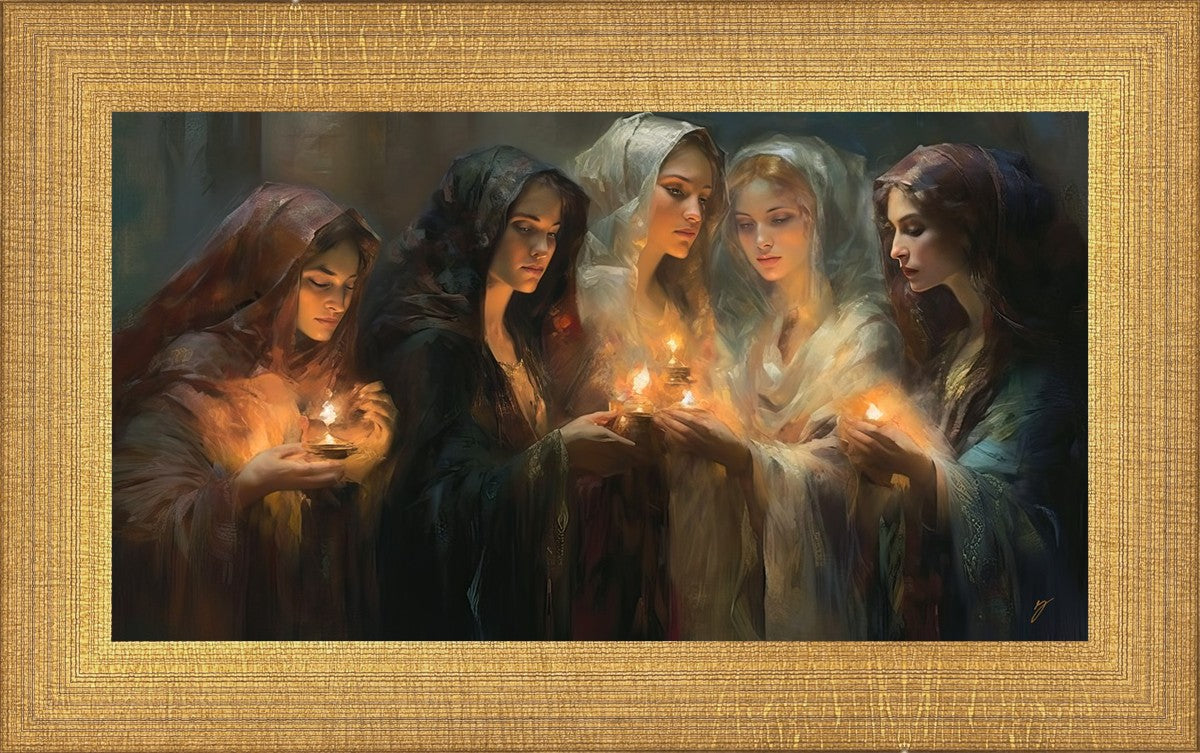"The Five Wise Virgins" painting captures the essence of the parable found in Matthew 25:1-13. The five wise virgins had prepared themselves for the bridegroom's coming by keeping their lamps trimmed and lit. When the call went out to meet him, they were ready and entered into the wedding feast. The painting portrays the five virgins holding their lamps, and the light of the lamps shining brightly on their faces, representing their readiness and preparedness. It's a beautiful reminder that we must always be prepared for the Second Coming of Christ, to be watchful and alert, so that we too may enter into the heavenly banquet.