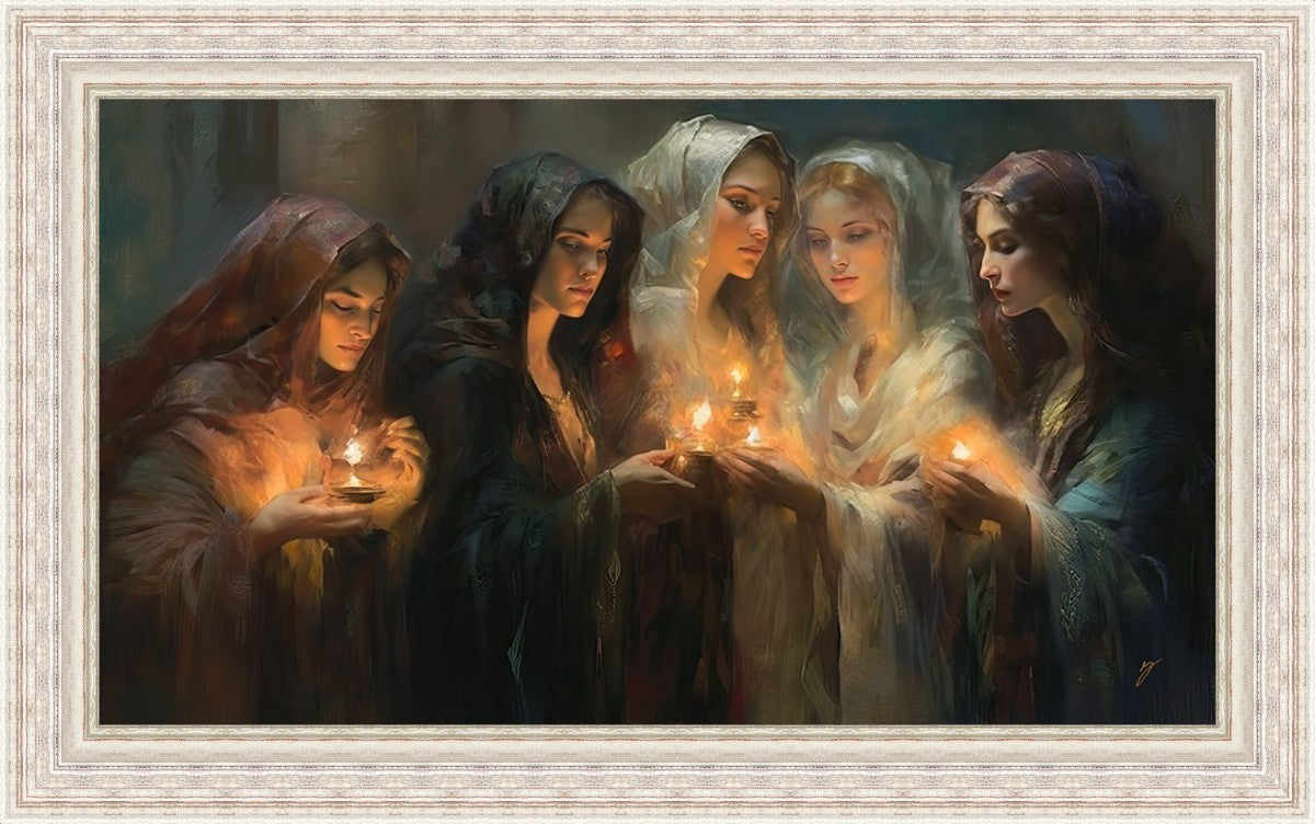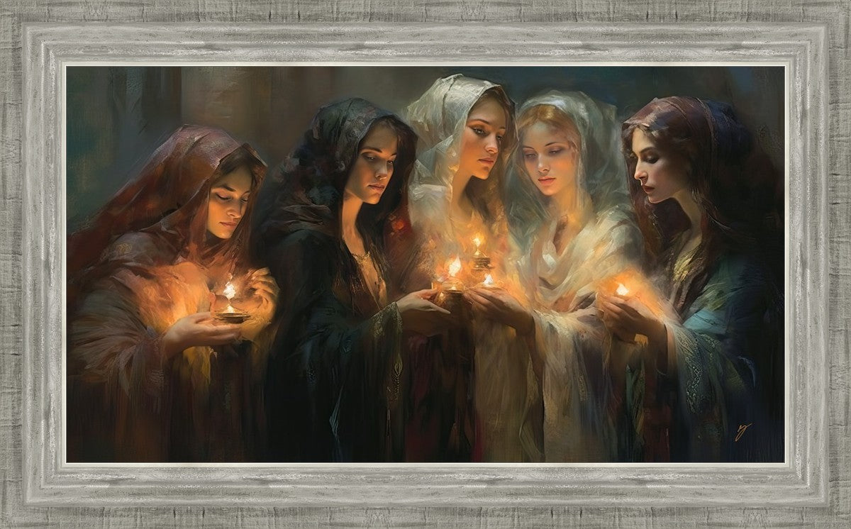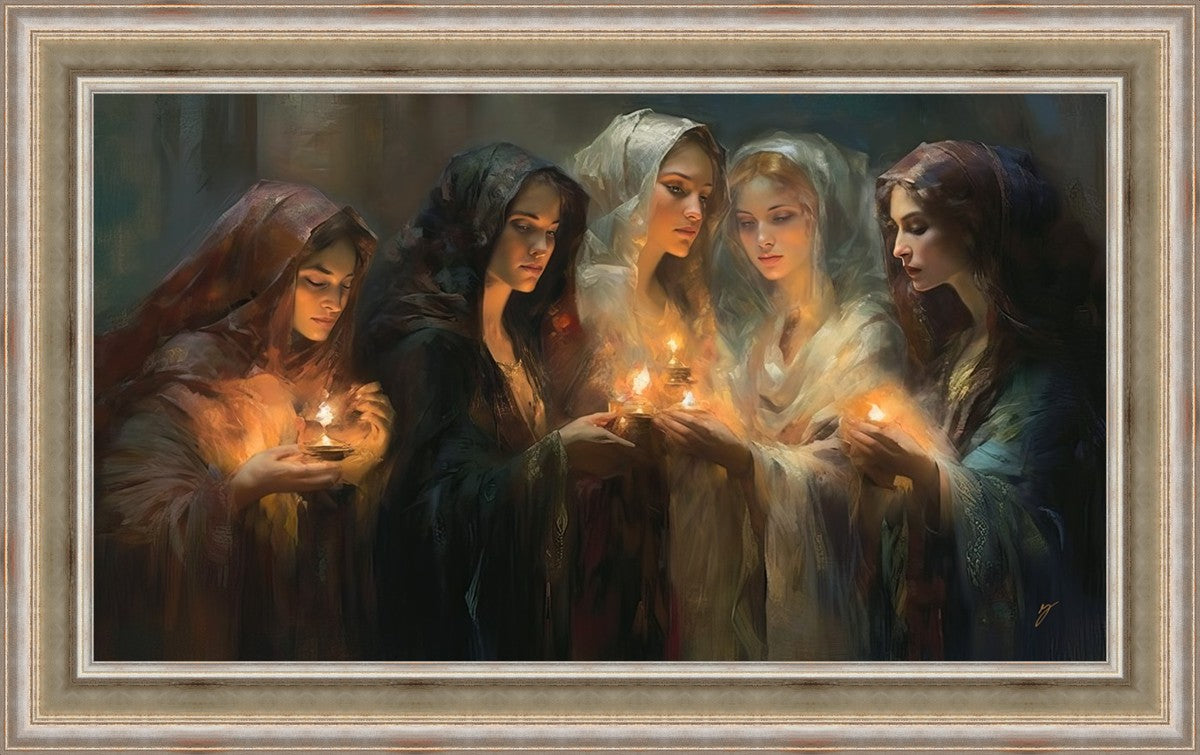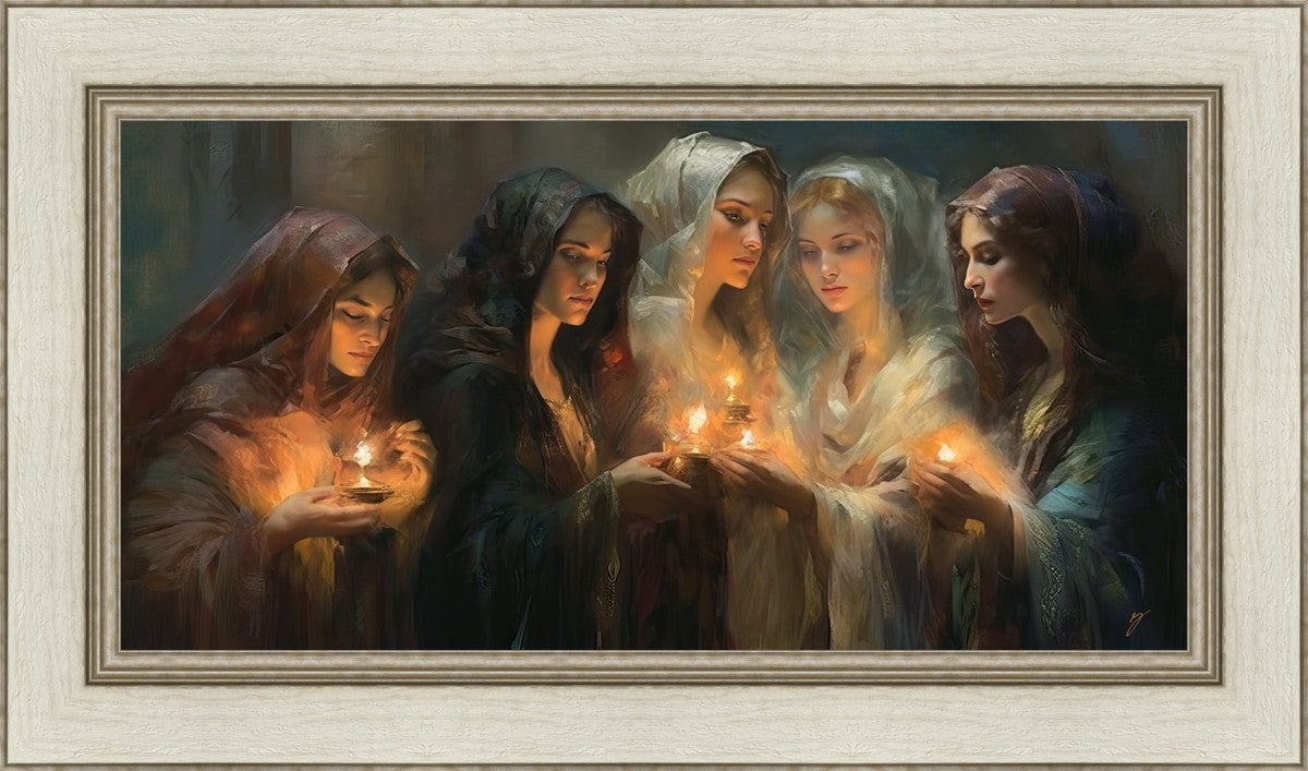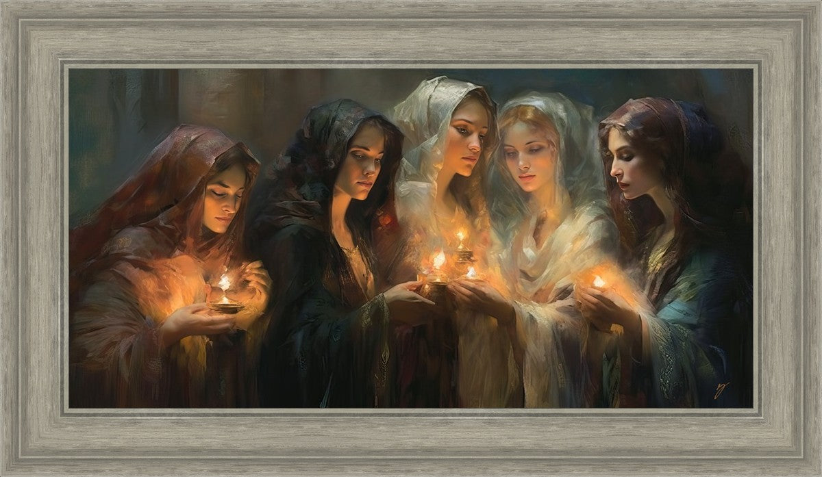 "The Five Wise Virgins" painting captures the essence of the parable found in Matthew 25:1-13. The five wise virgins had prepared themselves for the bridegroom's coming by keeping their lamps trimmed and lit. When the call went out to meet him, they were ready and entered into the wedding feast. The painting portrays the five virgins holding their lamps, and the light of the lamps shining brightly on their faces, representing their readiness and preparedness. It's a beautiful reminder that we must always be prepared for the Second Coming of Christ, to be watchful and alert, so that we too may enter into the heavenly banquet.