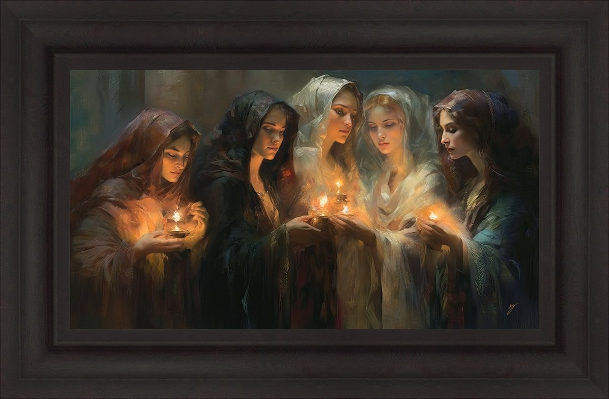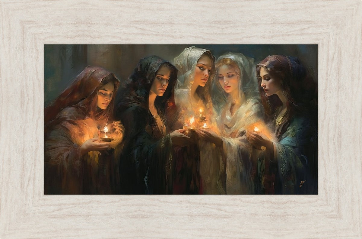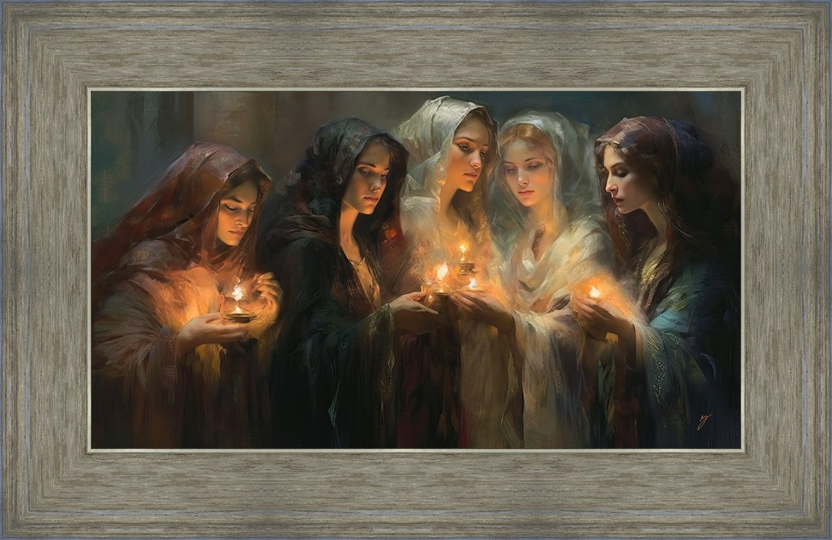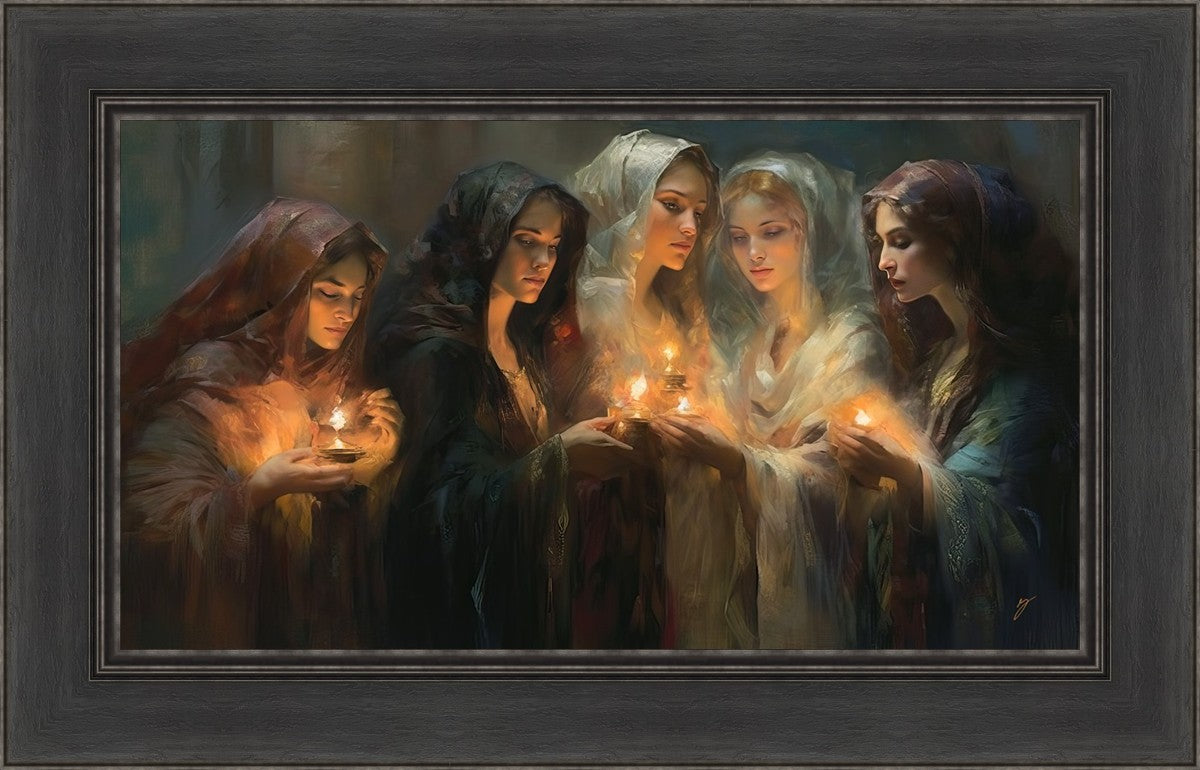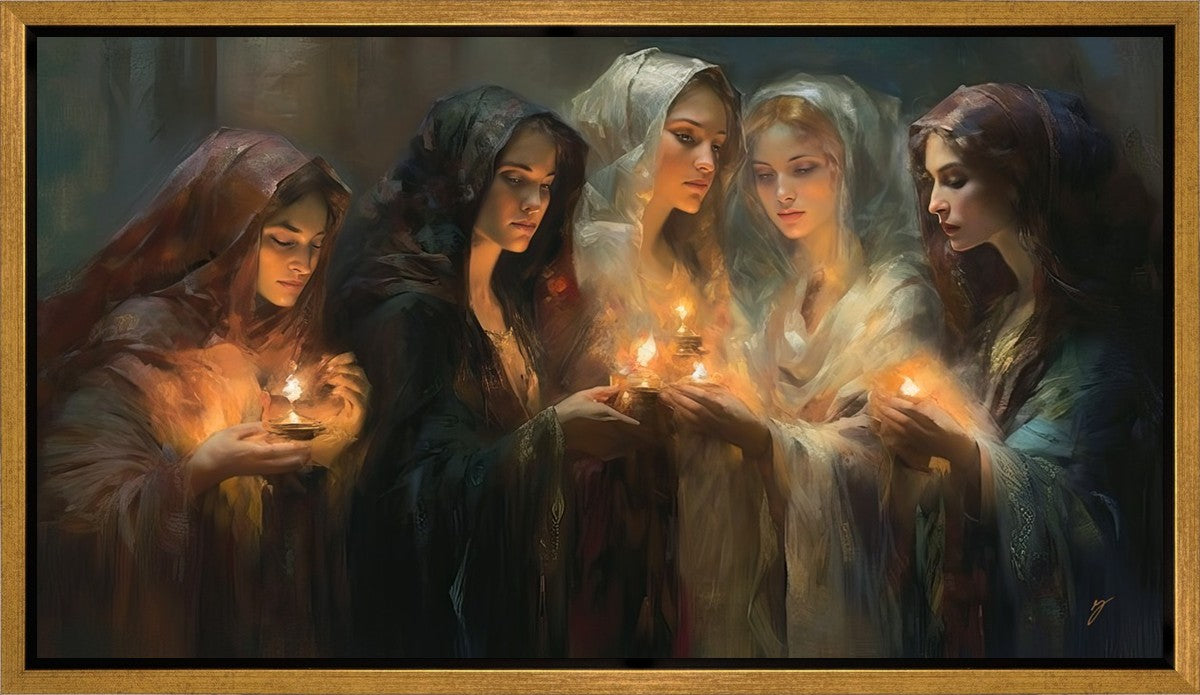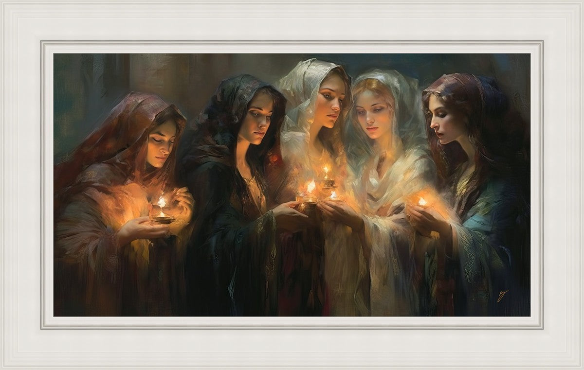 "The Five Wise Virgins" painting captures the essence of the parable found in Matthew 25:1-13. The five wise virgins had prepared themselves for the bridegroom's coming by keeping their lamps trimmed and lit. When the call went out to meet him, they were ready and entered into the wedding feast. The painting portrays the five virgins holding their lamps, and the light of the lamps shining brightly on their faces, representing their readiness and preparedness. It's a beautiful reminder that we must always be prepared for the Second Coming of Christ, to be watchful and alert, so that we too may enter into the heavenly banquet.