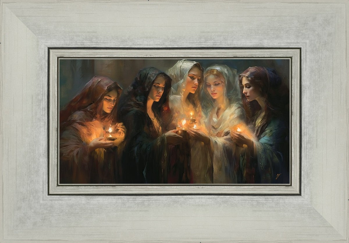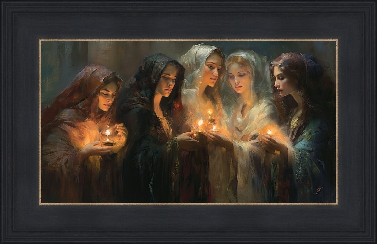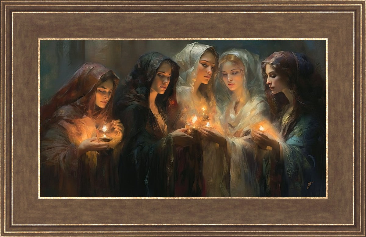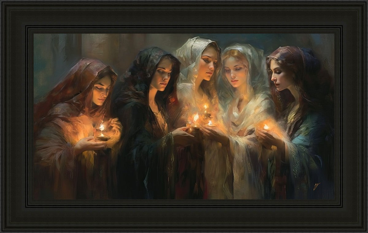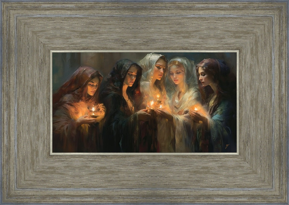 "The Five Wise Virgins" painting captures the essence of the parable found in Matthew 25:1-13. The five wise virgins had prepared themselves for the bridegroom's coming by keeping their lamps trimmed and lit. When the call went out to meet him, they were ready and entered into the wedding feast. The painting portrays the five virgins holding their lamps, and the light of the lamps shining brightly on their faces, representing their readiness and preparedness. It's a beautiful reminder that we must always be prepared for the Second Coming of Christ, to be watchful and alert, so that we too may enter into the heavenly banquet.