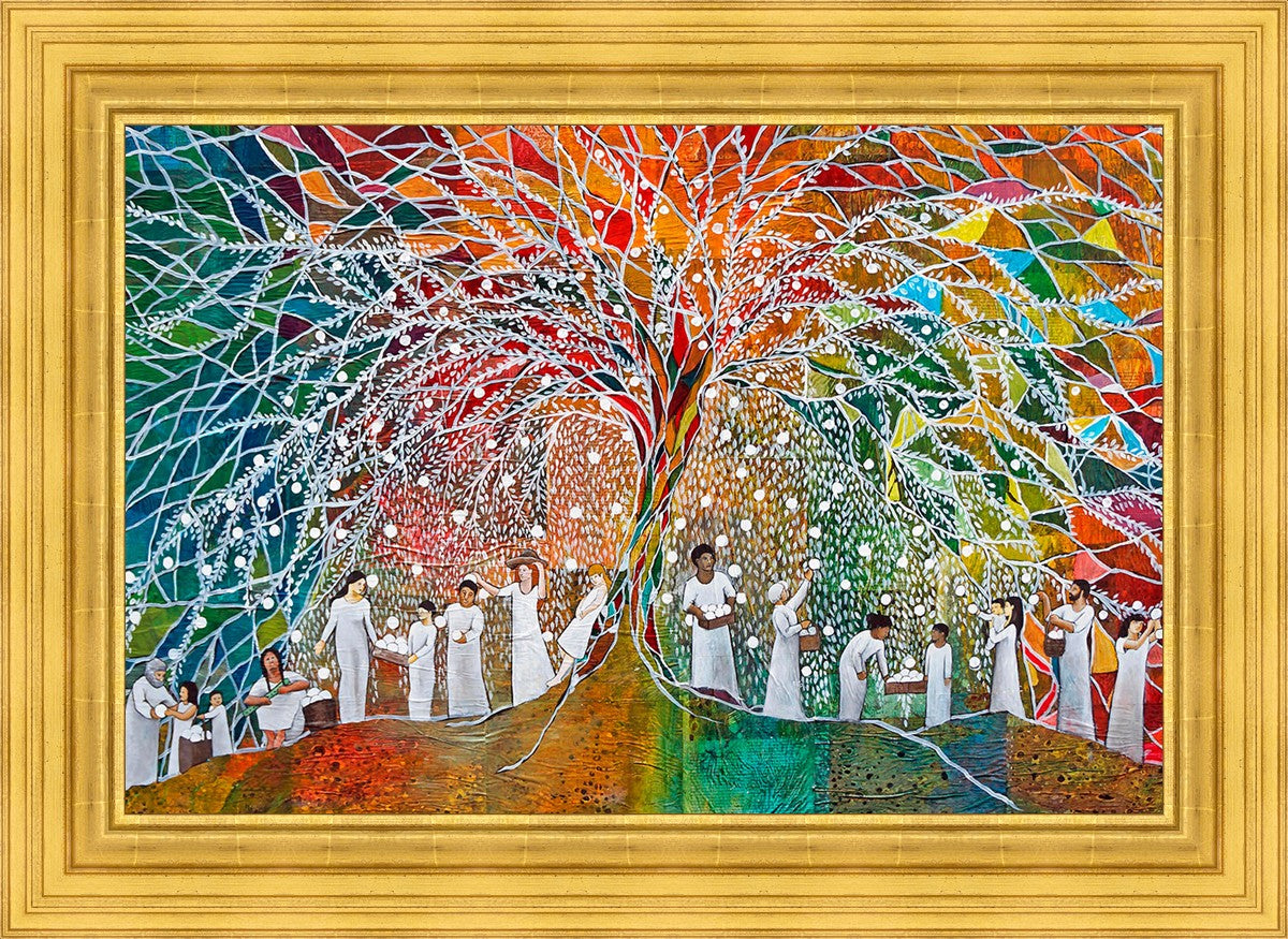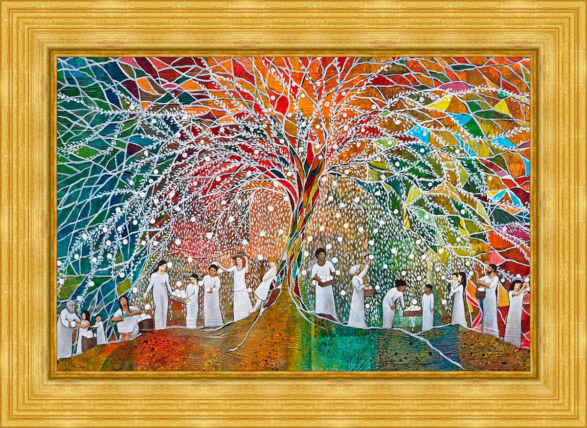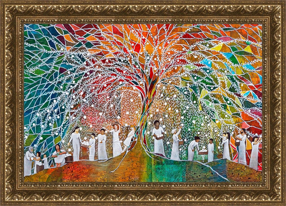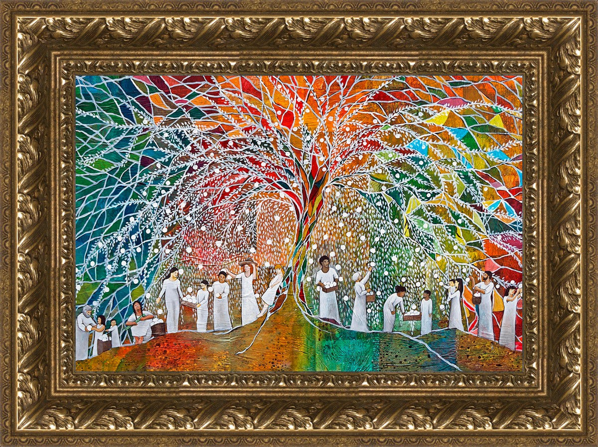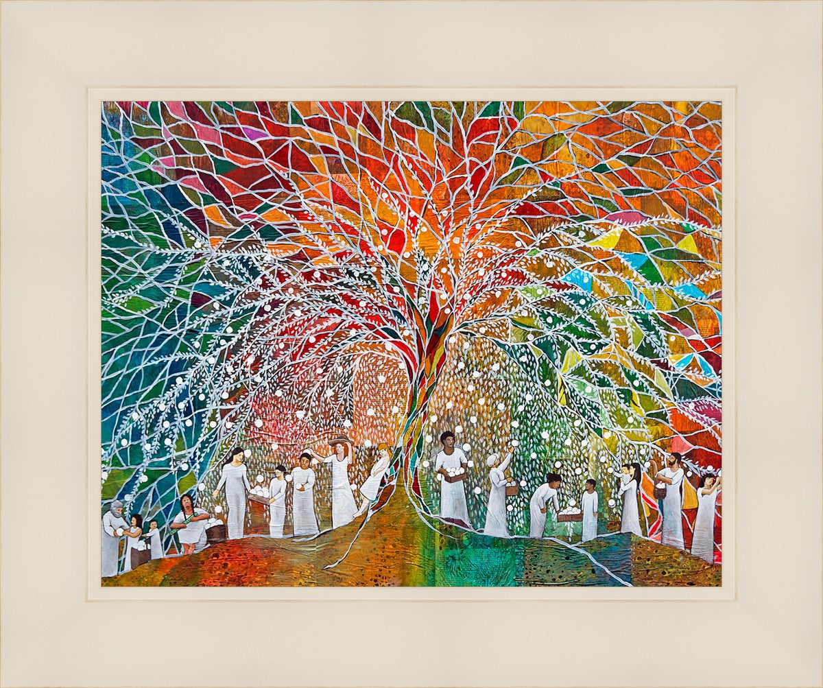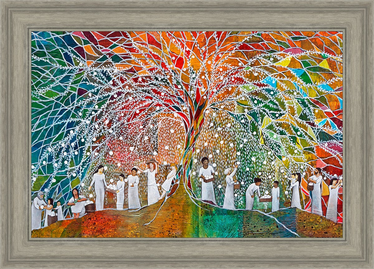 “All are alike unto God,”--I chose to address this concept on a cultural level, attempting to address the pain that racism causes many individuals. The tree and its fruit represent the love of God, and people from different races collect the glowing orbs. The snowy branches of the tree provide a framework for a myriad of colors. To me, these rainbow shards represent God’s excitement and awareness in creating diversity, and that all the colors must work together for optimal beauty. Only when all of the colors of the rainbow are combined does white appear--the hue representing purity and peace.The tree is large and all-encompassing, providing and making room for any who desire to approach and gather. God’s love extends to all of His children, and He gives us the opportunity not only to partake of His love, but to share its abundance.