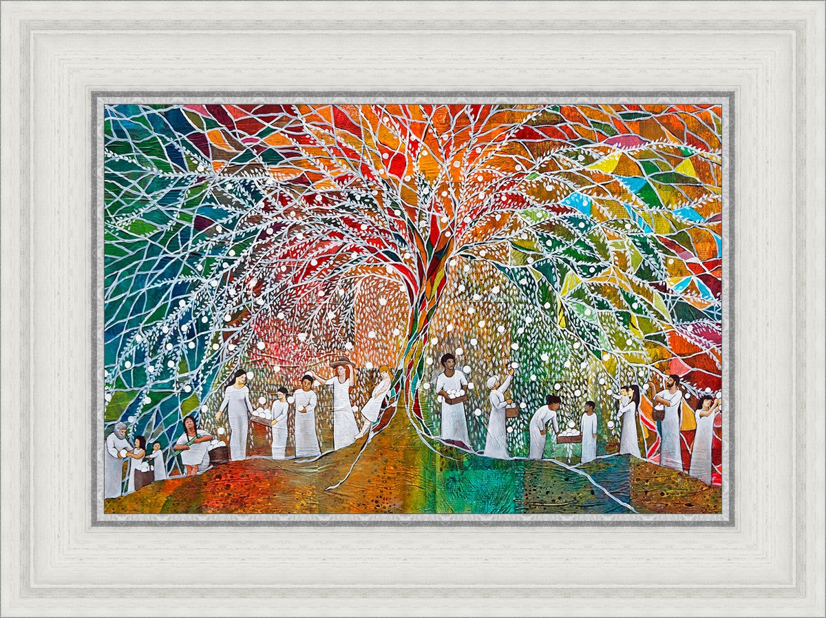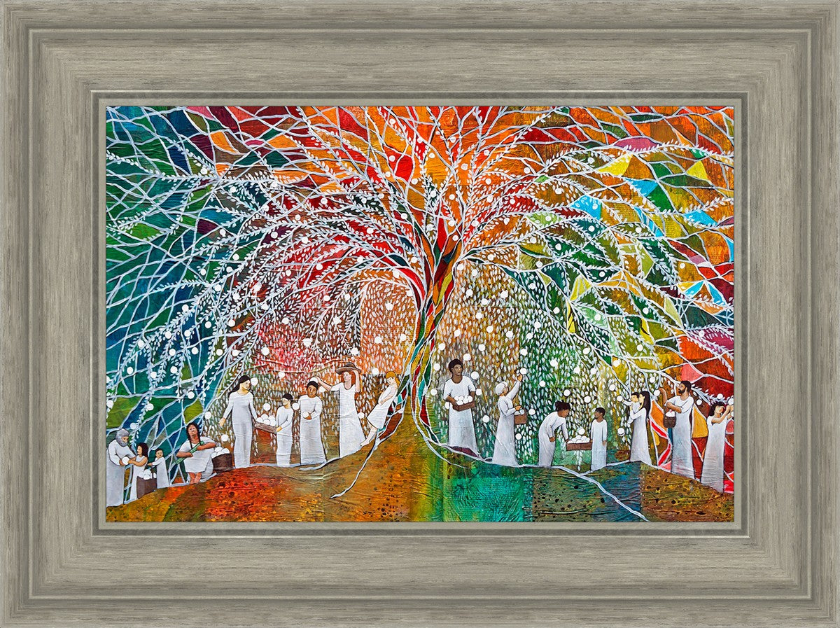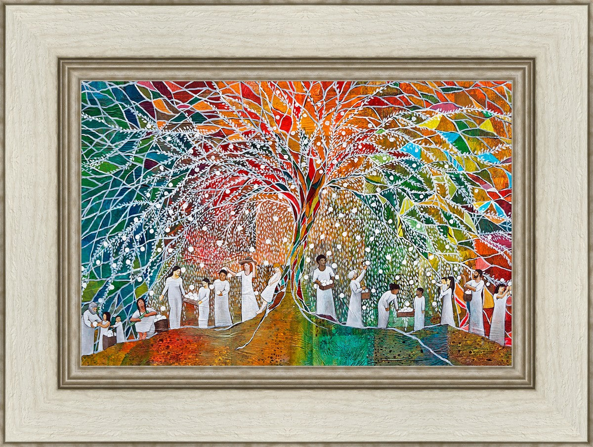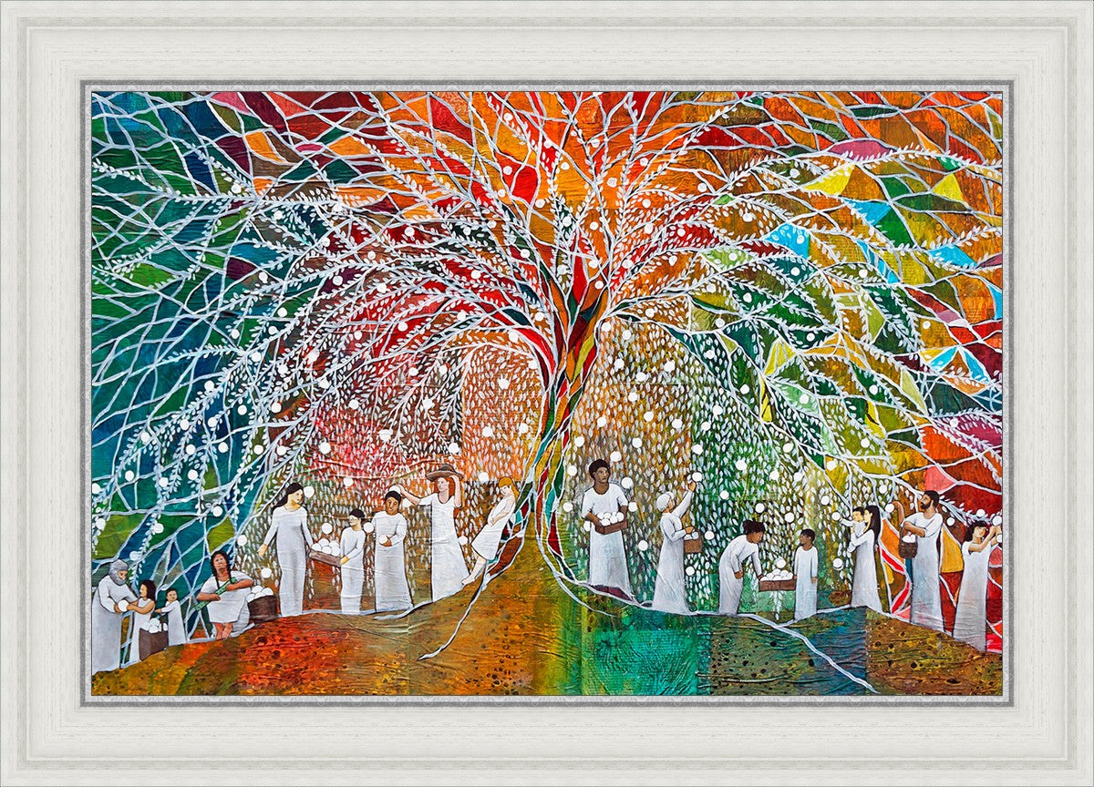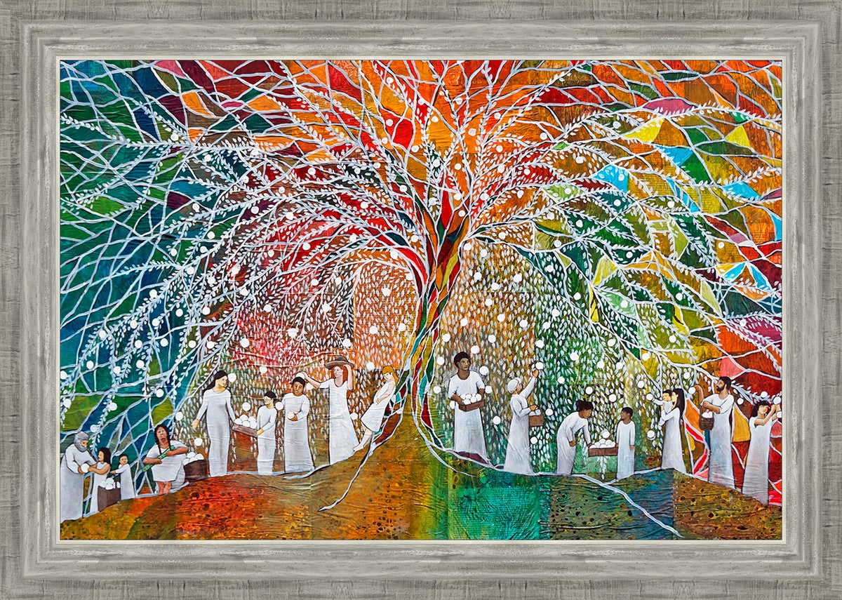 “All are alike unto God,”--I chose to address this concept on a cultural level, attempting to address the pain that racism causes many individuals. The tree and its fruit represent the love of God, and people from different races collect the glowing orbs. The snowy branches of the tree provide a framework for a myriad of colors. To me, these rainbow shards represent God’s excitement and awareness in creating diversity, and that all the colors must work together for optimal beauty. Only when all of the colors of the rainbow are combined does white appear--the hue representing purity and peace.The tree is large and all-encompassing, providing and making room for any who desire to approach and gather. God’s love extends to all of His children, and He gives us the opportunity not only to partake of His love, but to share its abundance.