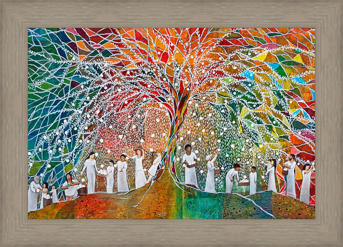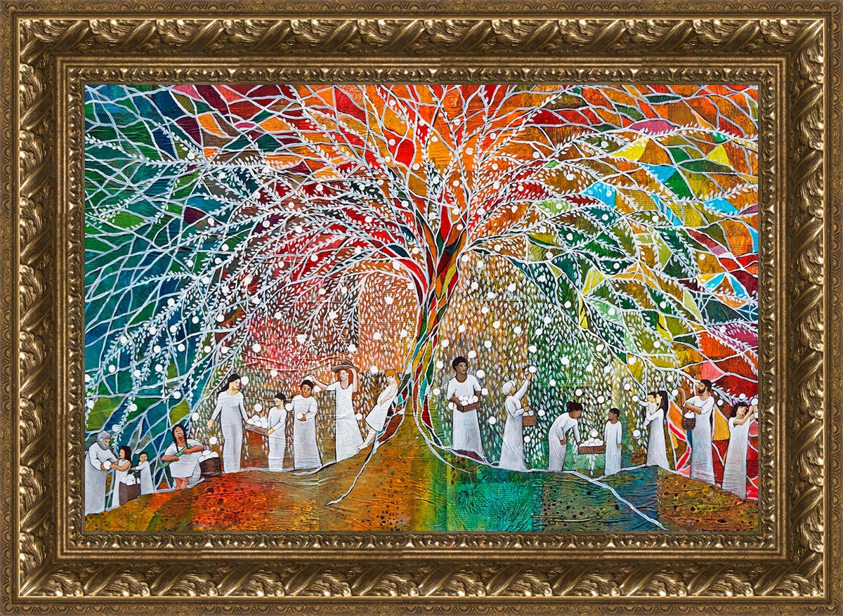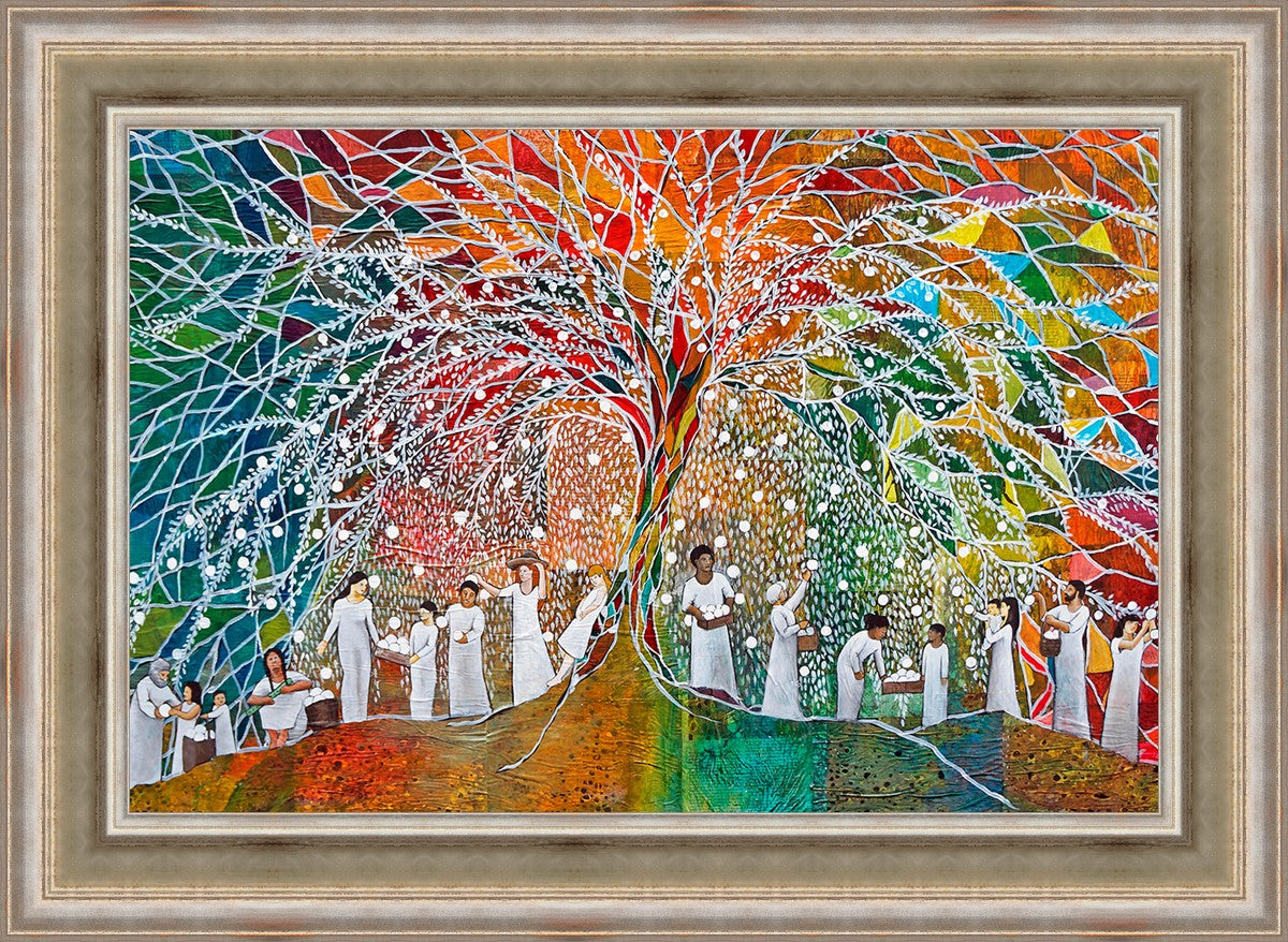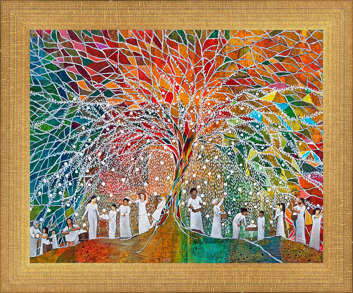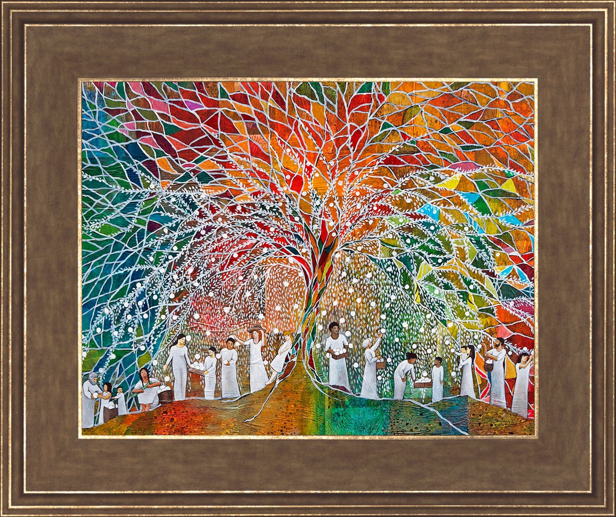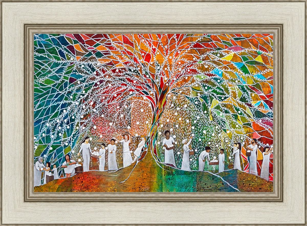 “All are alike unto God,”--I chose to address this concept on a cultural level, attempting to address the pain that racism causes many individuals. The tree and its fruit represent the love of God, and people from different races collect the glowing orbs. The snowy branches of the tree provide a framework for a myriad of colors. To me, these rainbow shards represent God’s excitement and awareness in creating diversity, and that all the colors must work together for optimal beauty. Only when all of the colors of the rainbow are combined does white appear--the hue representing purity and peace.The tree is large and all-encompassing, providing and making room for any who desire to approach and gather. God’s love extends to all of His children, and He gives us the opportunity not only to partake of His love, but to share its abundance.
